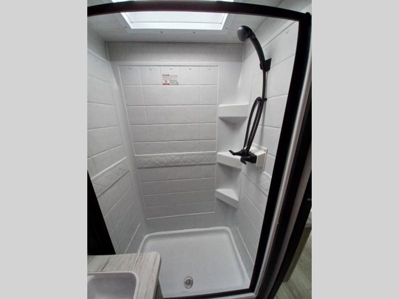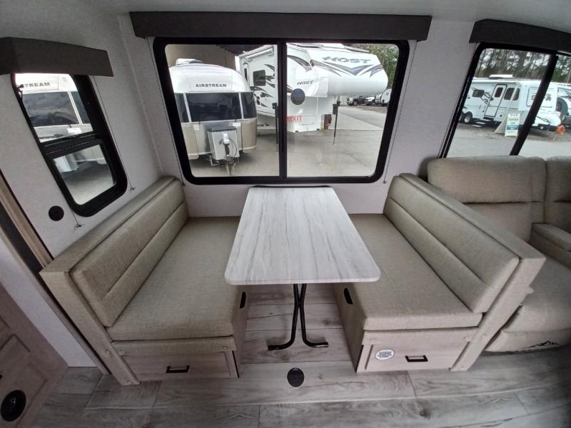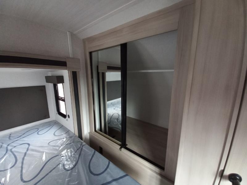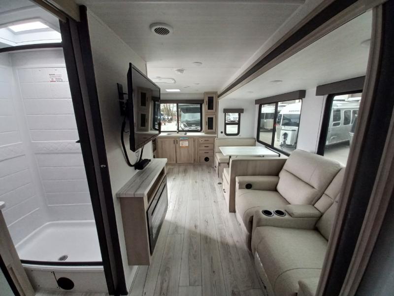 This travel trailer will feel just like home with its spacious interior and at-home comforts. Since there are dual entry doors, you can enter in through the front bedroom or the rear kitchen and living area. A king bed slide in the bedroom is sure to bring comfort, and there is a closet to keep your clothes wrinkle-free, plus washer and dryer prep. The second slide out is found in the living room, and here you can relax on the jiffy sofa or dine at the booth dinette. The chef of your group will love cooking in the rear kitchen, and there is generous counter space here to set out snacks. An entryway pantry and closet will provide additional storage for snacks, jackets, and more!