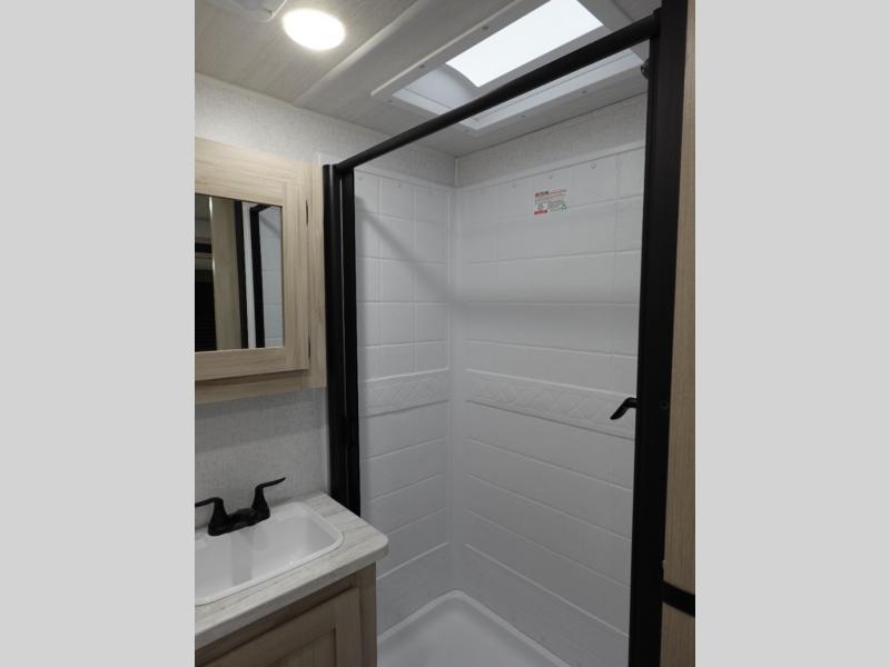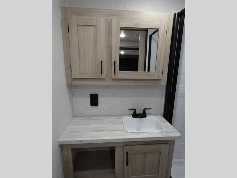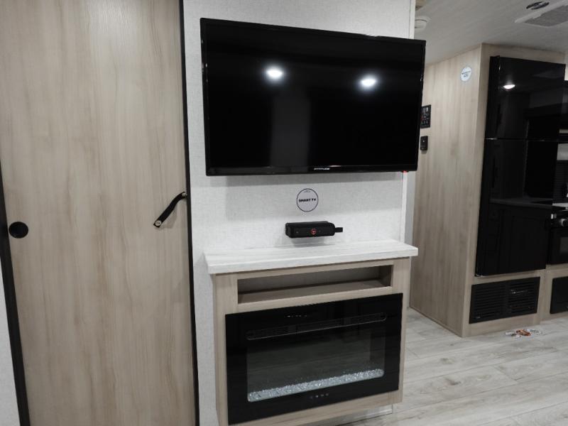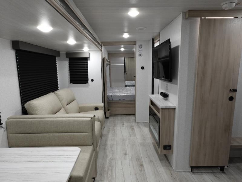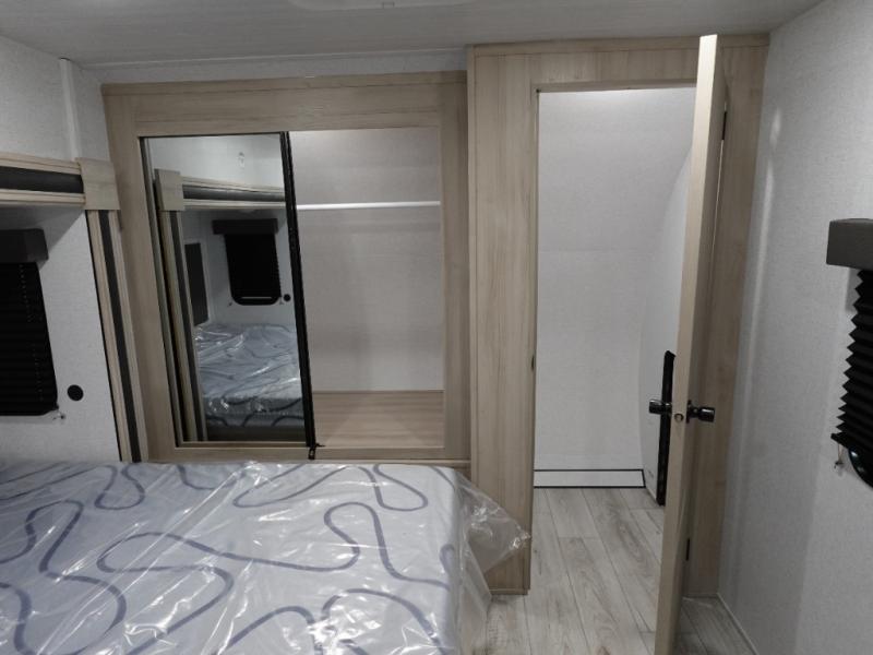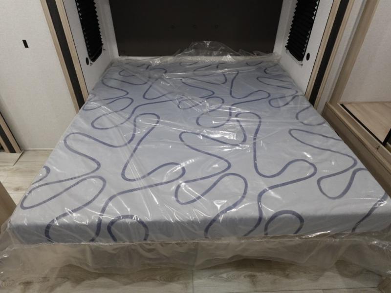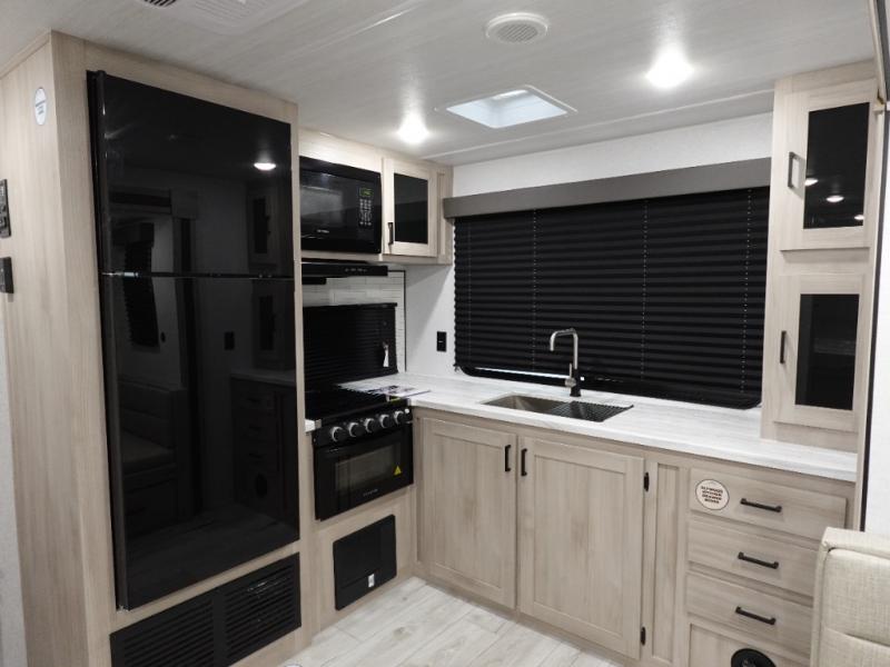 This travel trailer will feel just like home with its spacious interior and at-home comforts. Since there are dual entry doors, you can enter in through the front bedroom or the rear kitchen and living area. A king bed slide in the bedroom is sure to bring comfort, and there is a closet to keep your clothes wrinkle-free, plus washer and dryer prep. The second slide out is found in the living room, and here you can relax on the jiffy sofa or dine at the booth dinette. The chef of your group will love cooking in the rear kitchen, and there is generous counter space here to set out snacks. An entryway pantry and closet will provide additional storage for snacks, jackets, and more!
