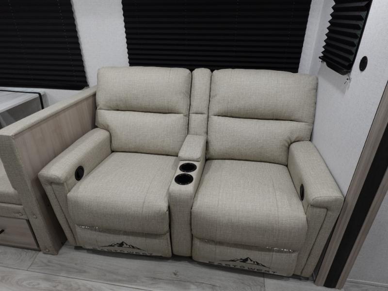 Each Della Terra travel trailer by EAST TO WEST is constructed with an enclosed and heated underbelly and enclosed holding tanks so you can camp all year long. There is also a power tongue jack with an LED light for easy set up and a power awning with LED lights you can rest under after you've unpacked. The Explore Comfort Package comes seamless pressed countertops, kitchen backsplash, window valance package with black night shades, and many more comforts. You will also appreciate the Adventure Outdoor Package with backup camera prep and solar prep, a tankless water heater, an RV grill quick disconnect, and a universal docking station with battery disconnect.