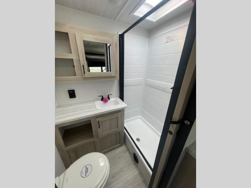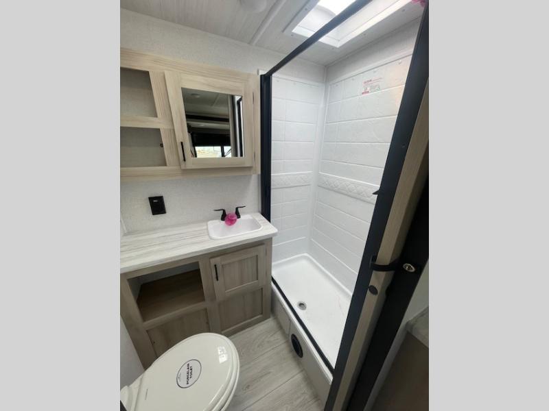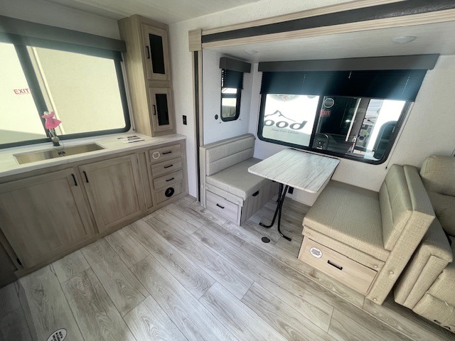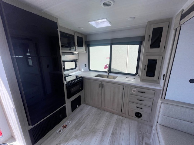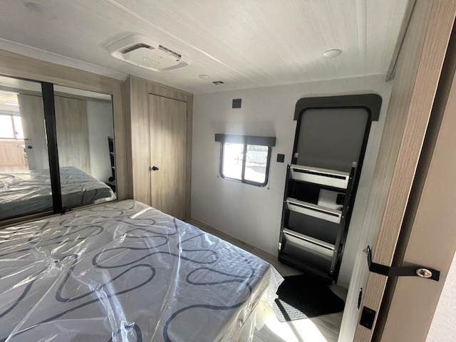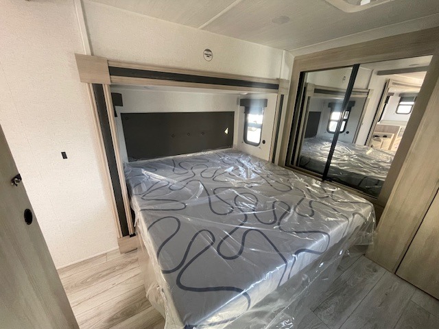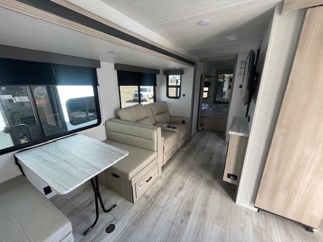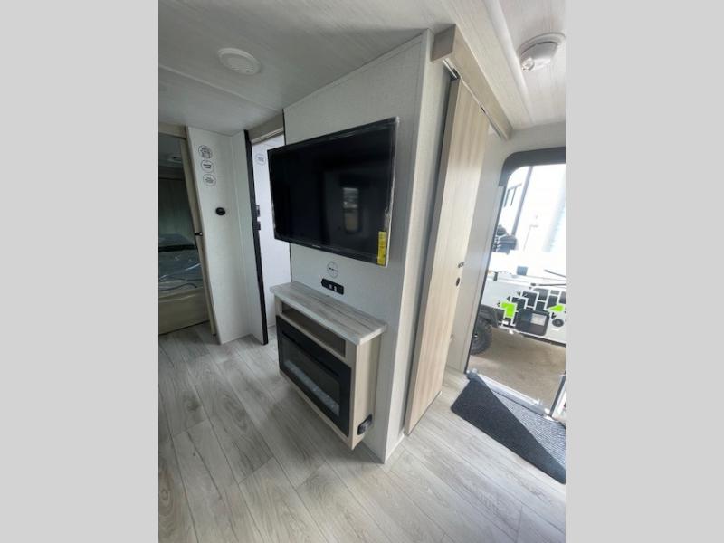 This travel trailer will feel just like home with its spacious interior and at-home comforts. Since there are dual entry doors, you can enter in through the front bedroom or the rear kitchen and living area. A king bed slide in the bedroom is sure to bring comfort, and there is a closet to keep your clothes wrinkle-free, plus washer and dryer prep. The second slide out is found in the living room, and here you can relax on the jiffy sofa or dine at the booth dinette. The chef of your group will love cooking in the rear kitchen, and there is generous counter space here to set out snacks. An entryway pantry and closet will provide additional storage for snacks, jackets, and more!