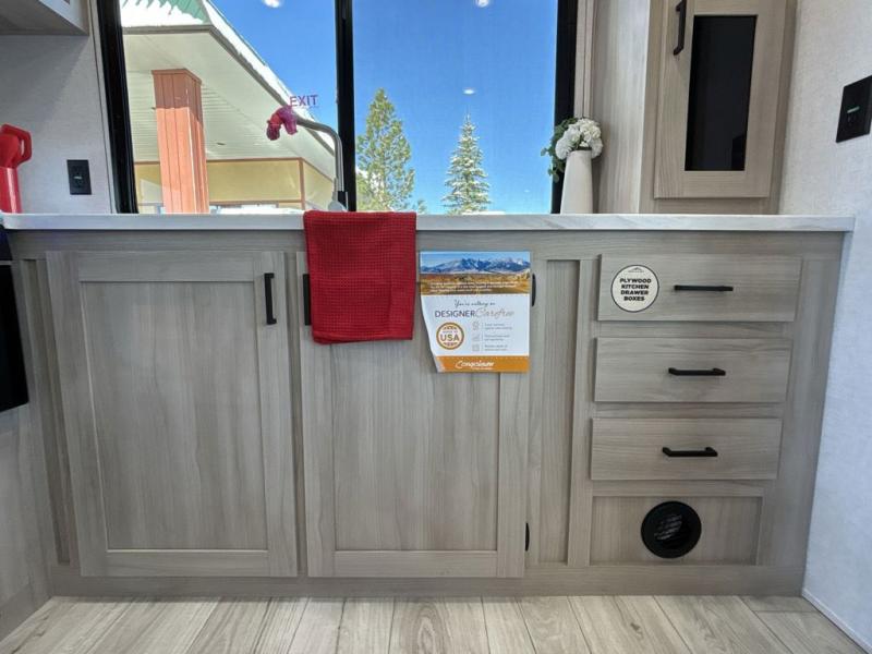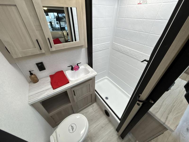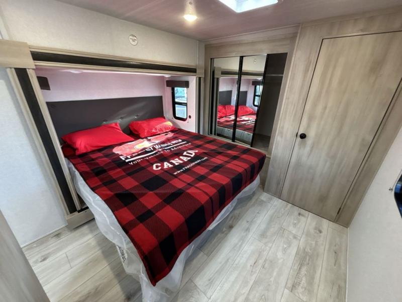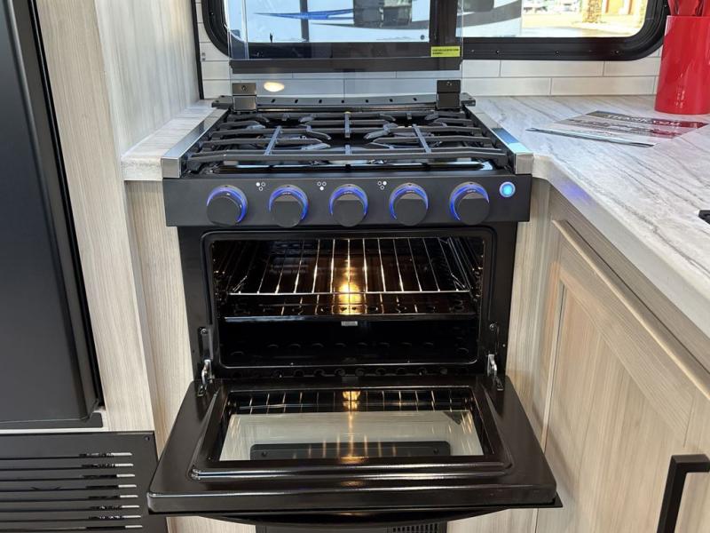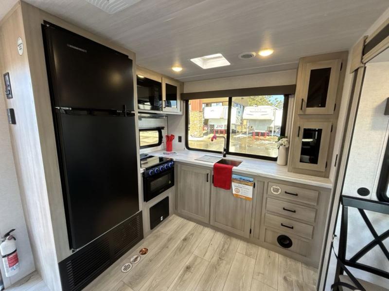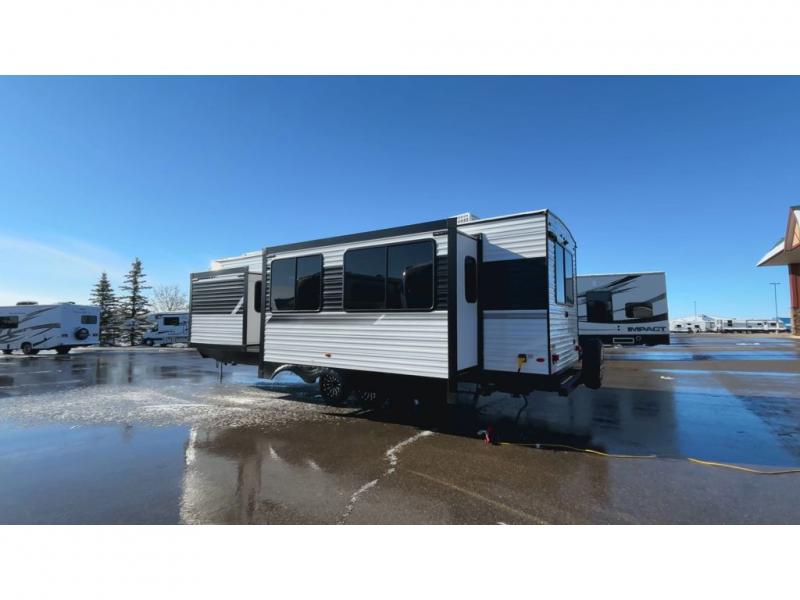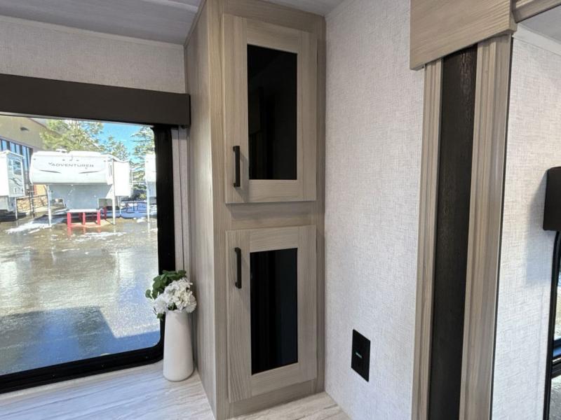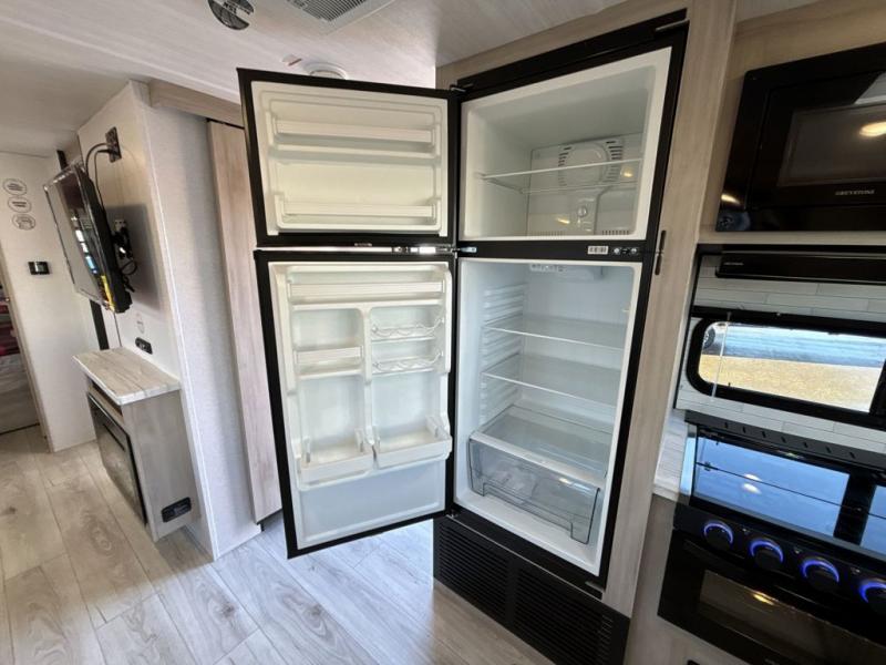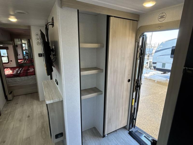This travel trailer will feel just like home with its spacious interior and at-home comforts. Since there are dual entry doors, you can enter in through the front bedroom or the rear kitchen and living area. A king bed slide in the bedroom is sure to bring comfort, and there is a closet to keep your clothes wrinkle-free, plus washer and dryer prep. The second slide out is found in the living room, and here you can relax on the jiffy sofa or dine at the booth dinette. The chef of your group will love cooking in the rear kitchen, and there is generous counter space here to set out snacks. An entryway pantry and closet will provide additional storage for snacks, jackets, and more!