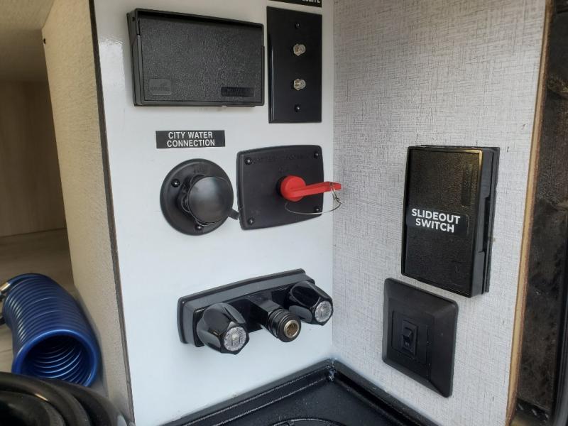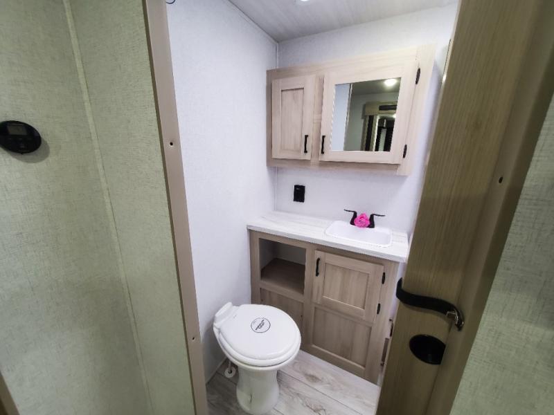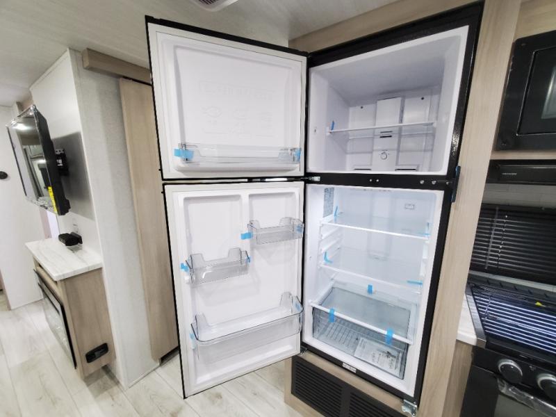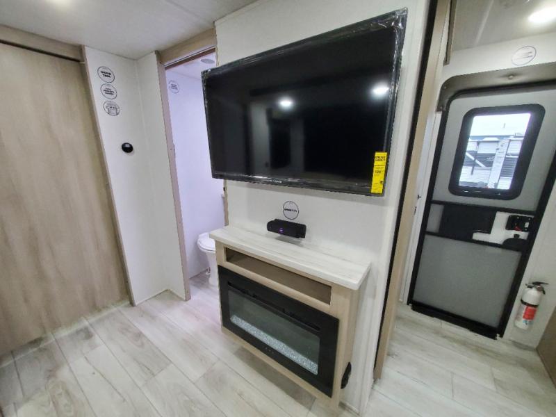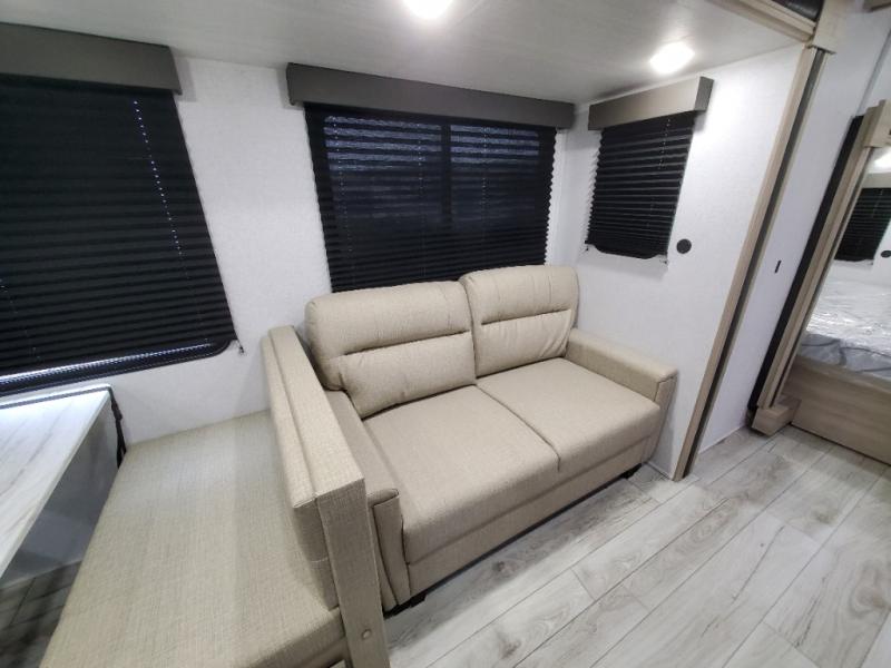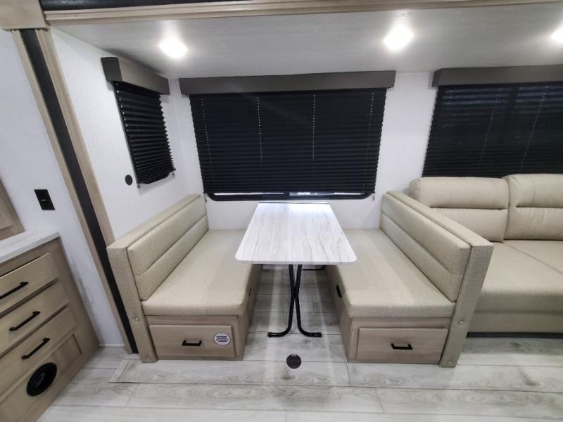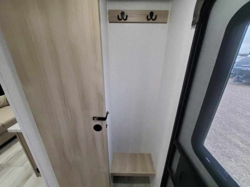 This travel trailer will feel just like home with its spacious interior and at-home comforts. Since there are dual entry doors, you can enter in through the front bedroom or the rear kitchen and living area. A king bed slide in the bedroom is sure to bring comfort, and there is a closet to keep your clothes wrinkle-free, plus washer and dryer prep. The second slide out is found in the living room, and here you can relax on the jiffy sofa or dine at the booth dinette. The chef of your group will love cooking in the rear kitchen, and there is generous counter space here to set out snacks. An entryway pantry and closet will provide additional storage for snacks, jackets, and more!