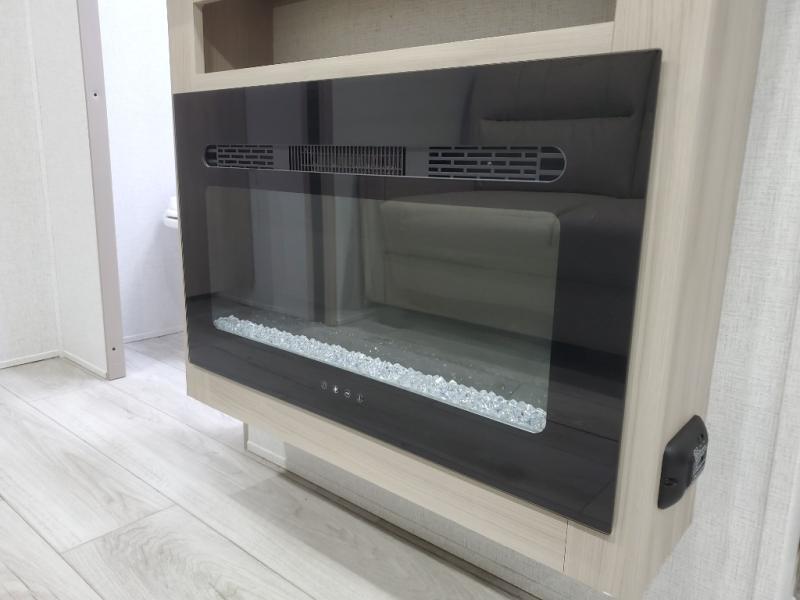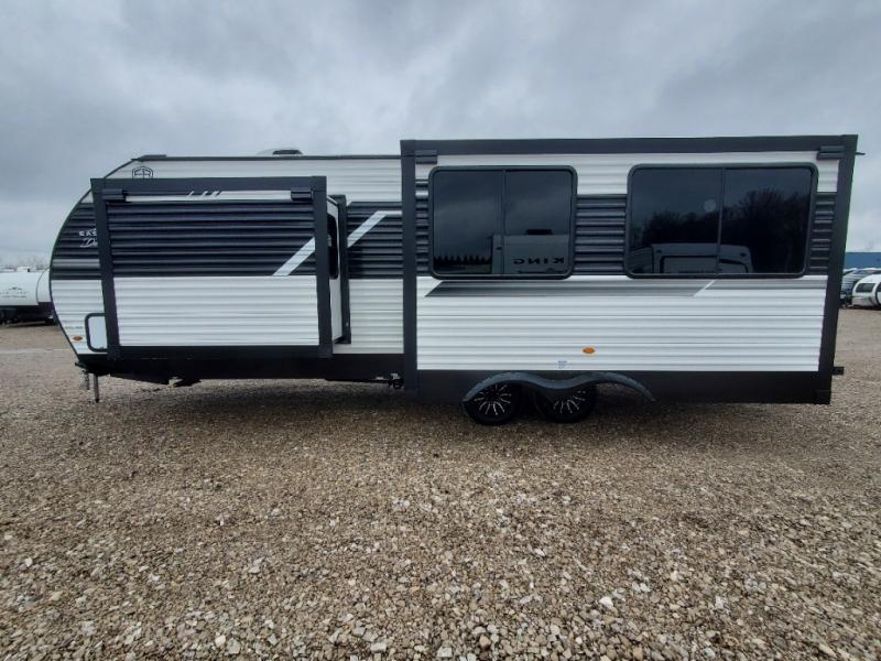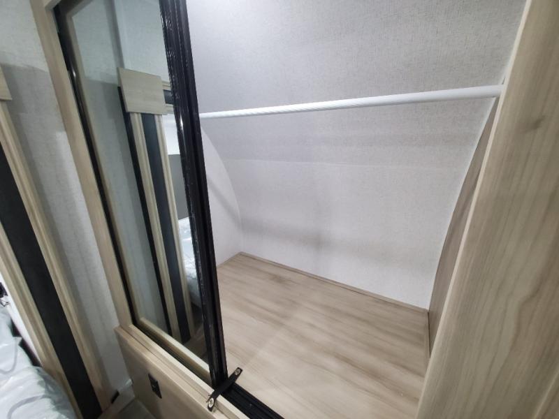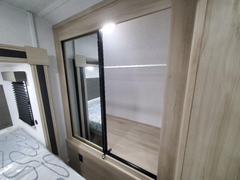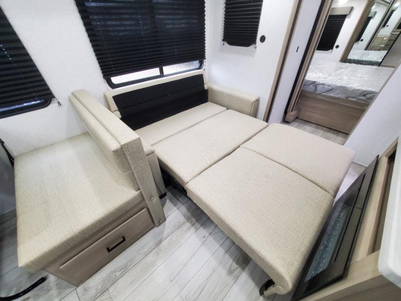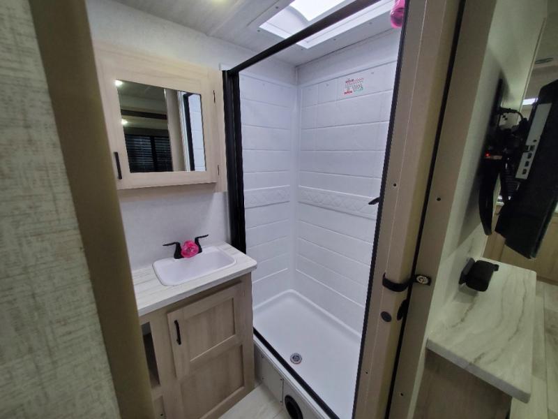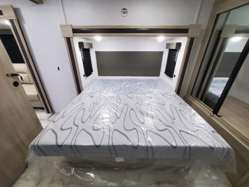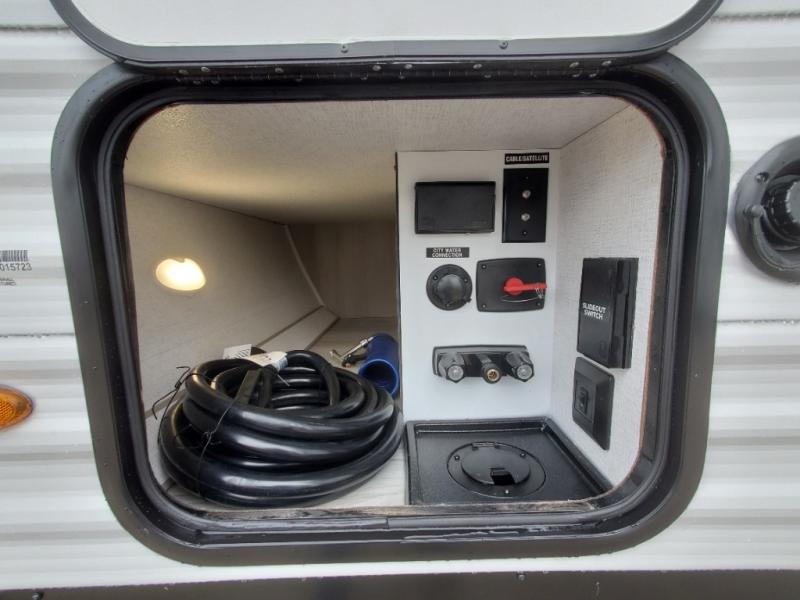 This travel trailer will feel just like home with its spacious interior and at-home comforts. Since there are dual entry doors, you can enter in through the front bedroom or the rear kitchen and living area. A king bed slide in the bedroom is sure to bring comfort, and there is a closet to keep your clothes wrinkle-free, plus washer and dryer prep. The second slide out is found in the living room, and here you can relax on the jiffy sofa or dine at the booth dinette. The chef of your group will love cooking in the rear kitchen, and there is generous counter space here to set out snacks. An entryway pantry and closet will provide additional storage for snacks, jackets, and more!