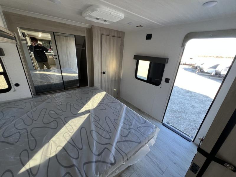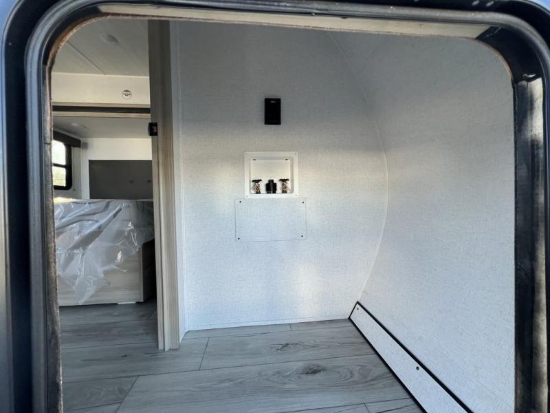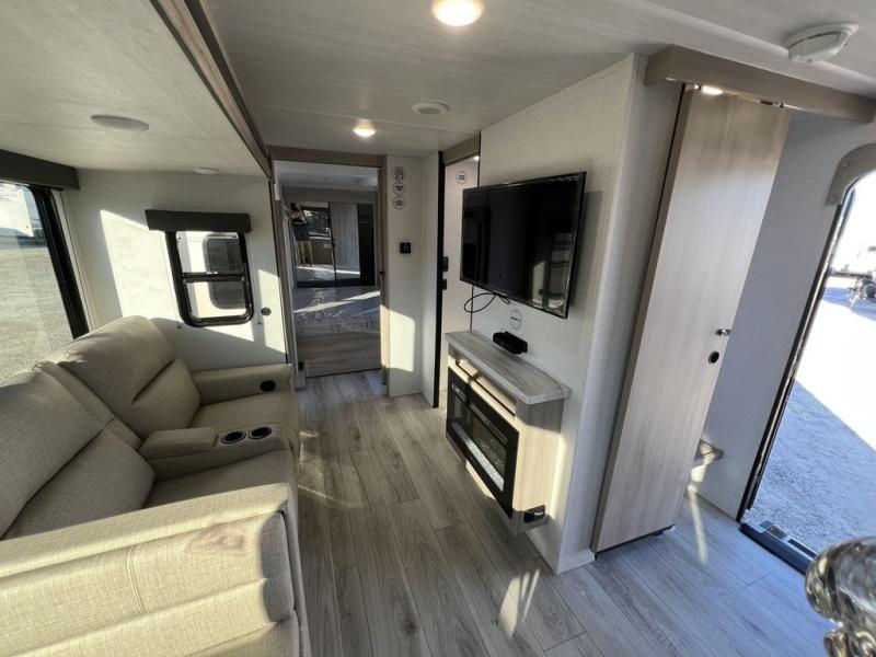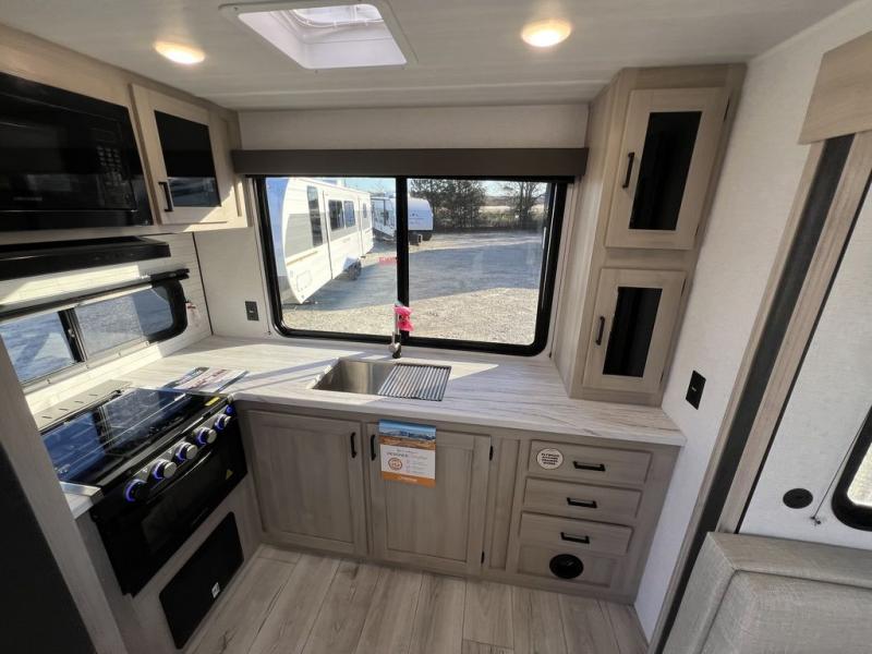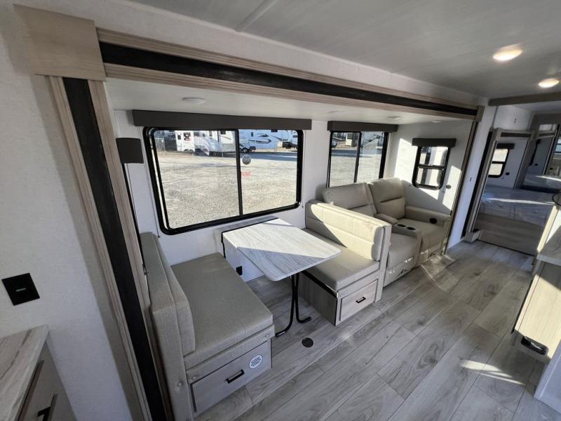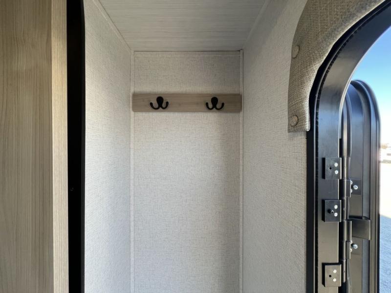 This travel trailer will feel just like home with its spacious interior and at-home comforts. Since there are dual entry doors, you can enter in through the front bedroom or the rear kitchen and living area. A king bed slide in the bedroom is sure to bring comfort, and there is a closet to keep your clothes wrinkle-free, plus washer and dryer prep. The second slide out is found in the living room, and here you can relax on the jiffy sofa or dine at the booth dinette. The chef of your group will love cooking in the rear kitchen, and there is generous counter space here to set out snacks. An entryway pantry and closet will provide additional storage for snacks, jackets, and more!