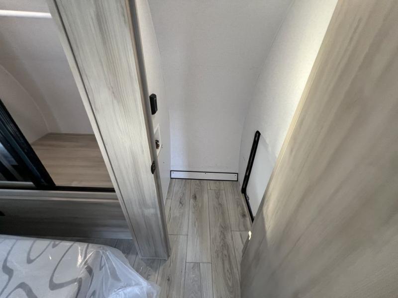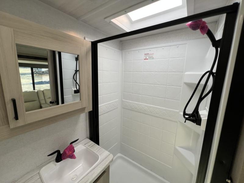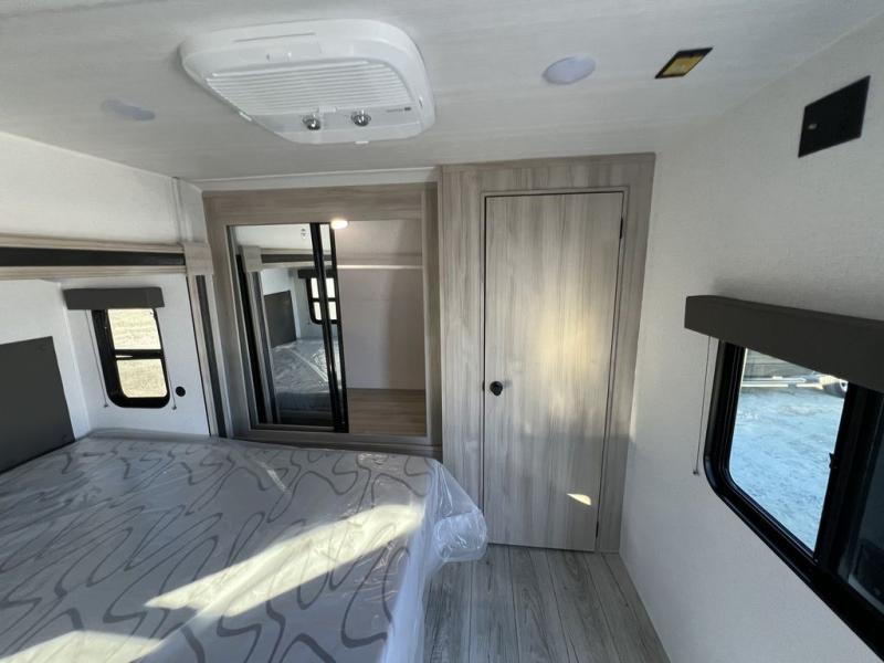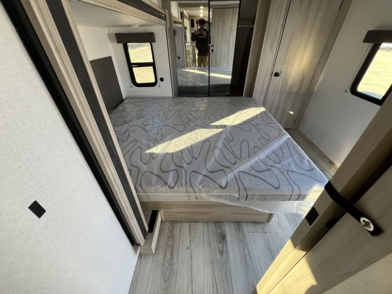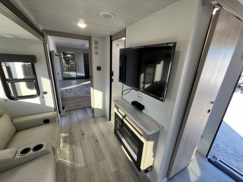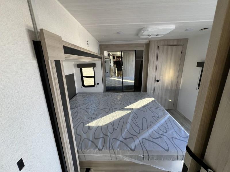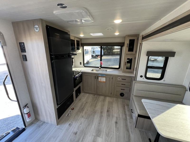 This travel trailer will feel just like home with its spacious interior and at-home comforts. Since there are dual entry doors, you can enter in through the front bedroom or the rear kitchen and living area. A king bed slide in the bedroom is sure to bring comfort, and there is a closet to keep your clothes wrinkle-free, plus washer and dryer prep. The second slide out is found in the living room, and here you can relax on the jiffy sofa or dine at the booth dinette. The chef of your group will love cooking in the rear kitchen, and there is generous counter space here to set out snacks. An entryway pantry and closet will provide additional storage for snacks, jackets, and more!