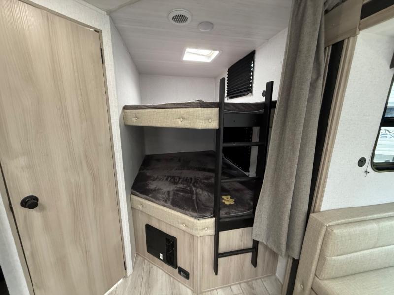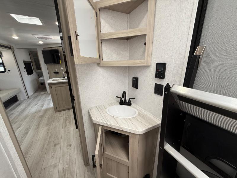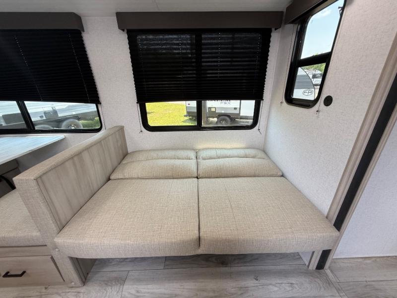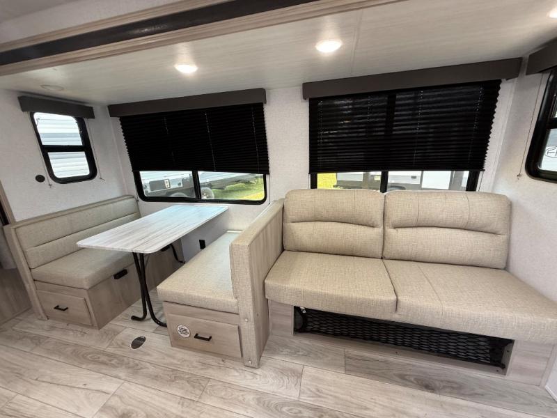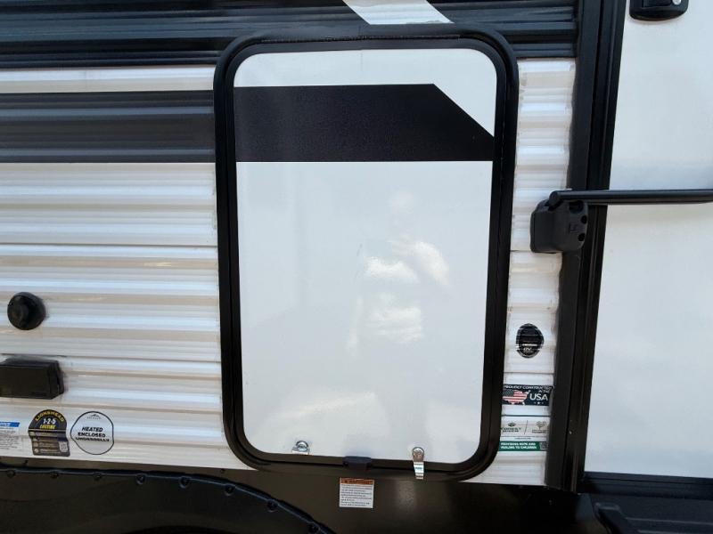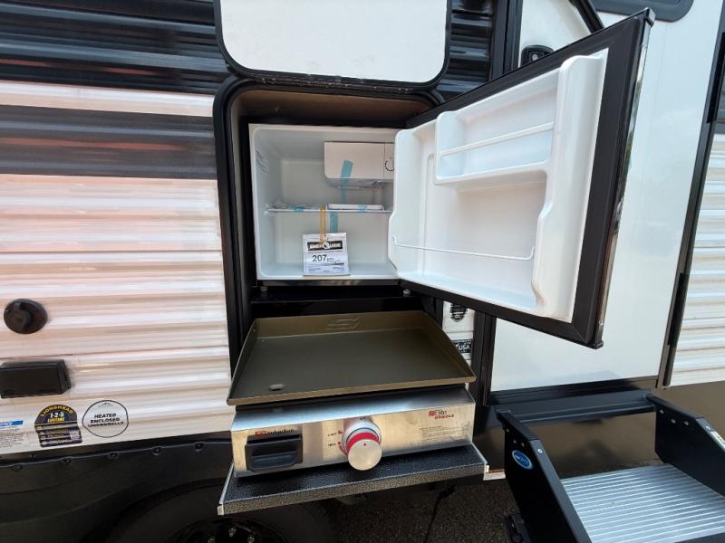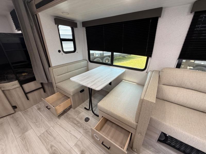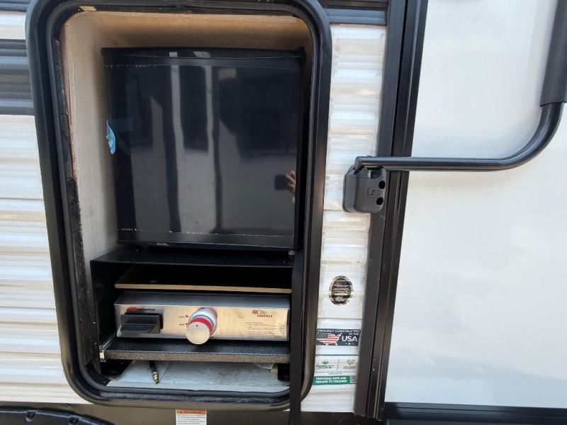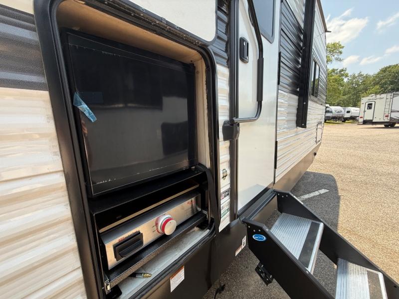 Pack your bags and hitch up this travel trailer for a fun family adventure! You will get a good night's rest on the front king bed in the front private bedroom, and the kids can sleep on the double bunk beds with storage. You could even transform the booth dinette with storage underneath it and the jiffy sofa which can be switched out for the optional theater seat or optional tri-fold sofa. The entertainment center has a fireplace for a cozy evening indoors and a hidden pantry behind it for all of your movie night snacks. With dual entry doors, it will be easy to enter and exit this unit especially from the rear corner bathroom which has one of the entry/exit doors to the unit. Enjoy cooking breakfast outside at the outdoor kitchen complete with a pull-out griddle and fridge!