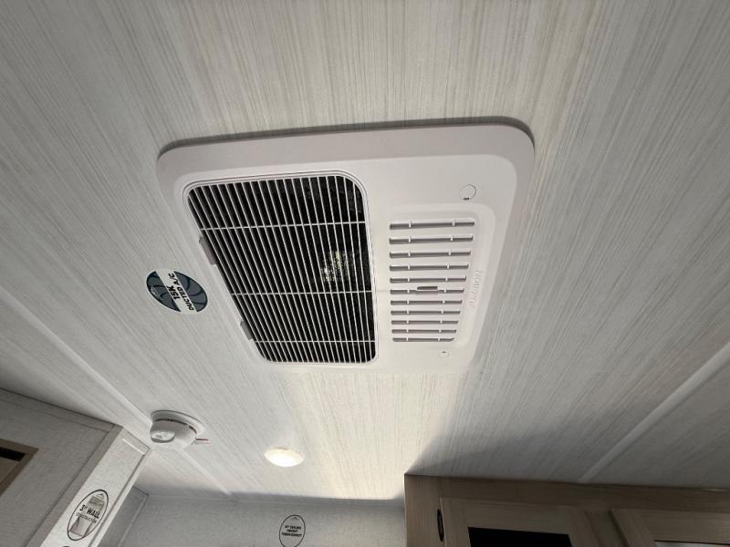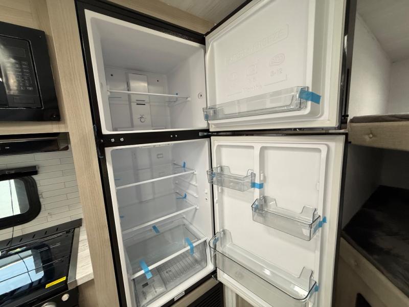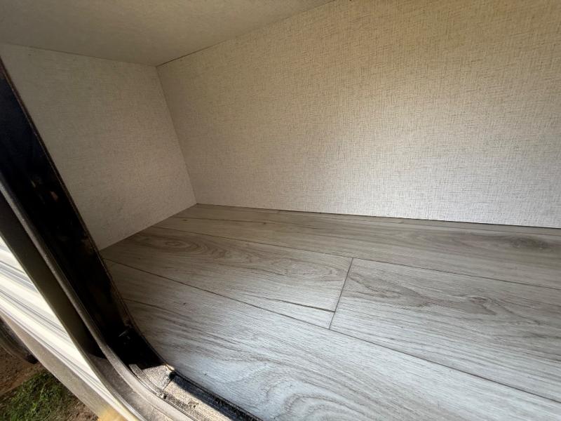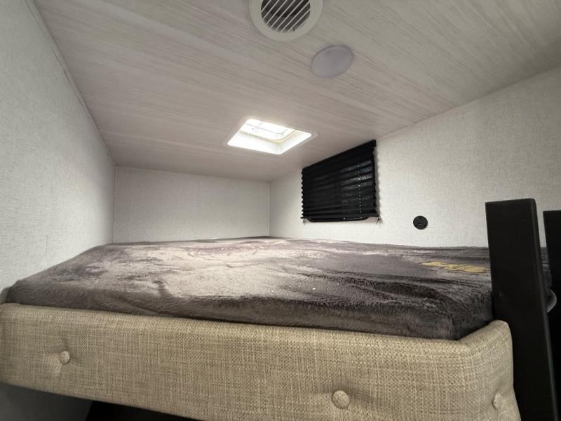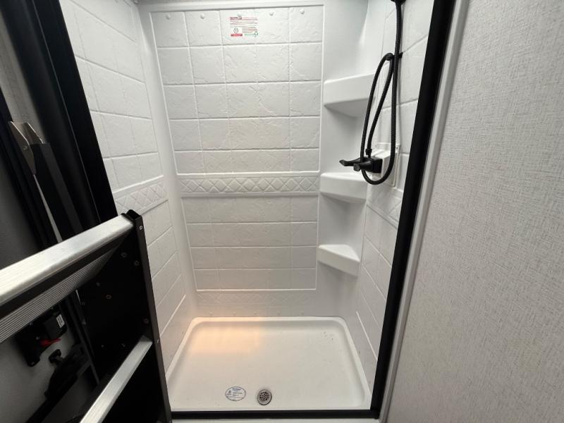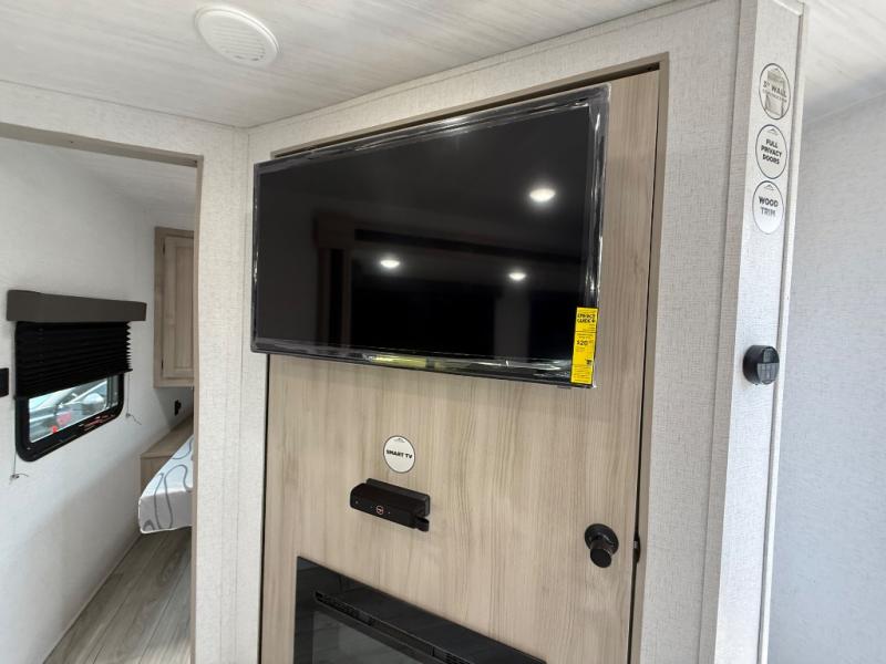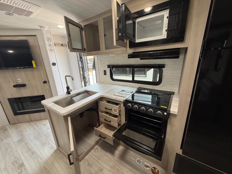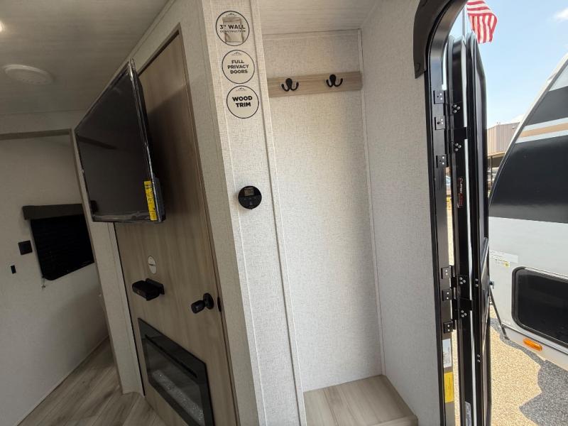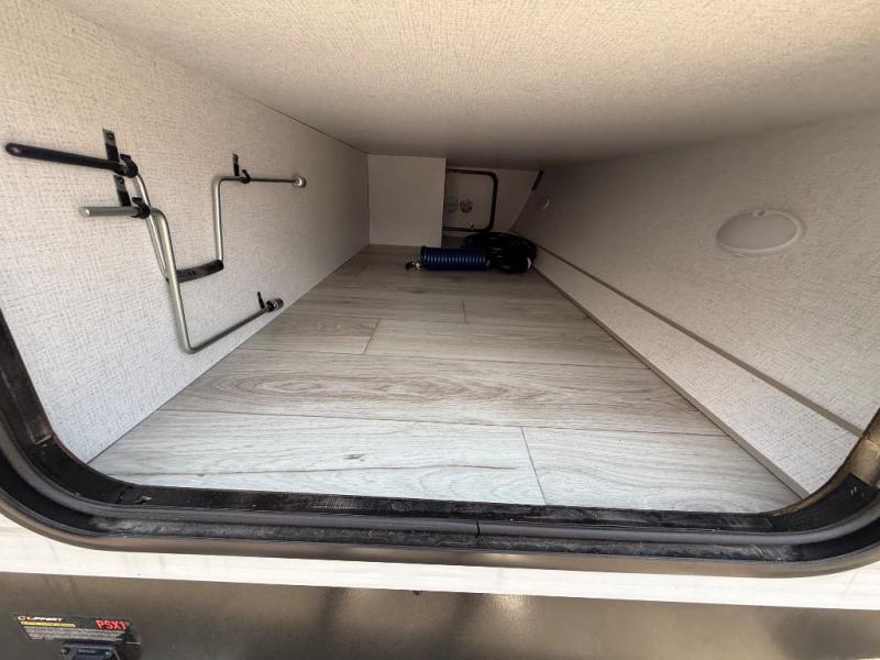 Pack your bags and hitch up this travel trailer for a fun family adventure! You will get a good night's rest on the front king bed in the front private bedroom, and the kids can sleep on the double bunk beds with storage. You could even transform the booth dinette with storage underneath it and the jiffy sofa which can be switched out for the optional theater seat or optional tri-fold sofa. The entertainment center has a fireplace for a cozy evening indoors and a hidden pantry behind it for all of your movie night snacks. With dual entry doors, it will be easy to enter and exit this unit especially from the rear corner bathroom which has one of the entry/exit doors to the unit. Enjoy cooking breakfast outside at the outdoor kitchen complete with a pull-out griddle and fridge!