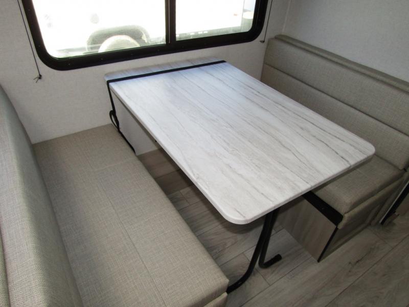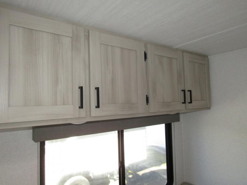 This Della Terra LE model is the perfect couples unit featuring a front queen bed that features flip-up storage and an overhead shelf for books. There is a booth dinette with storage beneath the seats to accommodate everyone for a meal, or to gather for a game of cards. You will appreciate the rear bath featuring a 24" x 40" walk-in shower, toilet, vanity/sink with a medicine cabinet, and additional storage for towels. The kitchen allows you to cook while you travel inside with a refrigerator, two burner range, and overhead microwave oven. A 12' awning outside offers an added living space protected from the sun and rain, and your camp chairs and outside equipment and games can be neatly tucked away in the large pass-through storage up front.