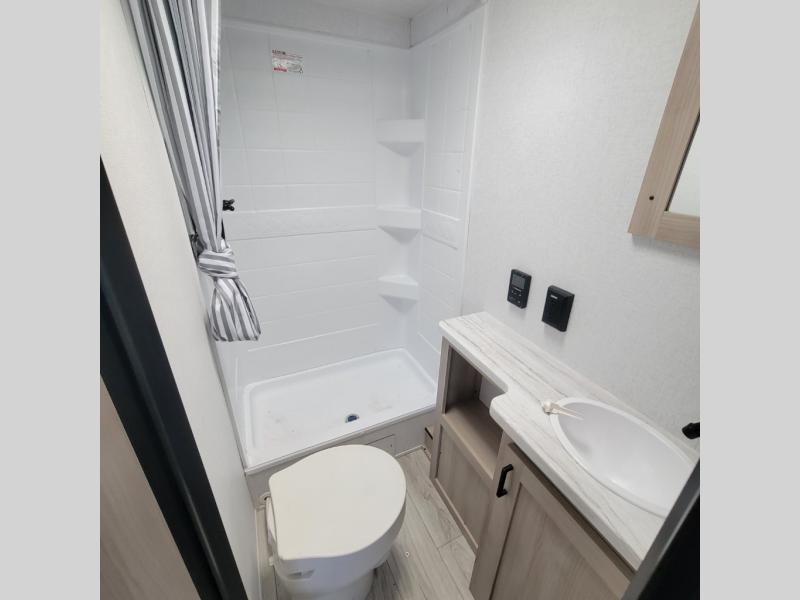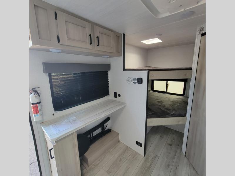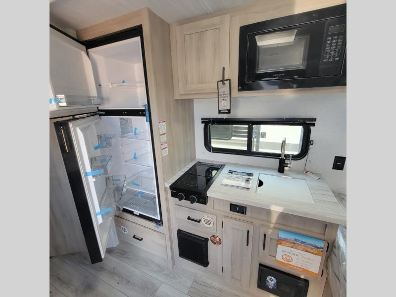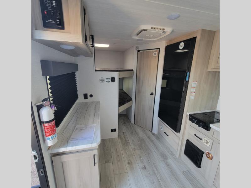 This is the perfect bunk travel trailer for your growing family. You will love the double-size bunks in back for the children or your guests, while you take the front queen bed. You can easily cook using the two burner range and microwave oven when you aren't cooking hotdogs and burgers over an open fire outside. There is flip-up storage under the front bed, under the booth dinette, and under the bunks. There is also a full bath with a walk-in shower that will allow you to freshen up without having to use the campground's facilities.