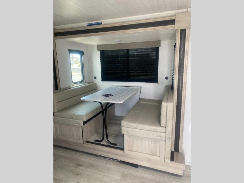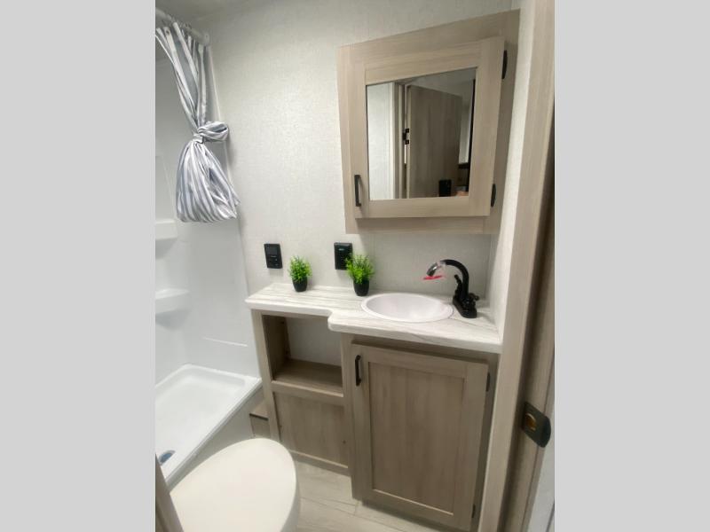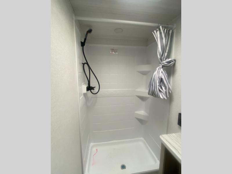This Della Terra LE is perfect for your family of six or eight. With 50" x 68" bunks in the back, and a queen bed in front, as well as a booth dinette slide, you can easily sleep seven or eight total! The dinette is a great place to relax and enjoy a meal, or to socialize and play a game when inside, and the slide provides more interior space for everyone. There is a rear corner bath featuring a shower, plus a toilet and vanity with a sink. On the outside, enjoy a nice pass-through storage area up front and additional storage under the bunks. There is also an exterior shower which is great for rinsing off dirty feet before coming inside. It's time to grab some gear and a few friends and get camping!