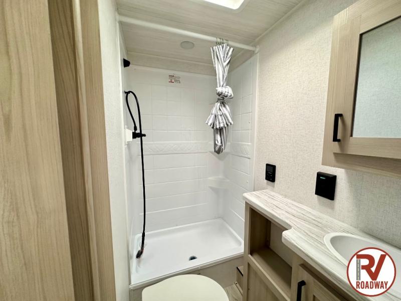 This Della Terra LE is perfect for your family of six or eight. With 50" x 68" bunks in the back, and a queen bed in front, as well as a booth dinette slide, you can easily sleep seven or eight total! The dinette is a great place to relax and enjoy a meal, or to socialize and play a game when inside, and the slide provides more interior space for everyone. There is a rear corner bath featuring a shower, plus a toilet and vanity with a sink. On the outside, enjoy a nice pass-through storage area up front and additional storage under the bunks. There is also an exterior shower which is great for rinsing off dirty feet before coming inside. It's time to grab some gear and a few friends and get camping!
