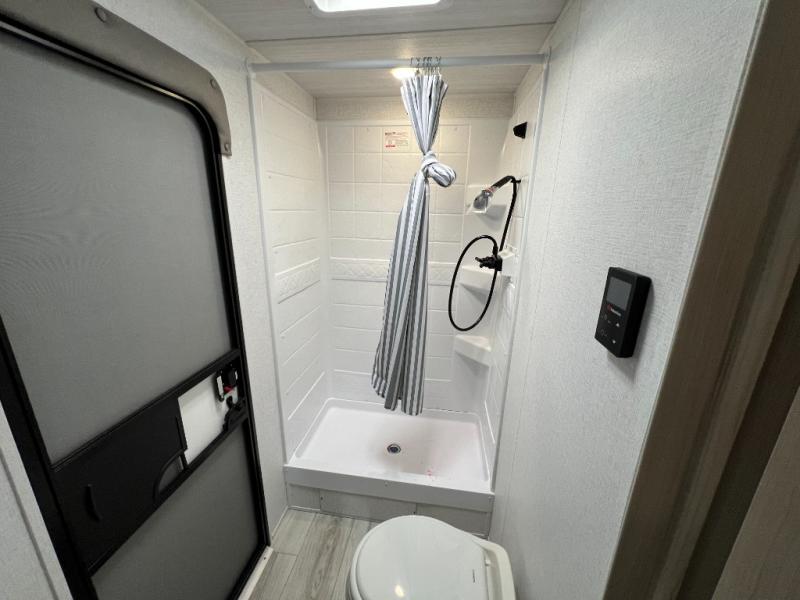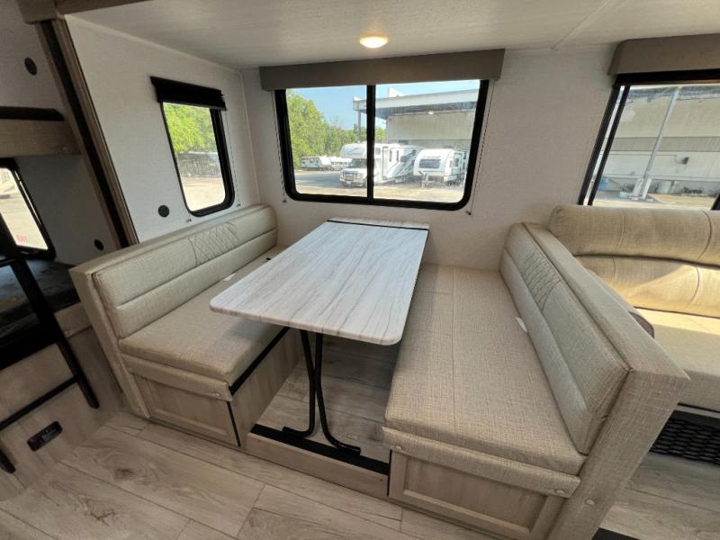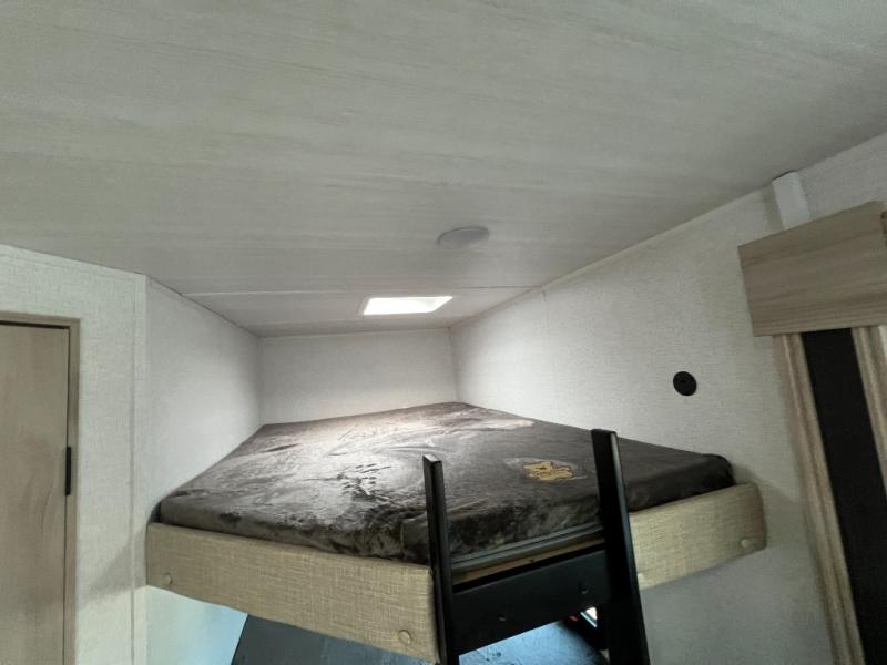 This Della Terra LE bunk model will provide comfort for your crew while camping. The 50" x 74" bunks in back will be perfect for four children or adults, and a king bed up front is a relaxing retreat in a private bedroom. You will also find in the bedroom a TV hook-up along the roadside wall plus nightstands and wardrobe storage on either side of the bed. There is also overhead cabinets and storage beneath the bed for your things. In the living area, a jackknife sofa provides seating during the day along with a booth dinette for meals and game time. Both offer storage beneath the seating. Make meals for your family with a two burner cooktop and microwave oven inside when you don't want to cook over a campfire outside. And the private toilet and 24" x 40" walk-in shower is a comfort that makes camping very enjoyable. There is even a separate entry/exit door making the bathroom easy to access from outside. On the outside, a 15' awning, pass-through storage, and an outside shower to rinse off dirty feet before heading inside.