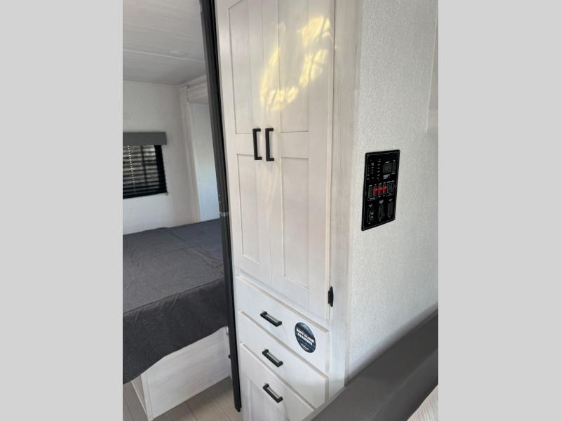 The journey will be enjoyable when you use this Entrada Class C gas motorhome to explore! You will be able to create meals each day that you are on the road because the kitchen has everything you will need, like a convection microwave, a round sink, a cooktop, a flip-up countertop, and a 10.7-cubic foot refrigerator. There is even a pantry/wardrobe for you to use to store spices, chips, or canned goods. Across from the queen bed slide, you'll find a private bath so you can get cleaned up in the morning, and the vanity with a medicine cabinet is located just outside the bathroom so that someone can brush their teeth while another is showering.