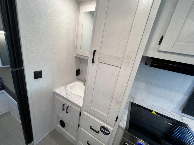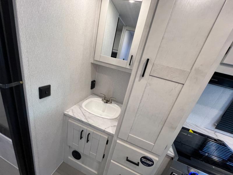 This coach is perfect for traveling with a friend or honey since there are two twin beds that can convert to a king-size bed if you choose! There is a 62" sofa and 42" x 68" booth dinette in the main living area that can double as seating and sleeping space, plus there is a bunk over cab for the little ones. Once you are fully rested, head to the kitchen to prepare a delicious breakfast feast with the convection microwave and cooktop. Use the double sink to clean up, and the 10.7-cubic foot refrigerator to keep your perishables fresh. You can even add some extra prep space to this area by using the countertop extension.