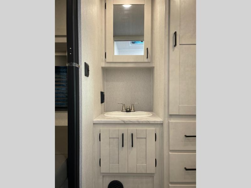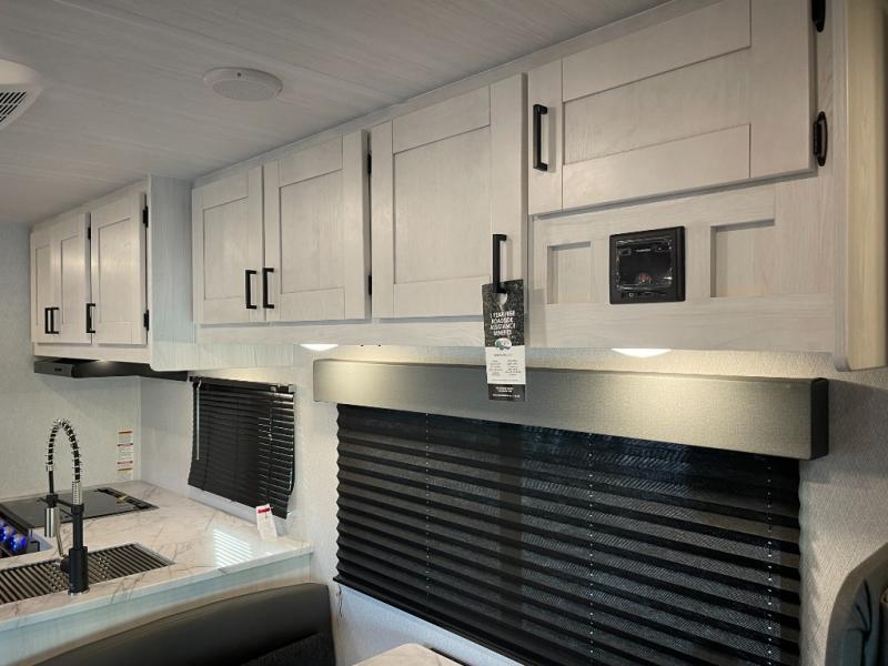 This coach is perfect for traveling with a friend or honey since there are two twin beds that can convert to a king-size bed if you choose! There is a 62" sofa and 42" x 68" booth dinette in the main living area that can double as seating and sleeping space, plus there is a bunk over cab for the little ones. Once you are fully rested, head to the kitchen to prepare a delicious breakfast feast with the convection microwave and cooktop. Use the double sink to clean up, and the 10.7-cubic foot refrigerator to keep your perishables fresh. You can even add some extra prep space to this area by using the countertop extension.
