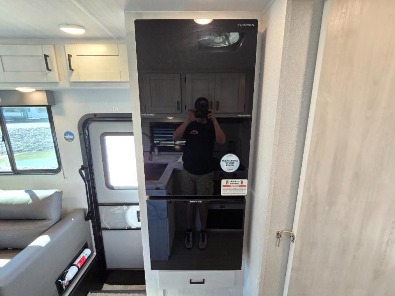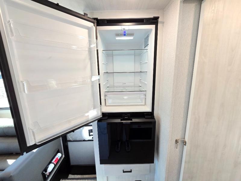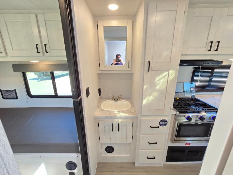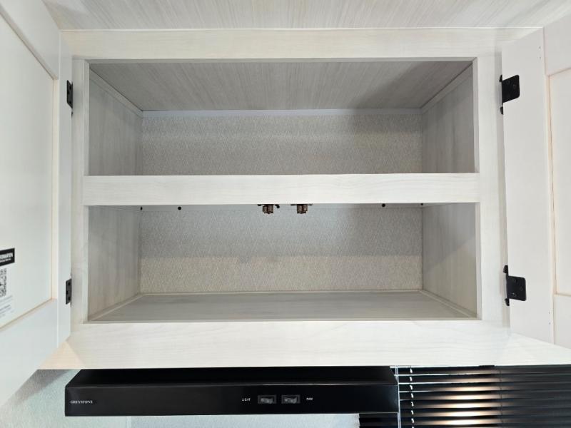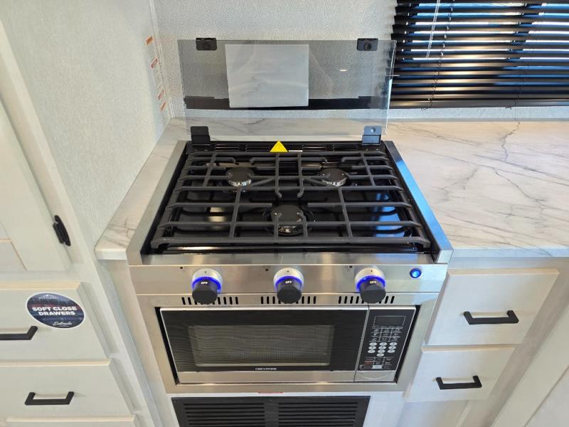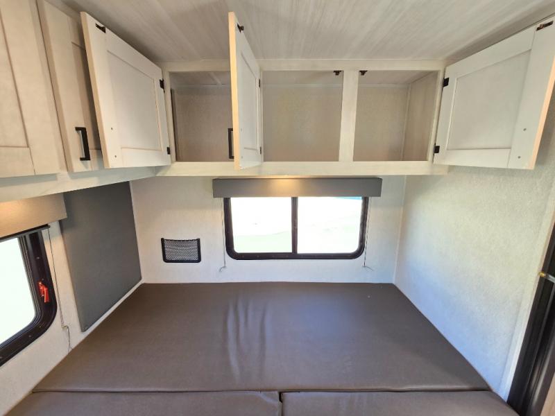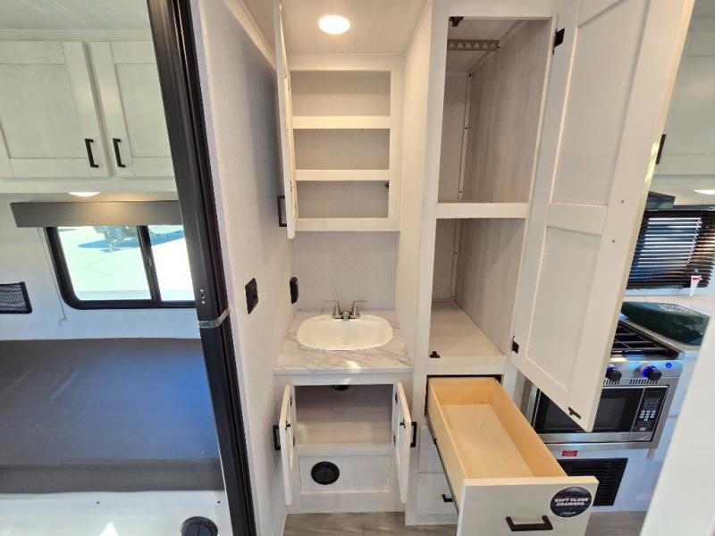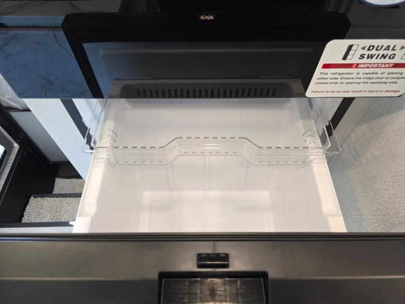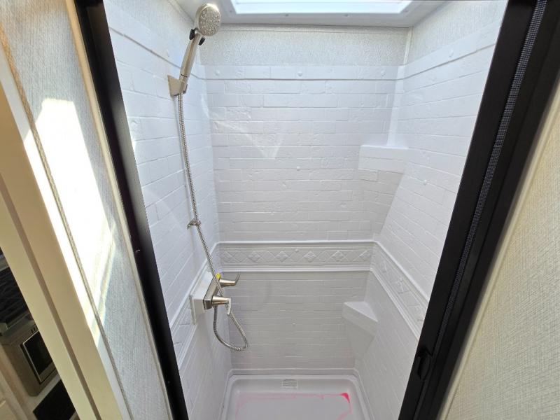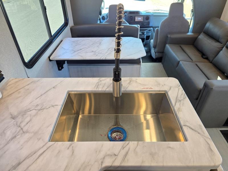 This coach is perfect for traveling with a friend or honey since there are two twin beds that can convert to a king-size bed if you choose! There is a 62" sofa and 42" x 68" booth dinette in the main living area that can double as seating and sleeping space, plus there is a bunk over cab for the little ones. Once you are fully rested, head to the kitchen to prepare a delicious breakfast feast with the convection microwave and cooktop. Use the double sink to clean up, and the 10.7-cubic foot refrigerator to keep your perishables fresh. You can even add some extra prep space to this area by using the countertop extension.