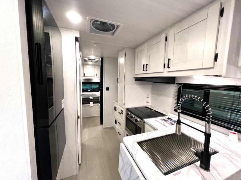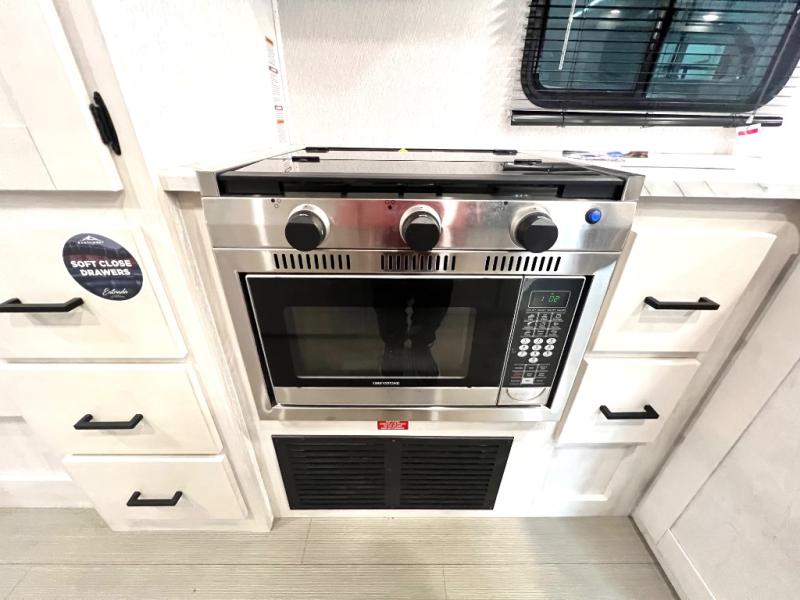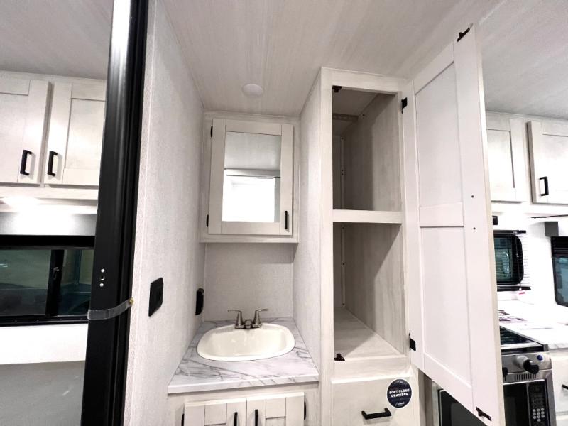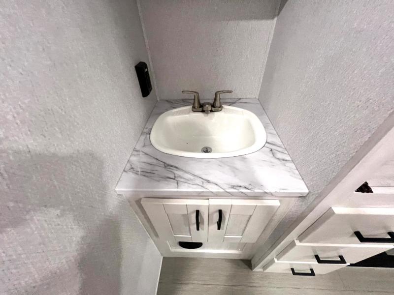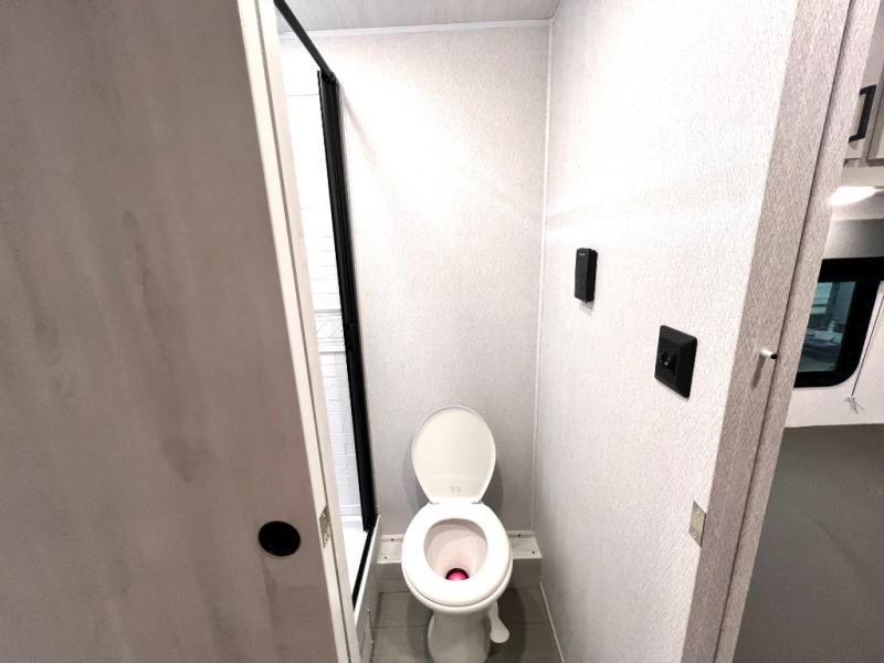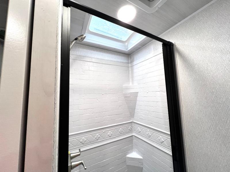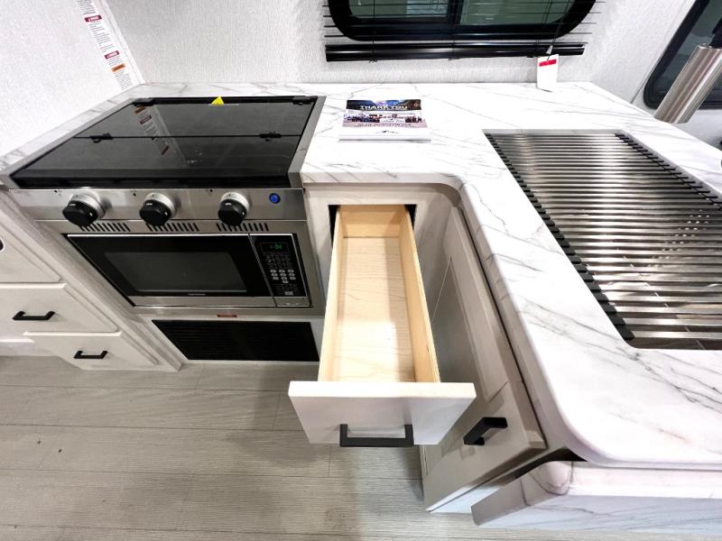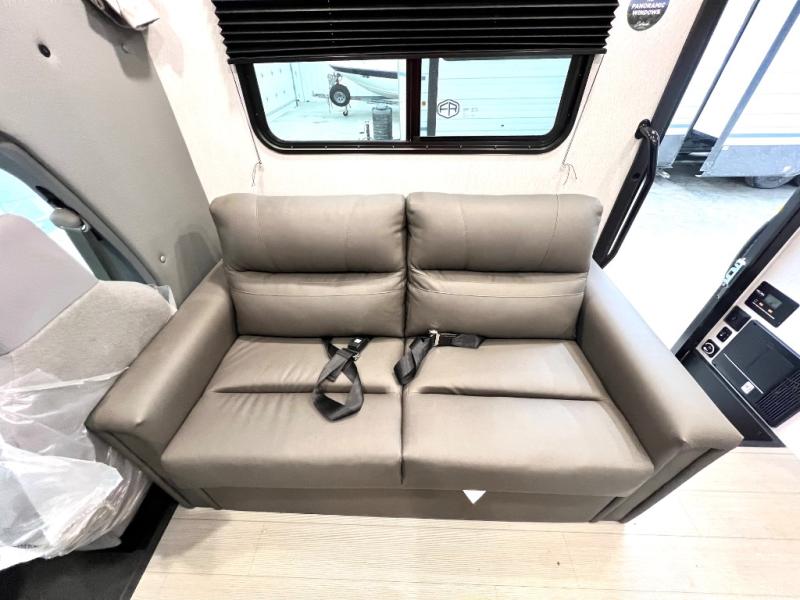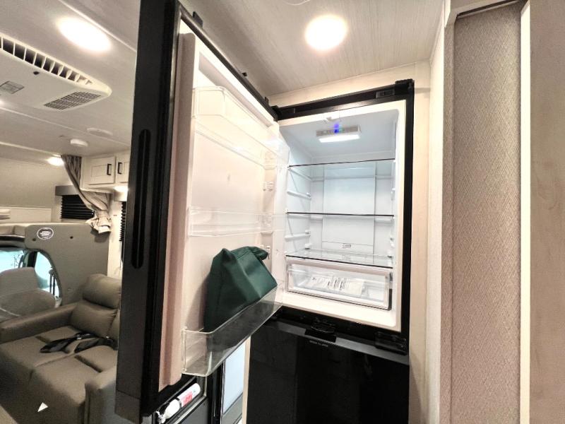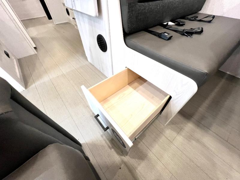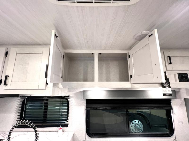 This coach is perfect for traveling with a friend or honey since there are two twin beds that can convert to a king-size bed if you choose! There is a 62" sofa and 42" x 68" booth dinette in the main living area that can double as seating and sleeping space, plus there is a bunk over cab for the little ones. Once you are fully rested, head to the kitchen to prepare a delicious breakfast feast with the convection microwave and cooktop. Use the double sink to clean up, and the 10.7-cubic foot refrigerator to keep your perishables fresh. You can even add some extra prep space to this area by using the countertop extension.