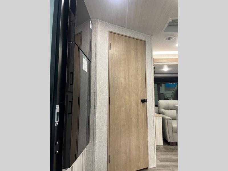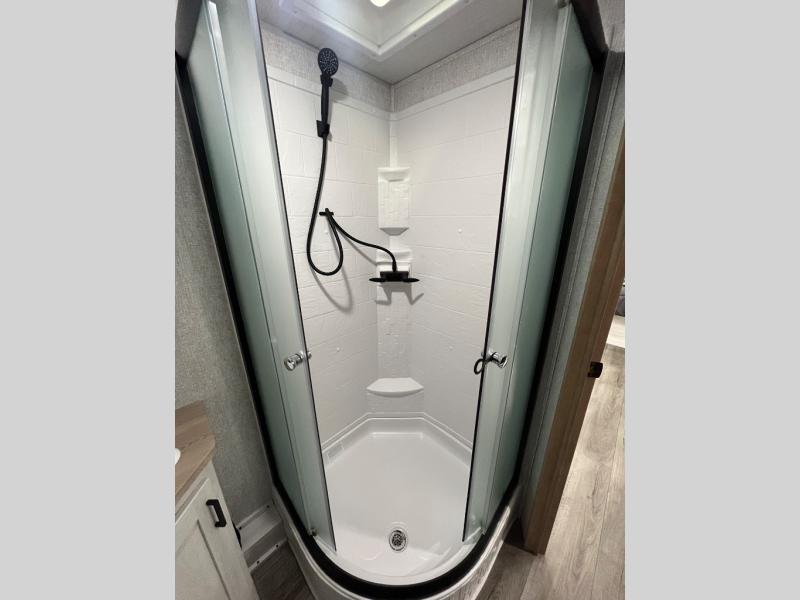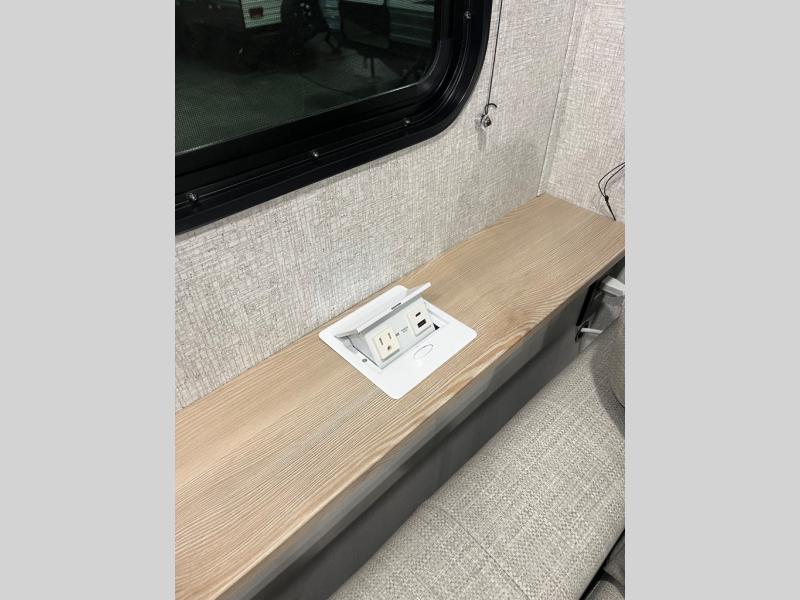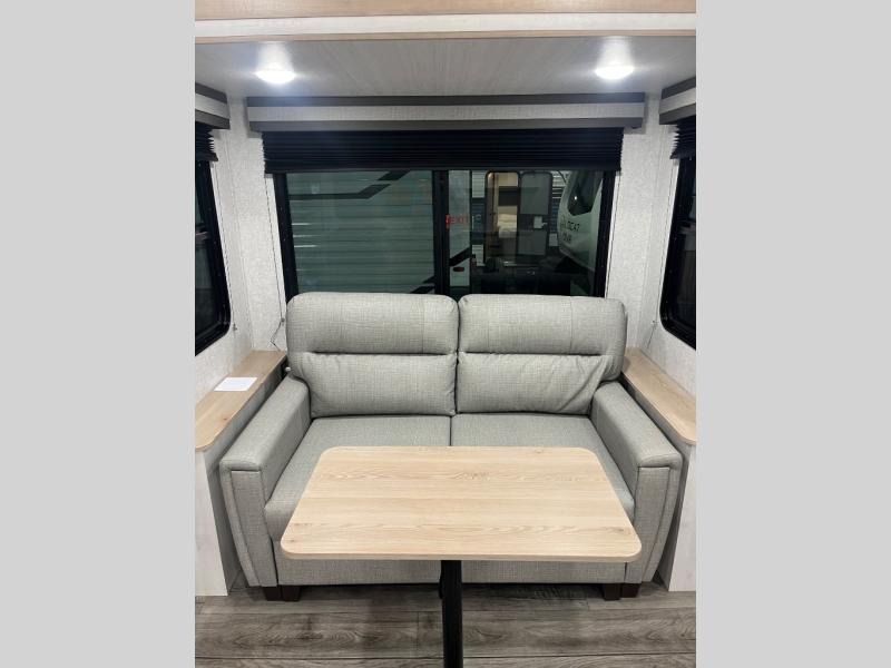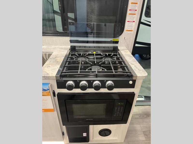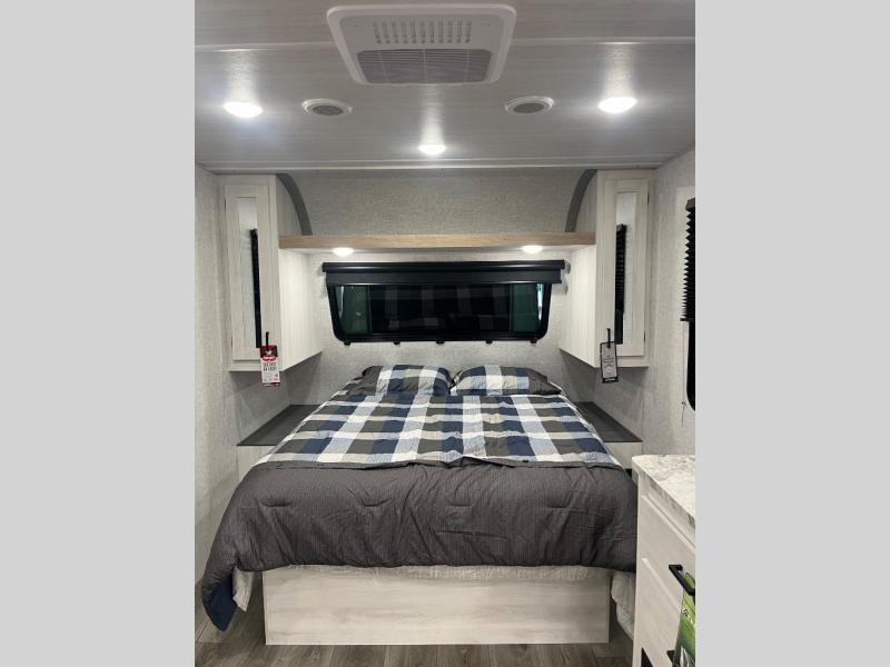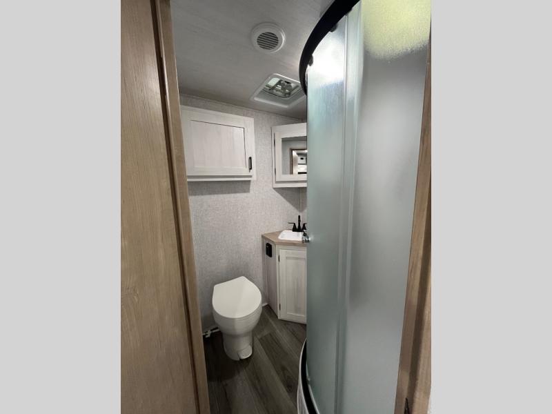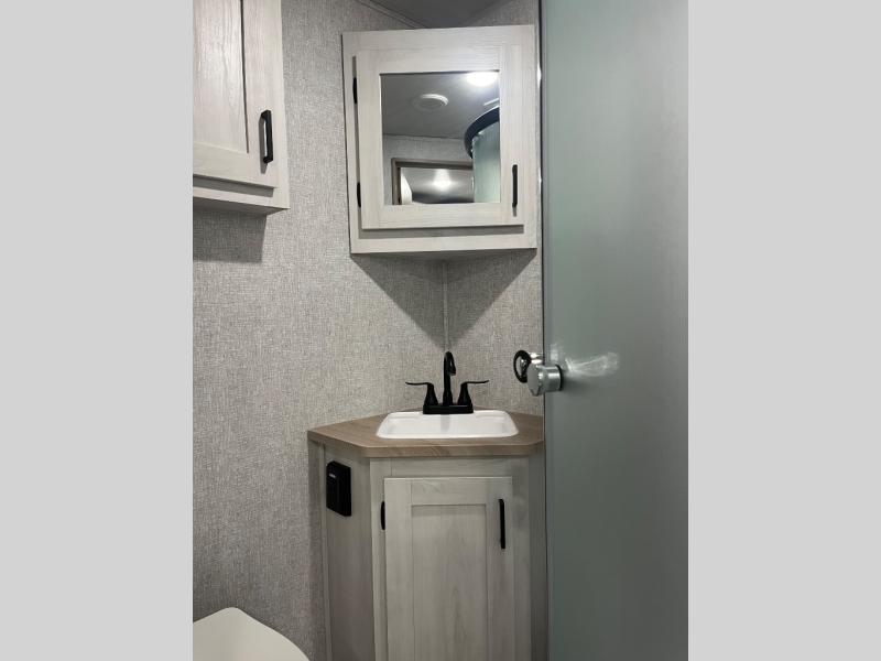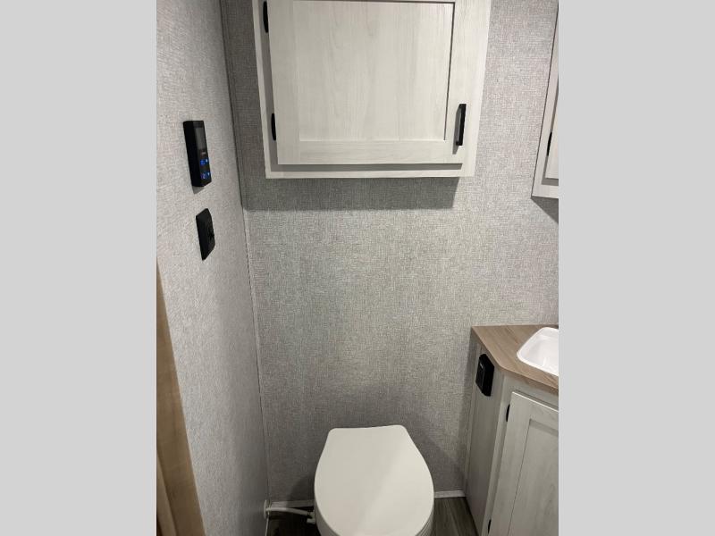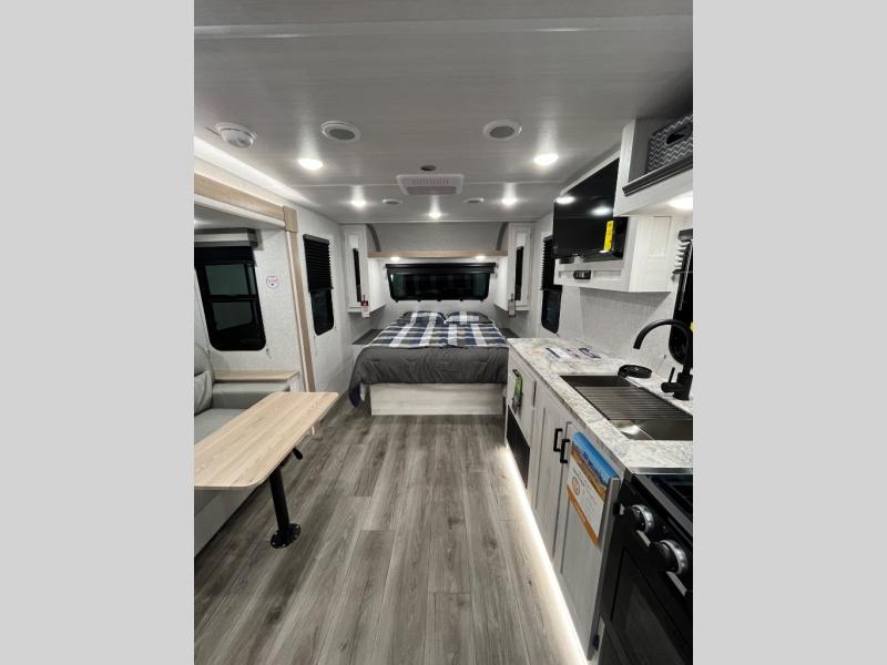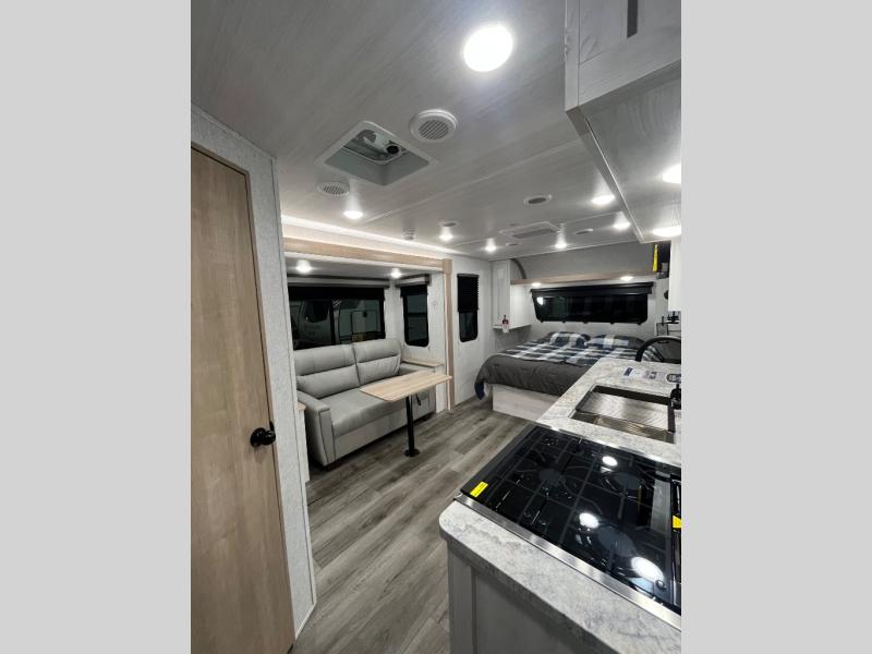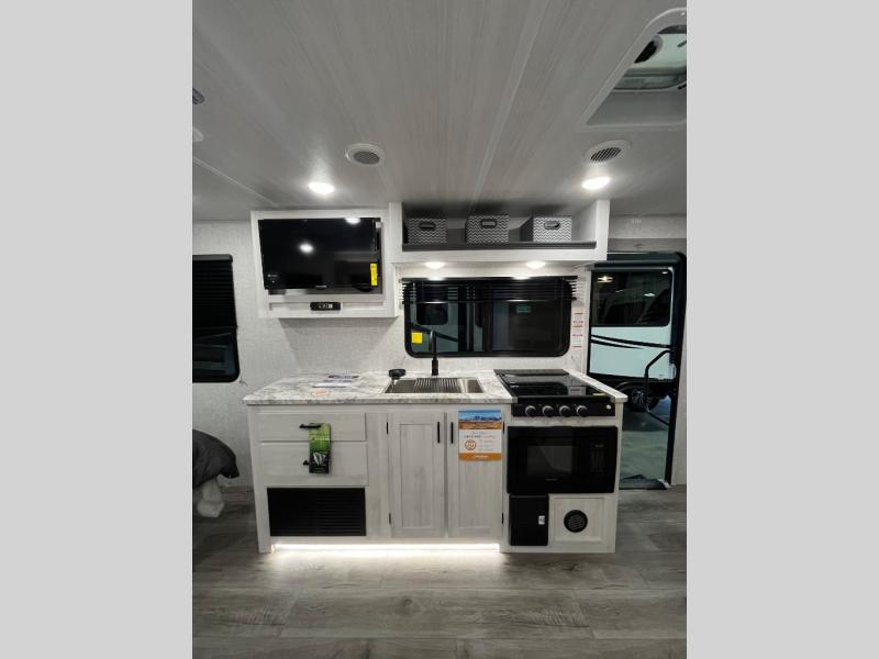 Pack your bags and head out on a fun vacation with your loved one in this travel trailer! You will get a good night's rest each night on the front queen bed with wardrobes on either side for your clothes. Freshen up each morning in the full corner bathroom with the radius shower with a skylight above to add natural lighting. The kitchen has everything you need to prepare a delicious home cooked meal including a countertop extension and air fryer microwave. Enjoy your meals at the tri-fold sofa slide with a dinette table in front of it or switch out the sofa for the optional theater seating!
