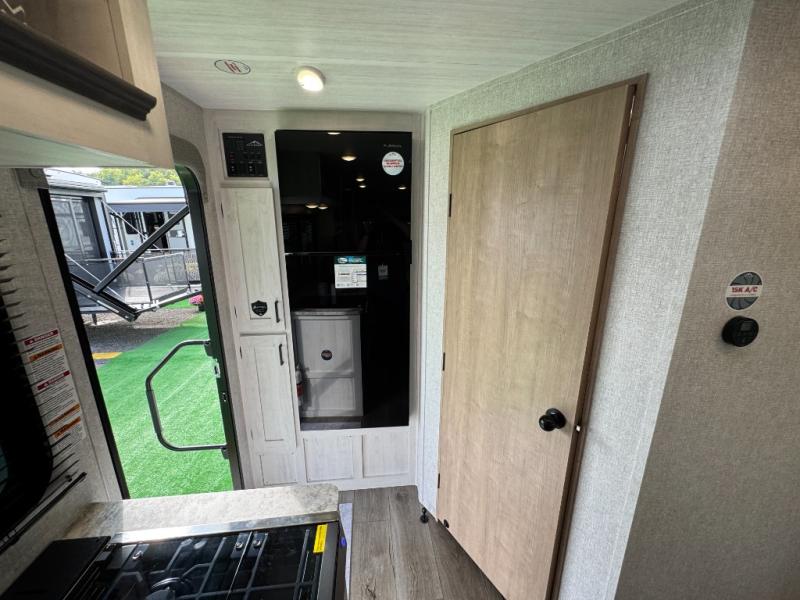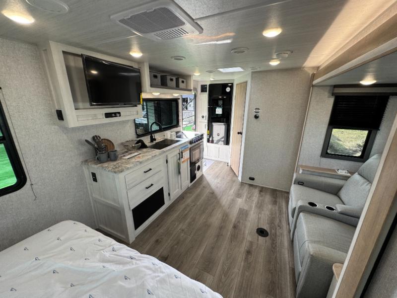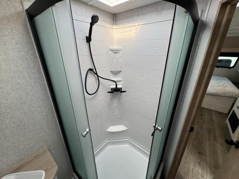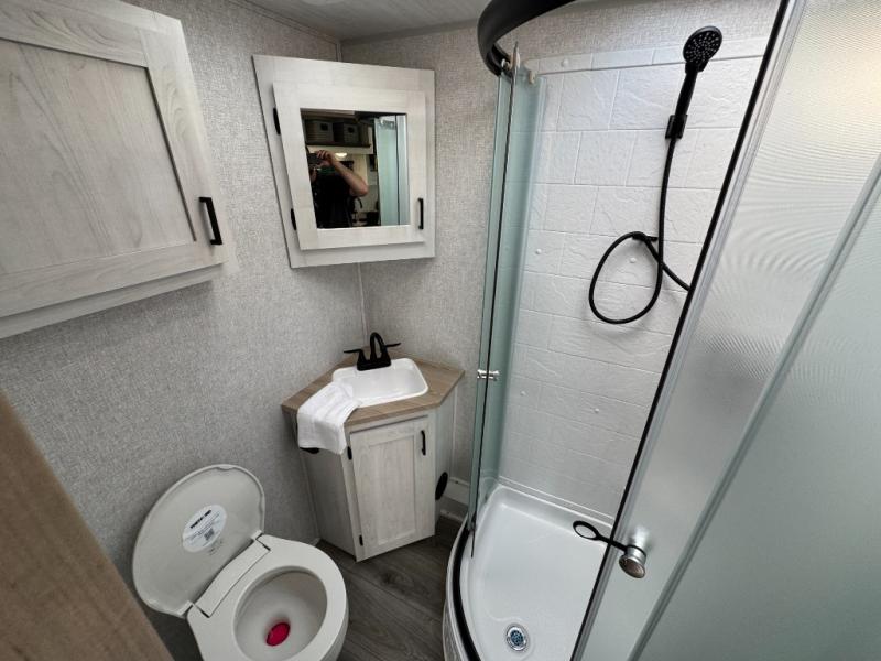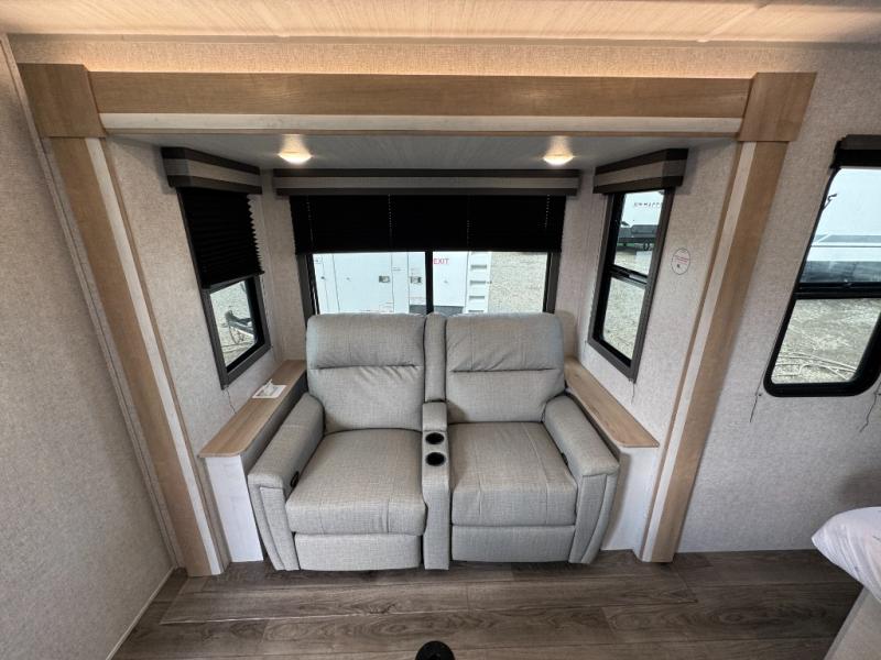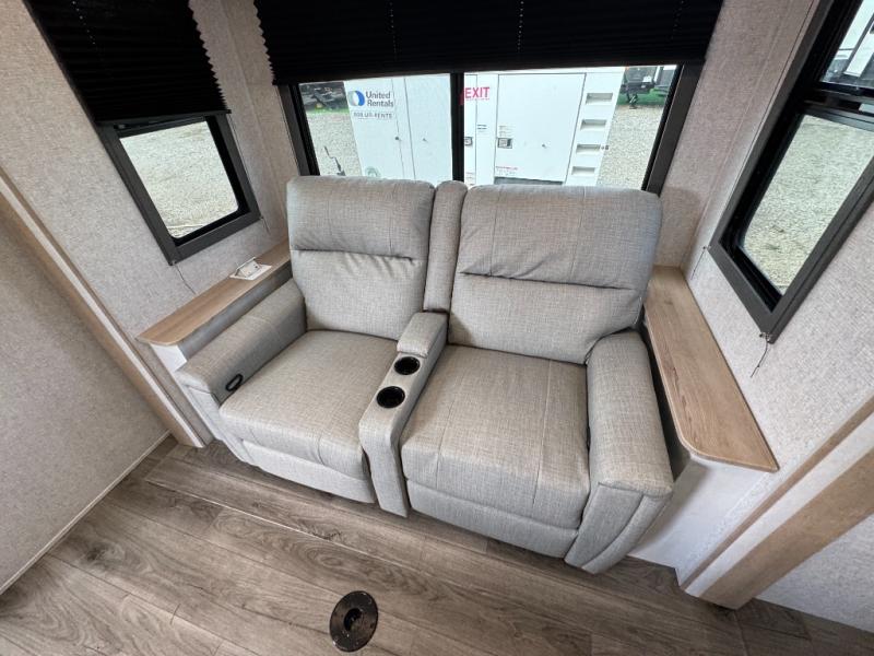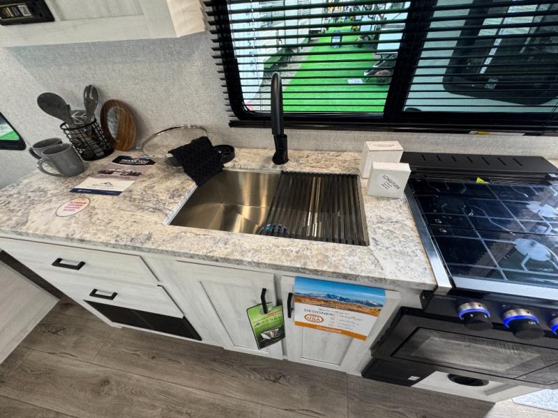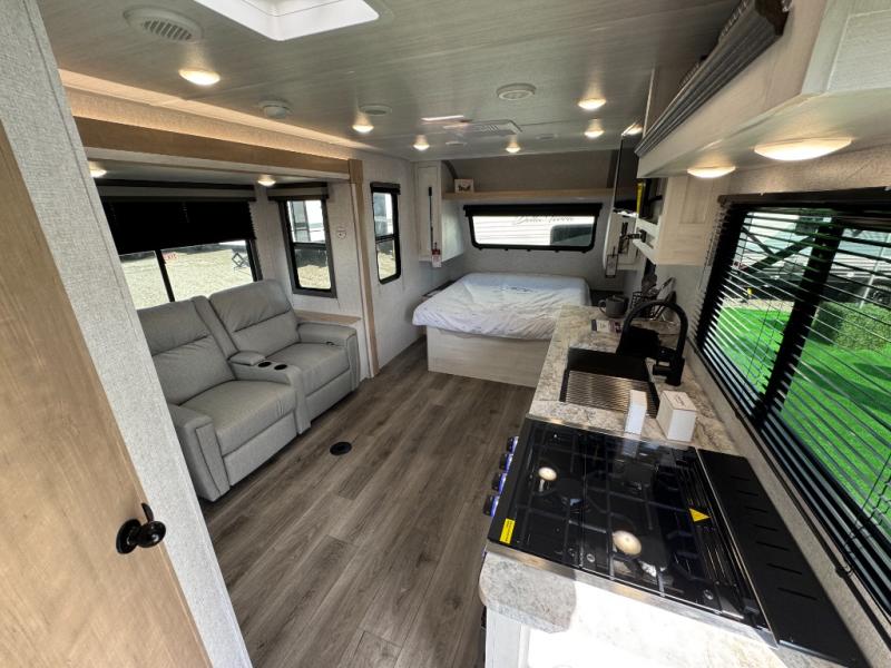 Pack your bags and head out on a fun vacation with your loved one in this travel trailer! You will get a good night's rest each night on the front queen bed with wardrobes on either side for your clothes. Freshen up each morning in the full corner bathroom with the radius shower with a skylight above to add natural lighting. The kitchen has everything you need to prepare a delicious home cooked meal including a countertop extension and air fryer microwave. Enjoy your meals at the tri-fold sofa slide with a dinette table in front of it or switch out the sofa for the optional theater seating!