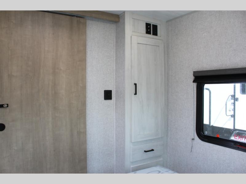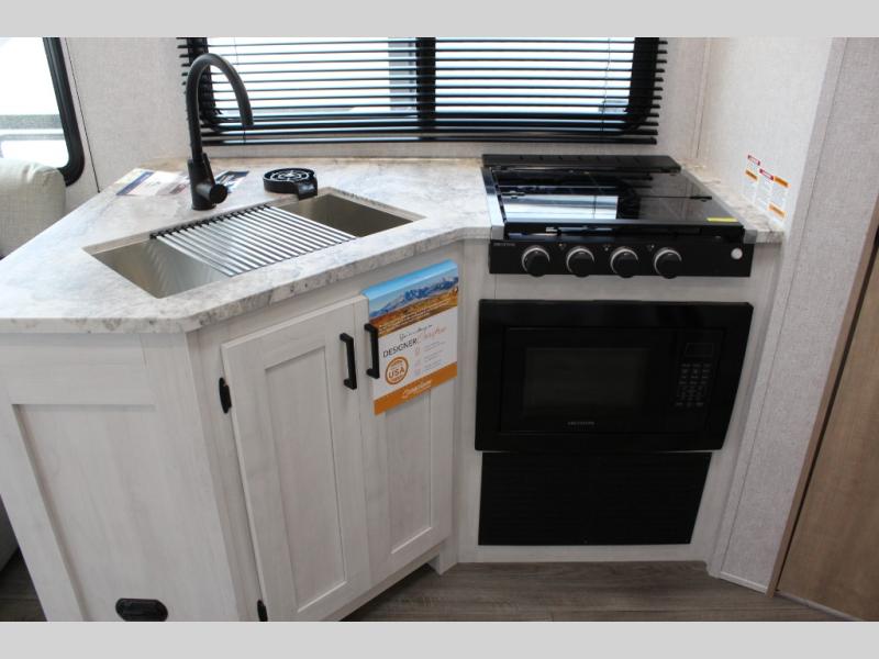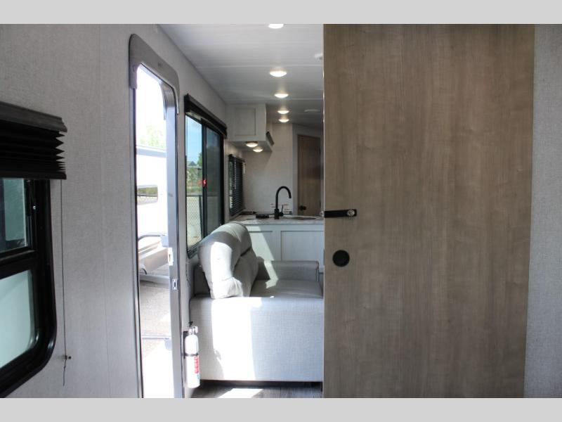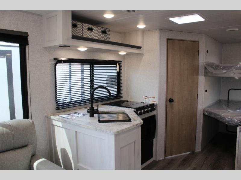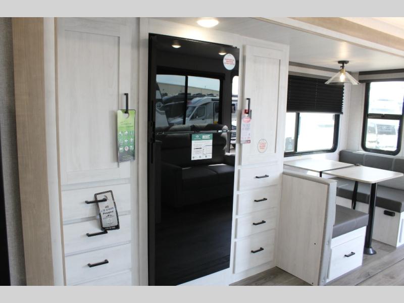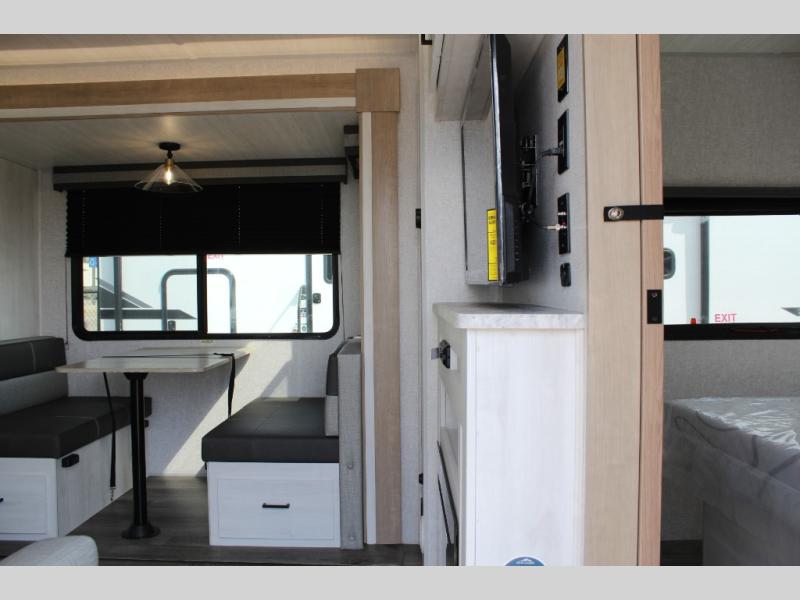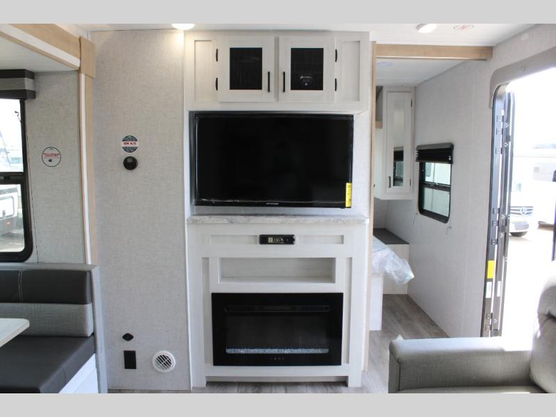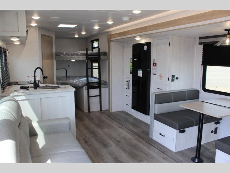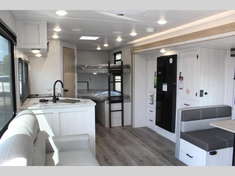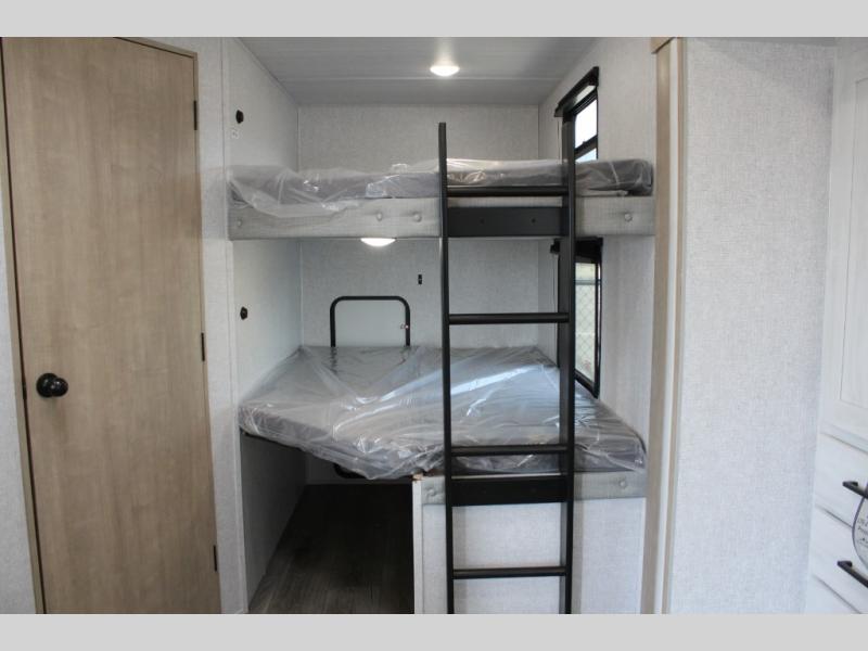 The whole family will have a fun time camping in this travel trailer! The kiddos or guests can sleep on the rear corner double over double bunk beds with additional storage, and you can sleep on the queen bed located in the front private bedroom. Everyone can rinse the sand out of their hair in the rear corner bathroom with the ABS tub surround, plus it has one of the dual entry doors. The fireplace adds comfort while you are relaxing on the tri-fold sofa which can be replaced for optional theater seating. With a countertop extension and air fryer microwave, the chef will have an easy time preparing delicious home cooked meals that can be enjoyed at the booth dinette with storage underneath. There is not only an interior 10.7 cu. ft. residential inspired refrigerator, but also an exterior 1.6 cu. ft. refrigerator. There is plenty of exterior storage and even an outside shower with hot and cold water!