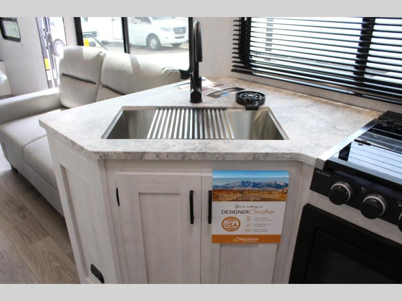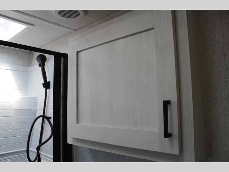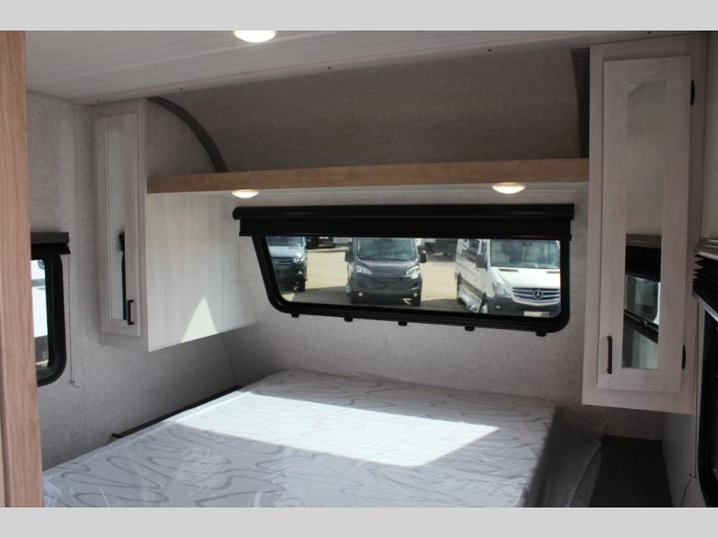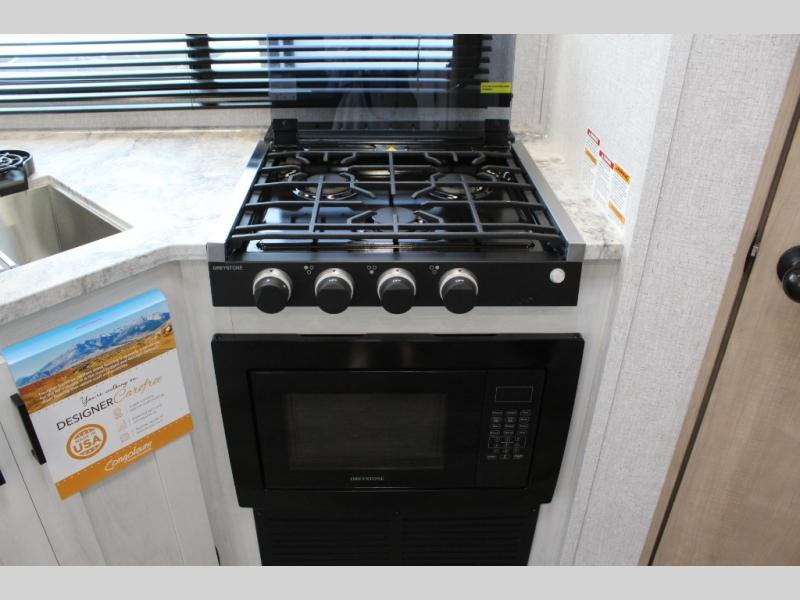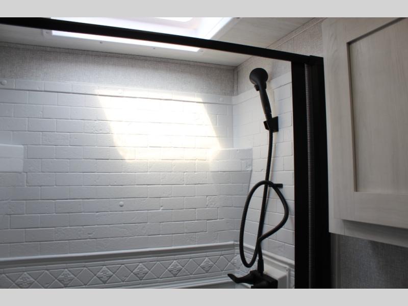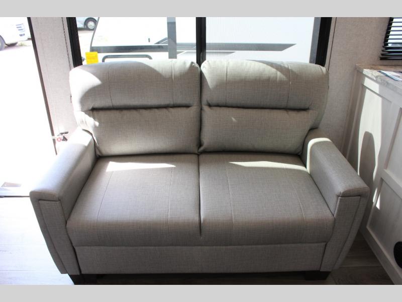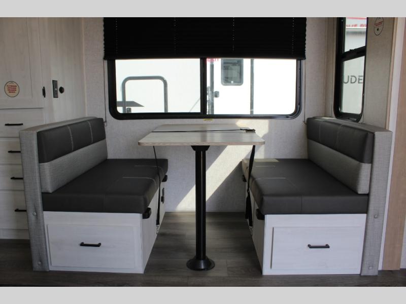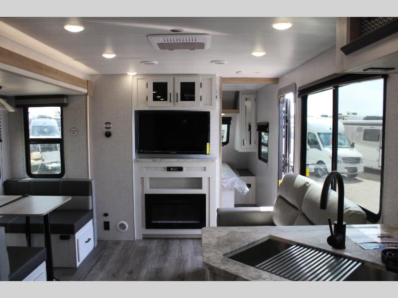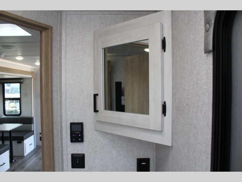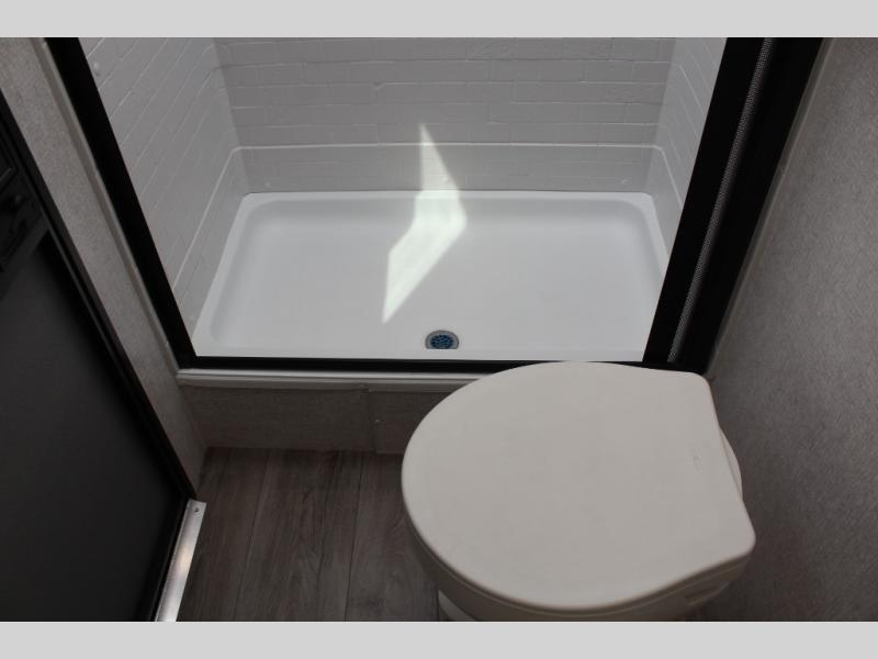 The whole family will have a fun time camping in this travel trailer! The kiddos or guests can sleep on the rear corner double over double bunk beds with additional storage, and you can sleep on the queen bed located in the front private bedroom. Everyone can rinse the sand out of their hair in the rear corner bathroom with the ABS tub surround, plus it has one of the dual entry doors. The fireplace adds comfort while you are relaxing on the tri-fold sofa which can be replaced for optional theater seating. With a countertop extension and air fryer microwave, the chef will have an easy time preparing delicious home cooked meals that can be enjoyed at the booth dinette with storage underneath. There is not only an interior 10.7 cu. ft. residential inspired refrigerator, but also an exterior 1.6 cu. ft. refrigerator. There is plenty of exterior storage and even an outside shower with hot and cold water!