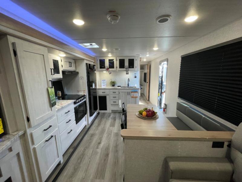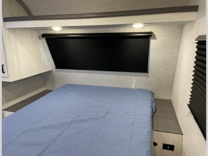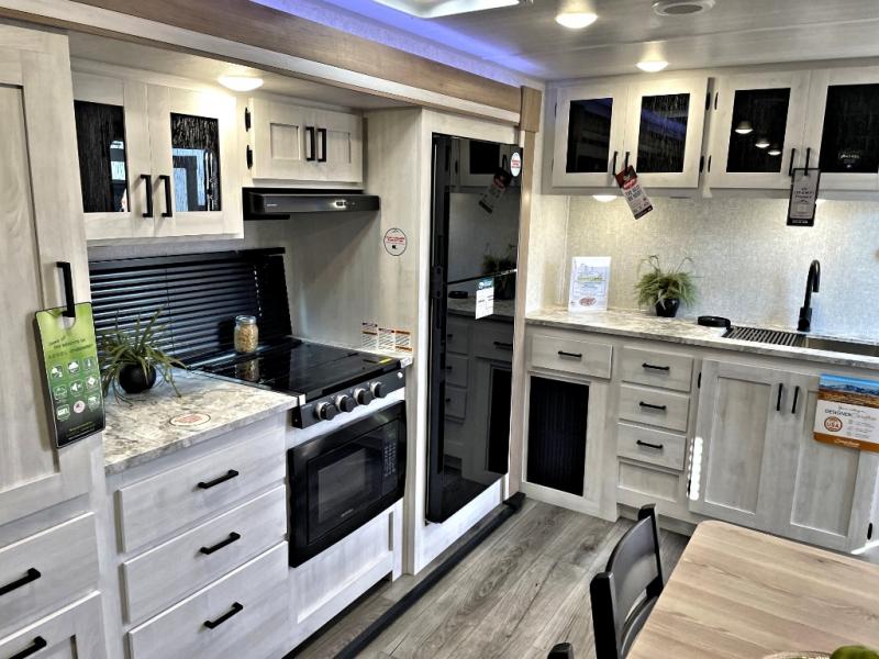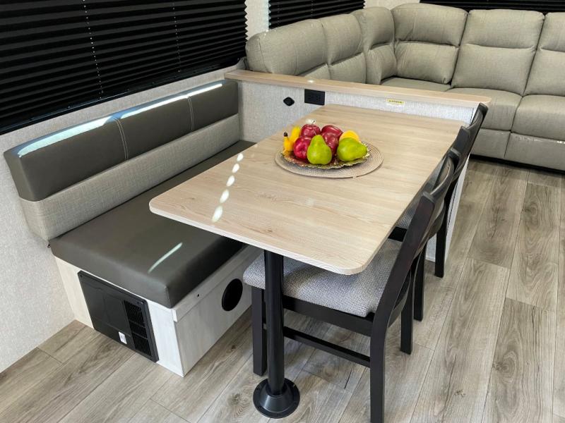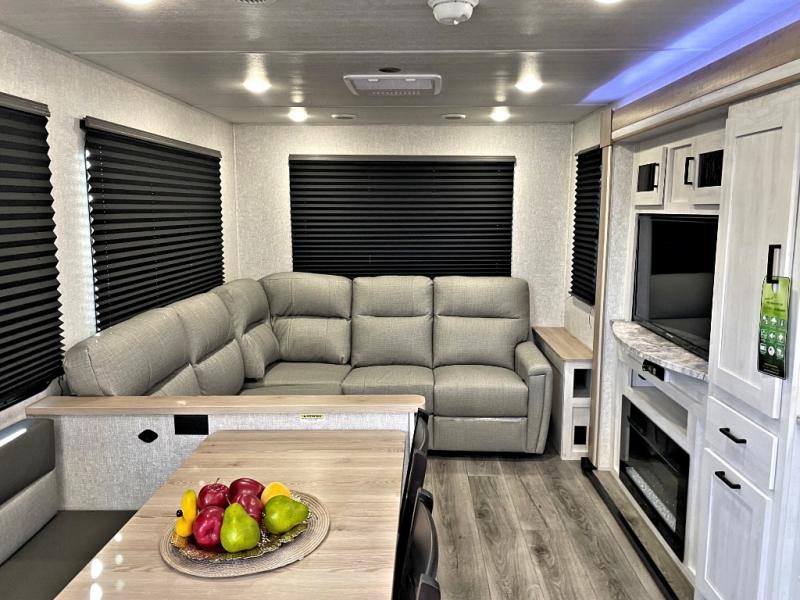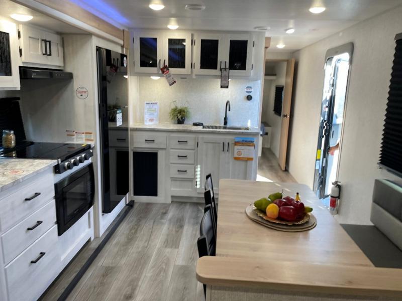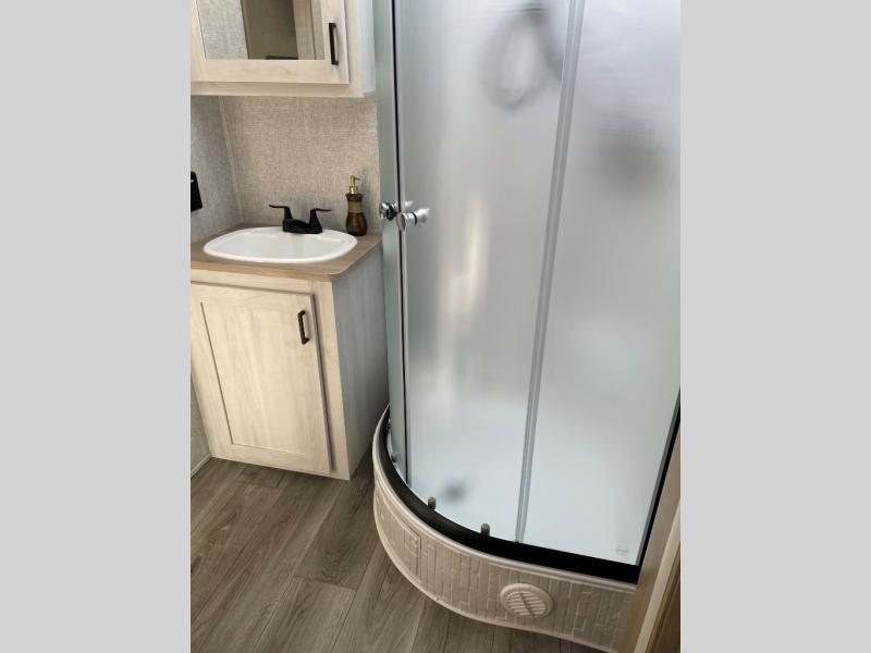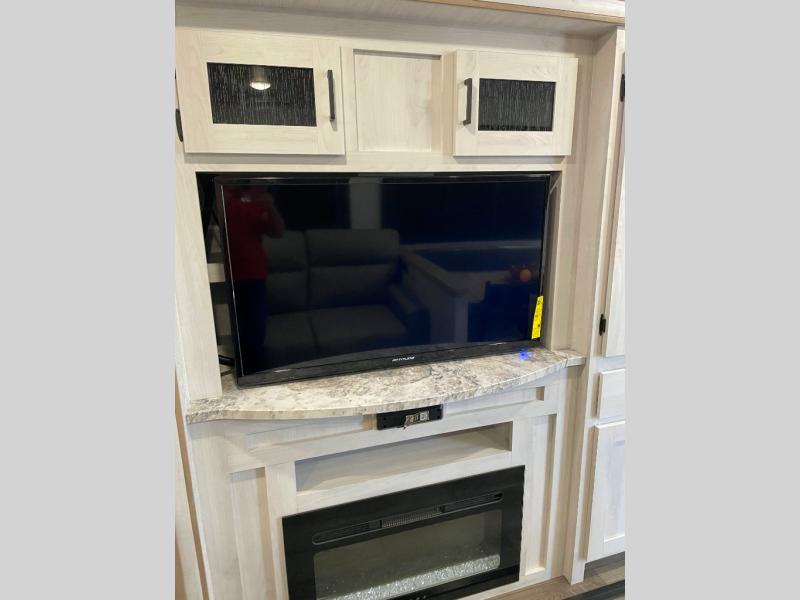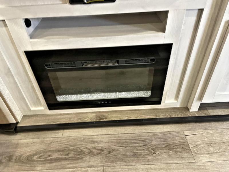 You won't believe the comfort that is found in this travel trailer! The rear living area will be a favorite place to relax with its large L-shaped sofa and fireplace, and the large slide out here will give the chef plenty of space to prepare meals in the kitchen. A 48" dinette with bench seating on one side and two chairs on the other provide a place to dine together, or you may just find yourselves eating outdoors under the 21' patio awning. There is also storage under the dinette, a large countertop with a sink, plus a kitchen pantry to keep snacks stocked. The front of this unit includes the master bedroom, complete with a queen bed, dual nightstands, and a second slide out with the bedroom wardrobe and bath linen closet!