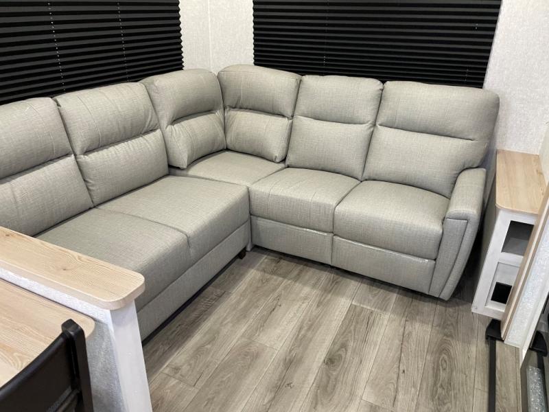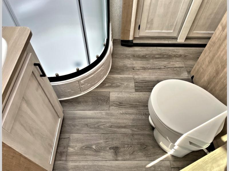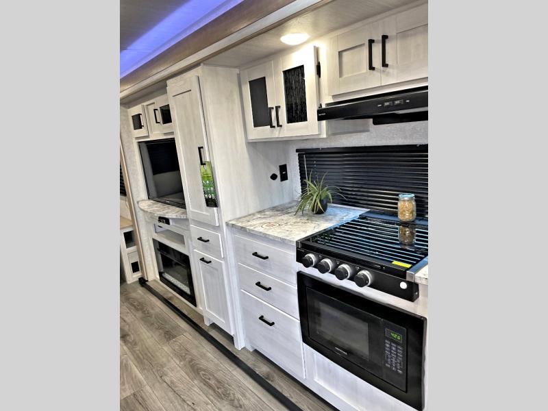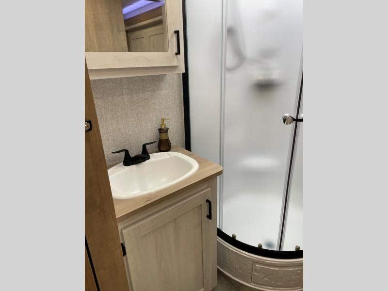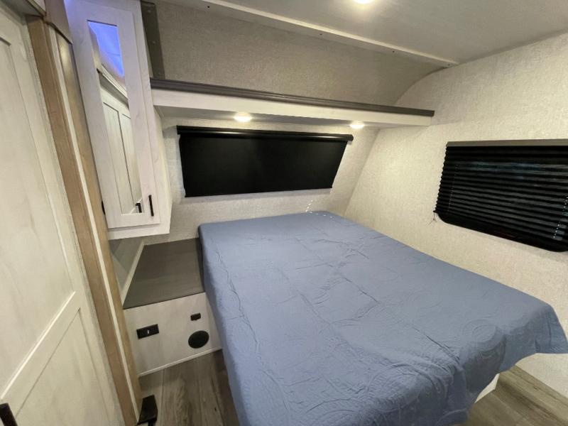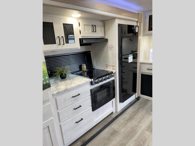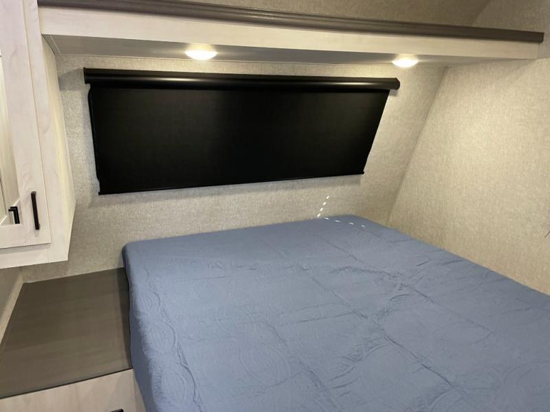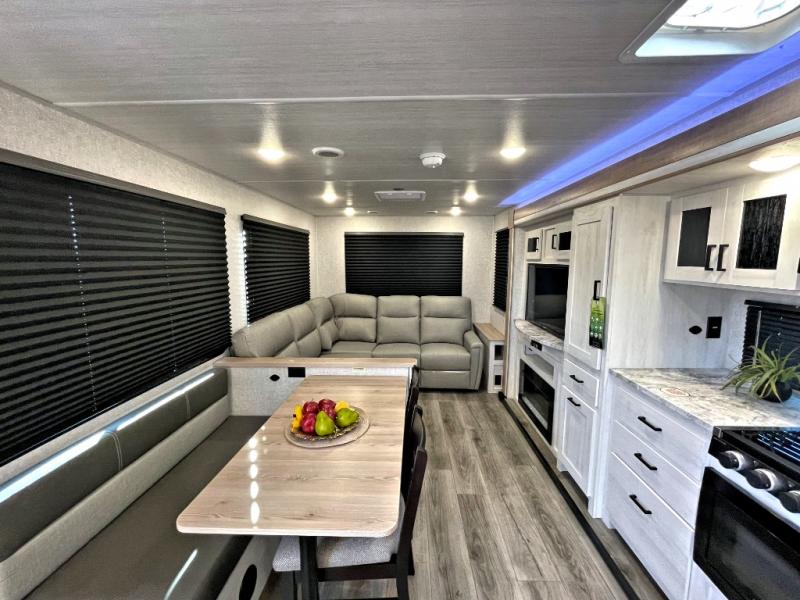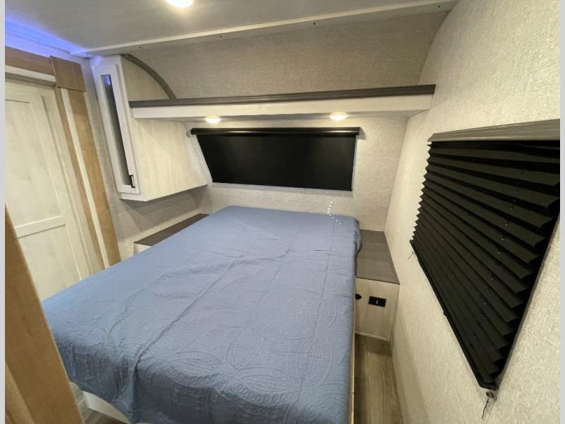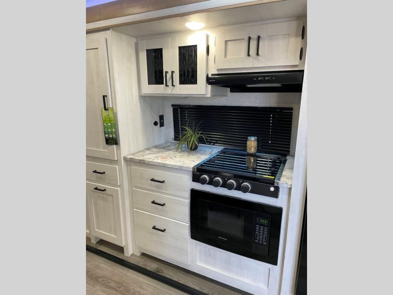You won't believe the comfort that is found in this travel trailer! The rear living area will be a favorite place to relax with its large L-shaped sofa and fireplace, and the large slide out here will give the chef plenty of space to prepare meals in the kitchen. A 48" dinette with bench seating on one side and two chairs on the other provide a place to dine together, or you may just find yourselves eating outdoors under the 21' patio awning. There is also storage under the dinette, a large countertop with a sink, plus a kitchen pantry to keep snacks stocked. The front of this unit includes the master bedroom, complete with a queen bed, dual nightstands, and a second slide out with the bedroom wardrobe and bath linen closet!