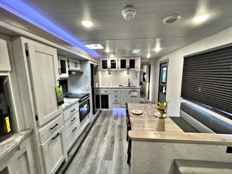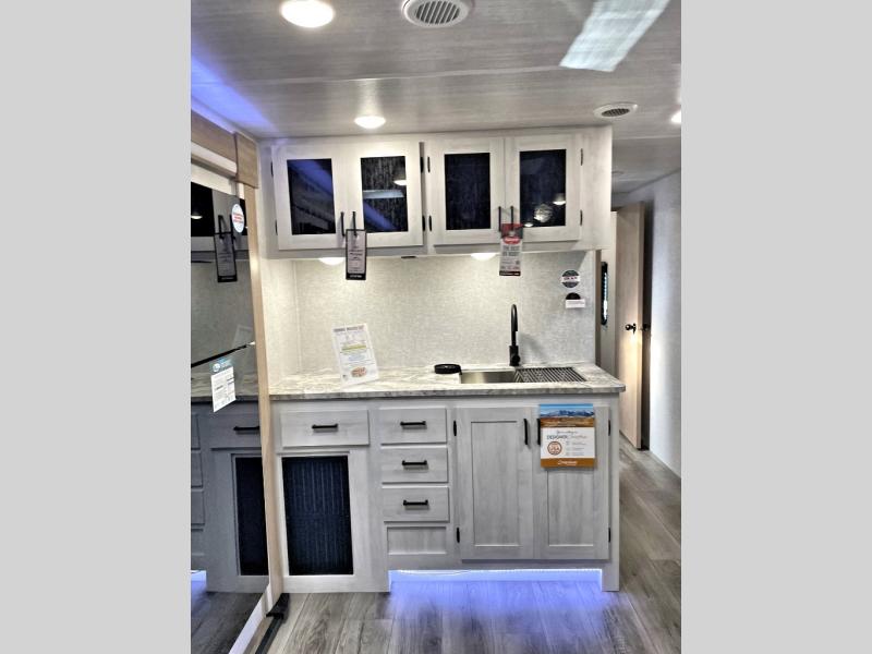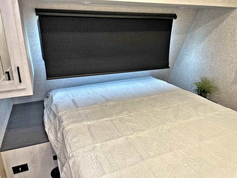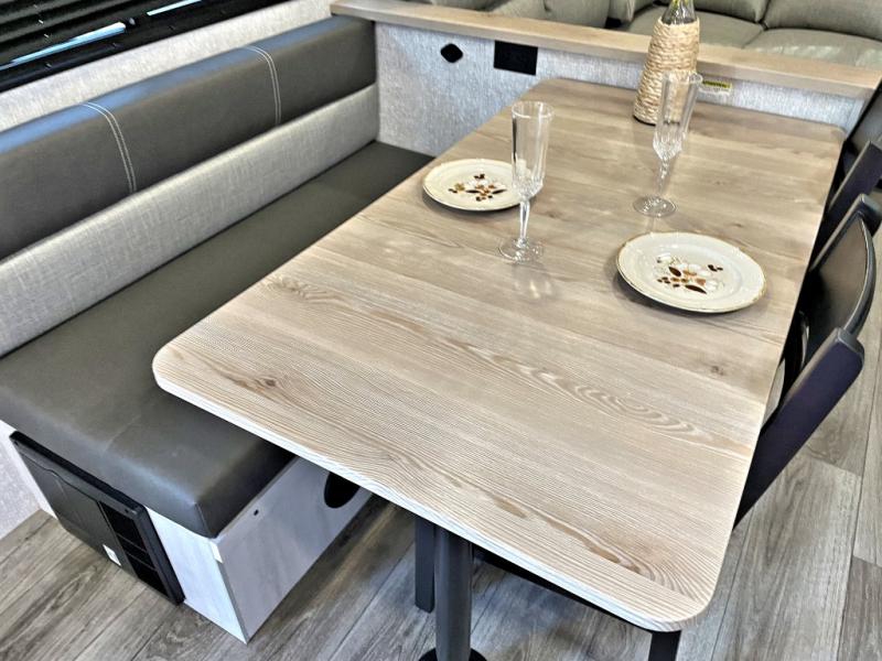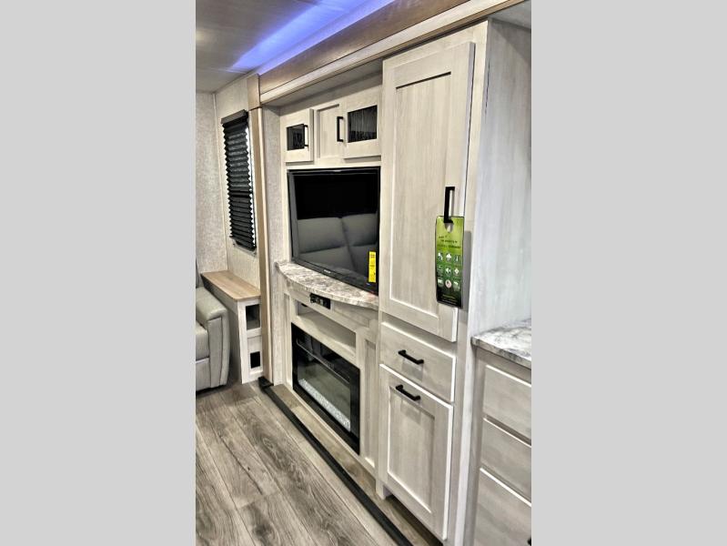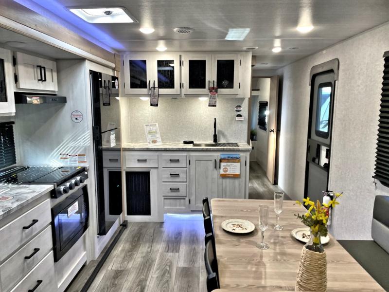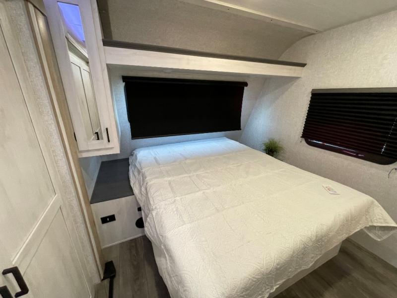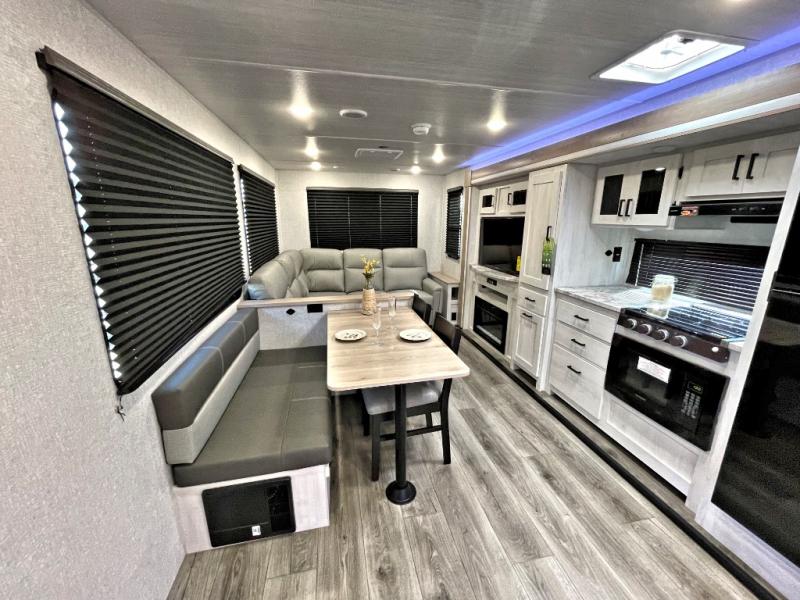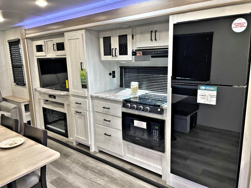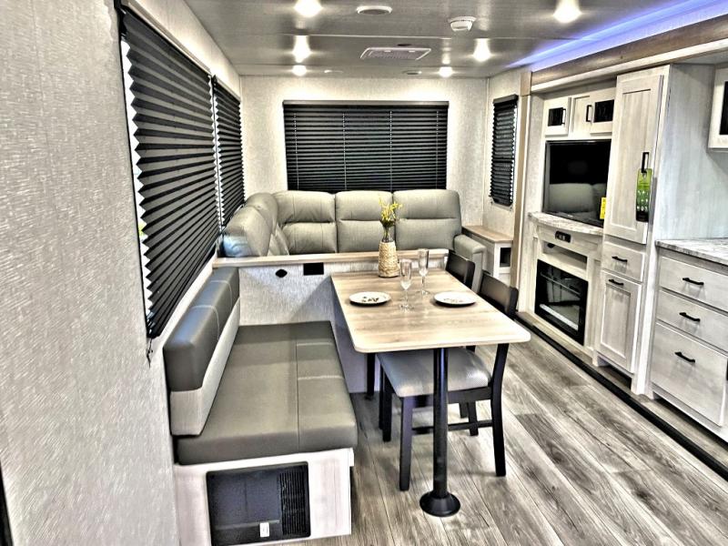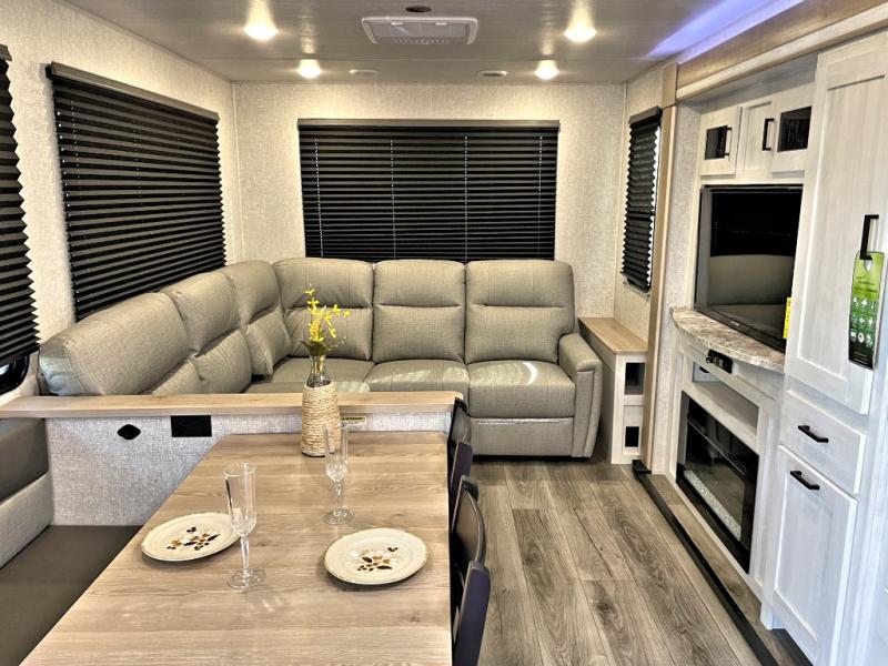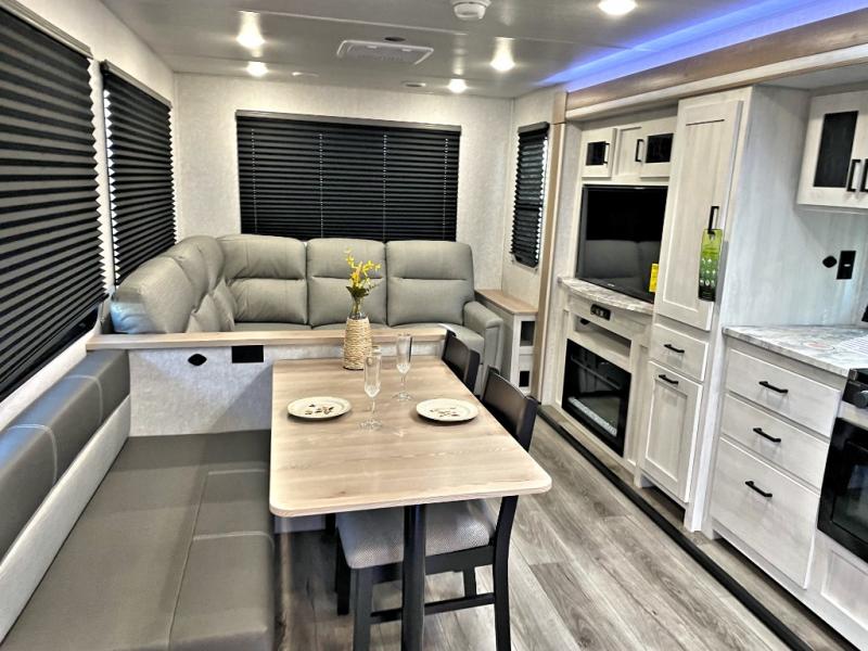 You won't believe the comfort that is found in this travel trailer! The rear living area will be a favorite place to relax with its large L-shaped sofa and fireplace, and the large slide out here will give the chef plenty of space to prepare meals in the kitchen. A 48" dinette with bench seating on one side and two chairs on the other provide a place to dine together, or you may just find yourselves eating outdoors under the 21' patio awning. There is also storage under the dinette, a large countertop with a sink, plus a kitchen pantry to keep snacks stocked. The front of this unit includes the master bedroom, complete with a queen bed, dual nightstands, and a second slide out with the bedroom wardrobe and bath linen closet!