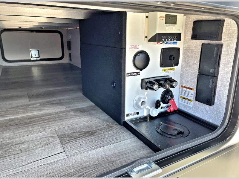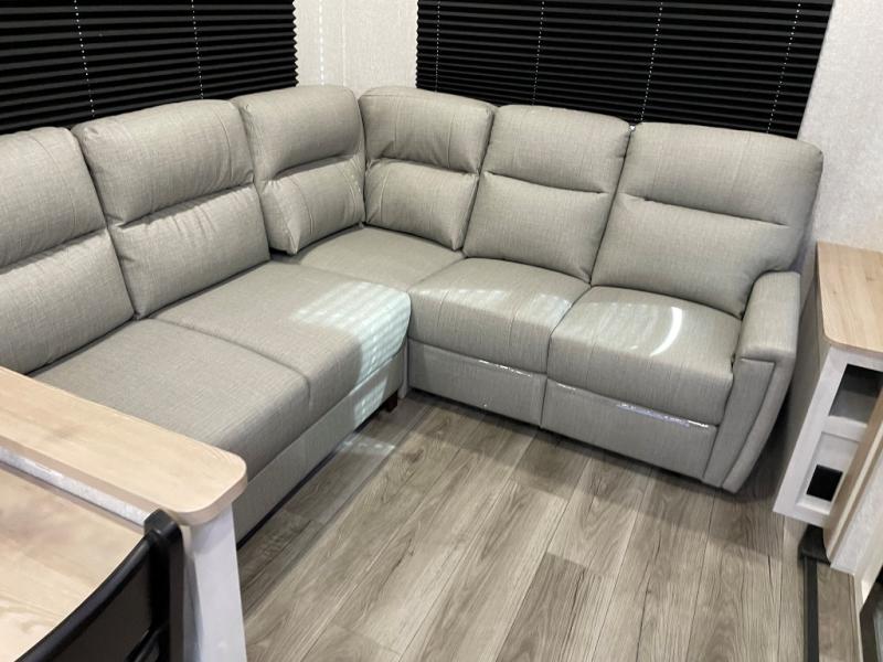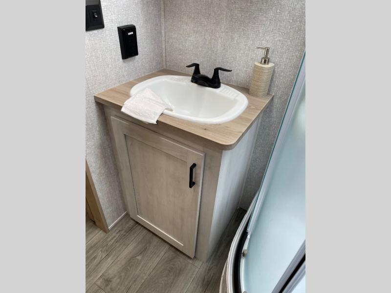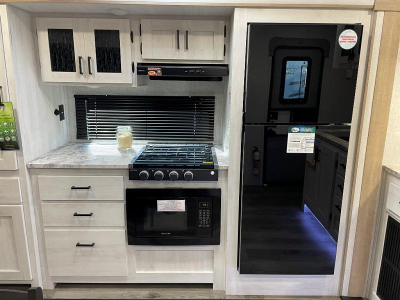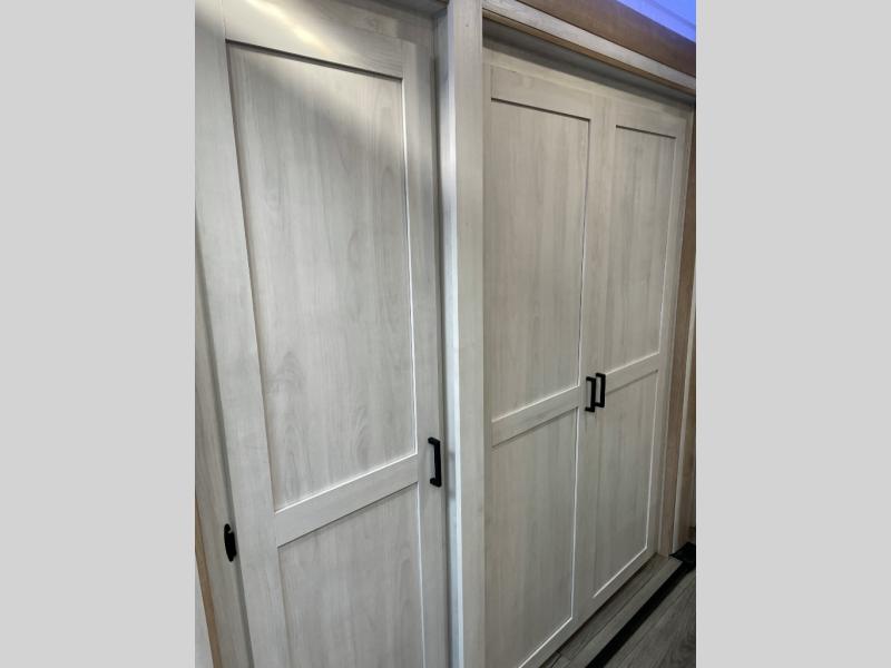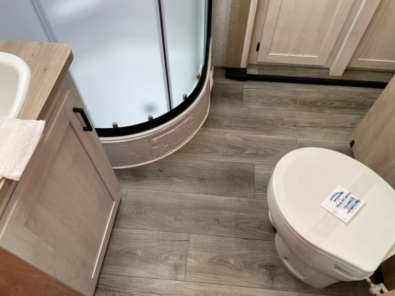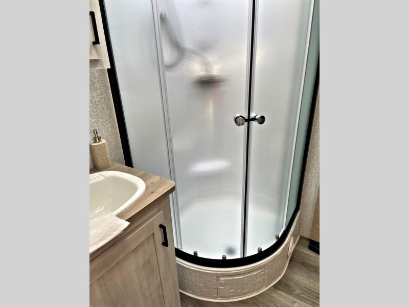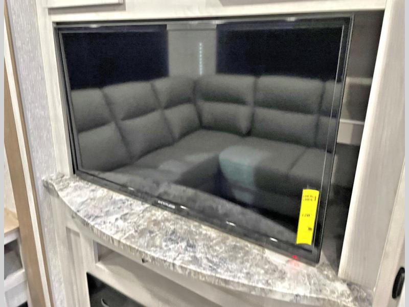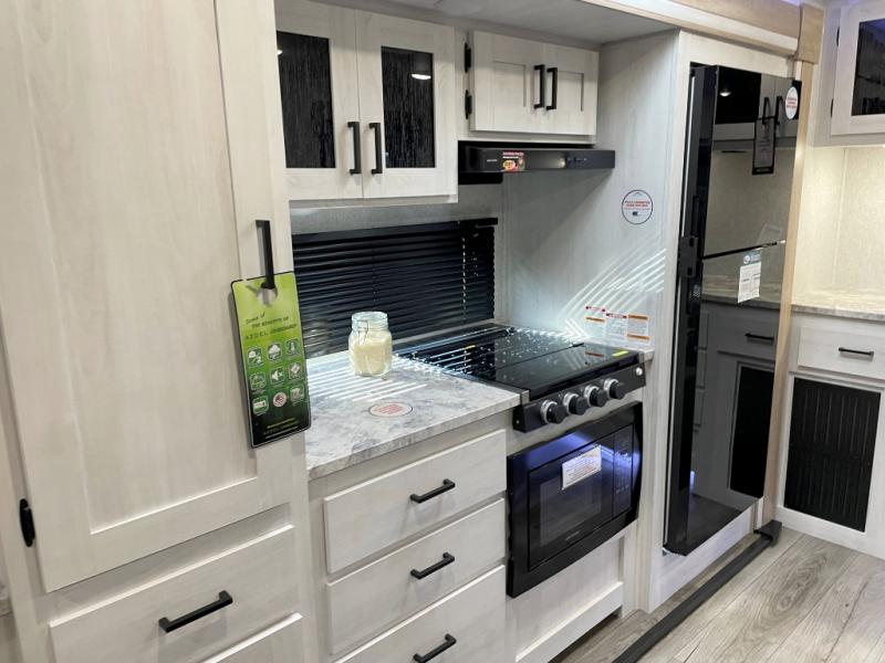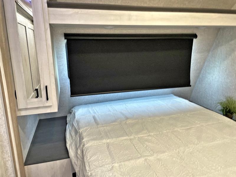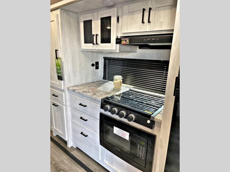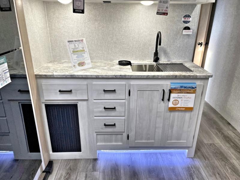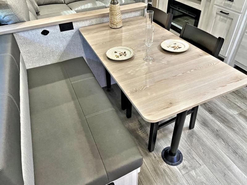 You won't believe the comfort that is found in this travel trailer! The rear living area will be a favorite place to relax with its large L-shaped sofa and fireplace, and the large slide out here will give the chef plenty of space to prepare meals in the kitchen. A 48" dinette with bench seating on one side and two chairs on the other provide a place to dine together, or you may just find yourselves eating outdoors under the 21' patio awning. There is also storage under the dinette, a large countertop with a sink, plus a kitchen pantry to keep snacks stocked. The front of this unit includes the master bedroom, complete with a queen bed, dual nightstands, and a second slide out with the bedroom wardrobe and bath linen closet!