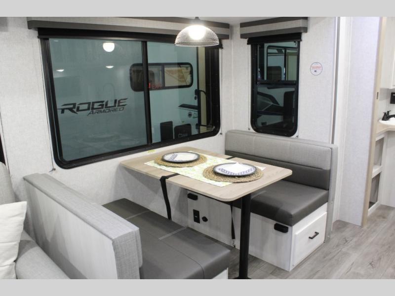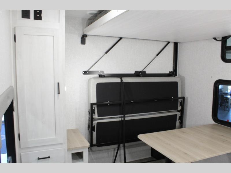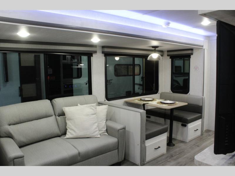 You won't want to pass up this spacious travel trailer that can sleep eight people thanks to the rear bunkhouse! Here, you'll find two flip-up sofas with a stowable bunk system, an end table and wardrobe, plus a bike door for easy access to camp gear. The owners will love the front master bedroom with its queen bed, dual wardrobes and overhead cabinets for their things. Everyone can meet in the combined kitchen and living room to relax on the sofa or booth dinette. The fireplace will make this space feel more like home, and the full kitchen will let you cook your favorite meals!
