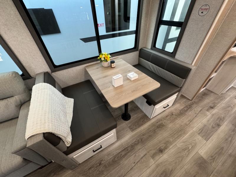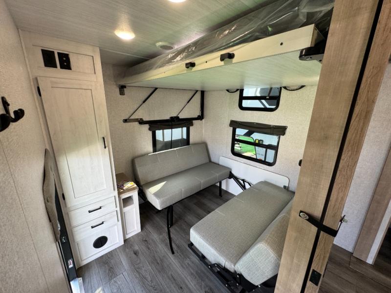 You won't want to pass up this spacious travel trailer that can sleep eight people thanks to the rear bunkhouse! Here, you'll find two flip-up sofas with a stowable bunk system, an end table and wardrobe, plus a bike door for easy access to camp gear. The owners will love the front master bedroom with its queen bed, dual wardrobes and overhead cabinets for their things. Everyone can meet in the combined kitchen and living room to relax on the sofa or booth dinette. The fireplace will make this space feel more like home, and the full kitchen will let you cook your favorite meals!