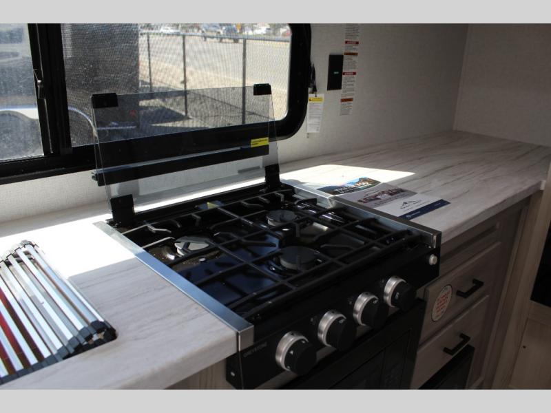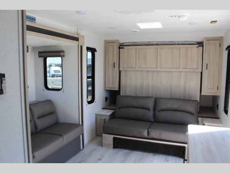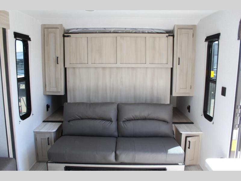 Head to the lake in this spacious travel trailer for three to four. You can wake up feeling refreshed each day on the front queen-size Murphy bed, and it easily folds up so you can enjoy the sofa during the day. There are also dual beside wardrobes and nightstands to keep your things tidy. A three burner cooktop and microwave oven will let you make your best meals, and there is ample counter space to set out snacks. This unit also includes a refrigerator and a pantry for extra food storage. And don't overlook the rear corner full bath, which will allow you to skip the camp's facilities!