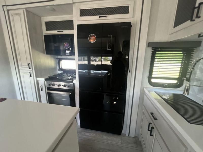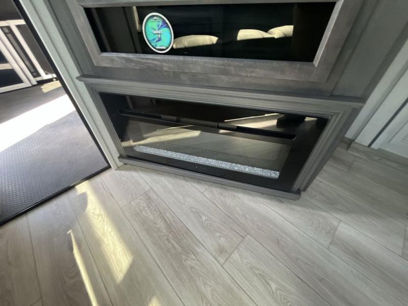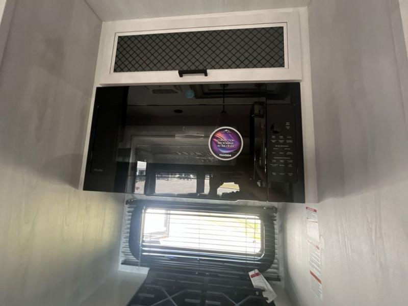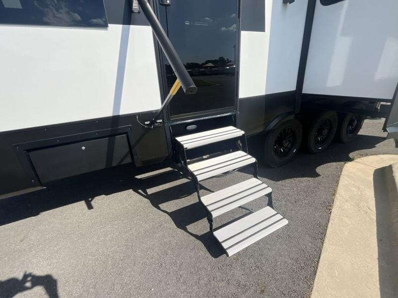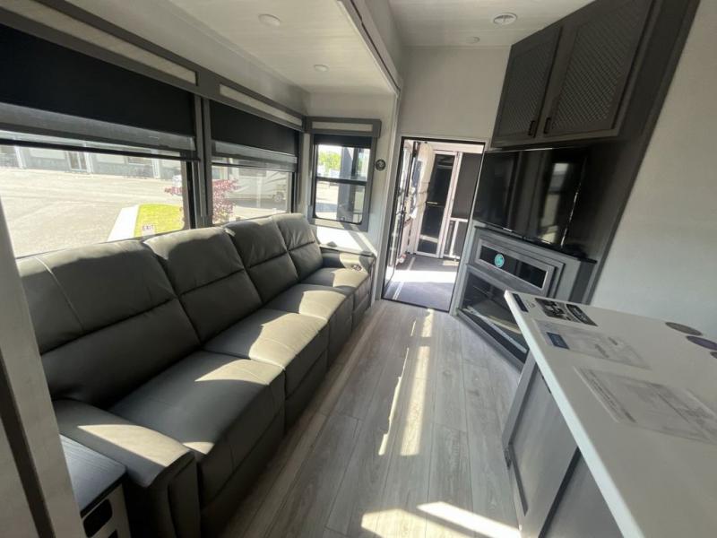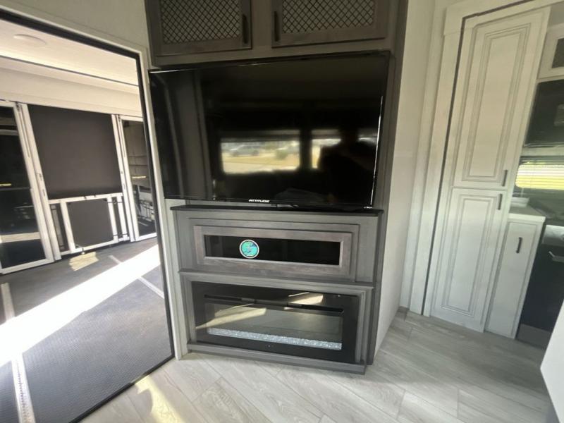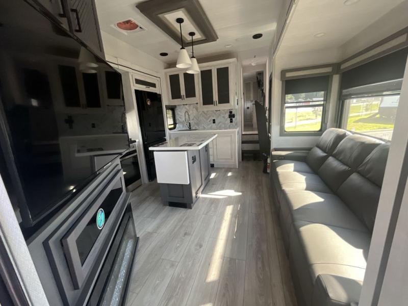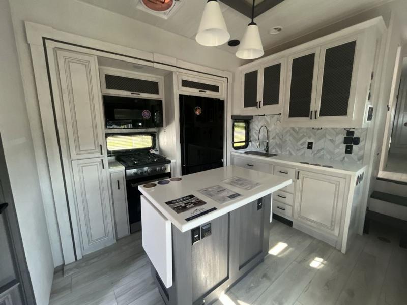 Your friends and family will be begging you to take them with you camping in this feature-packed fifth wheel! Once your toys are unloaded from the separate garage, you can enjoy the 3-seasons door with tinted sliding windows and the rear deck system with an awning and steps. Your guests can sleep here at night since there is a drop-down queen bed, two happijac sofas, plus a loft with a ladder and a 28" x 70" mat. There is even a half bath here for convenience! The main living area will be a favorite place to visit together with its large sofa, 50" TV with a fireplace, and spacious kitchen island with two stools and countertop extensions. The chef of your group will also love the additional counter space and deep-seated stainless steel farmhouse sink, the GE Profile free-standing gas range and convection microwave/air fryer, plus the 16 cu. ft. 12V French door refrigerator with a double drawer freezer. Everyone can take turns cleaning up in the full bath towards the front, and you are sure to enjoy the front private bedroom all to yourselves. Here, you'll find a king bed slide out with bedside shelves and underbed storage, a dresser with a 32" TV, plus a front wardrobe and a wardrobe with washer/dryer prep!