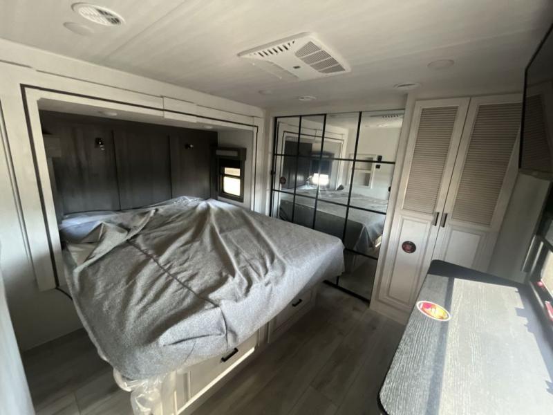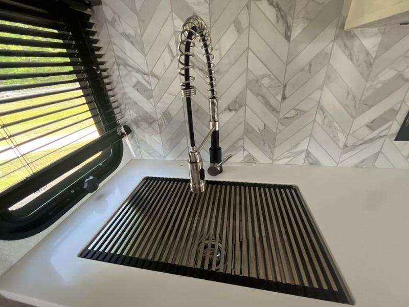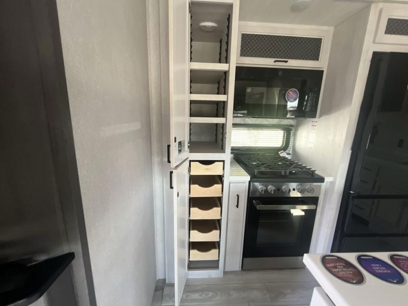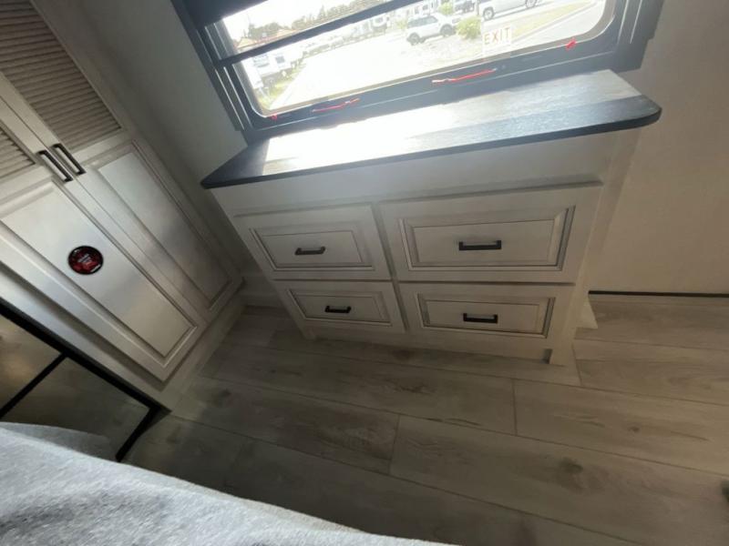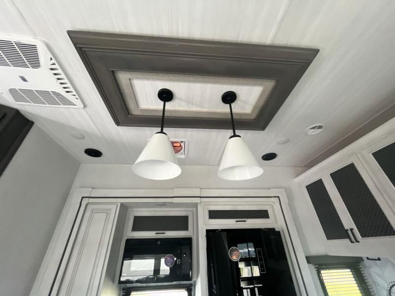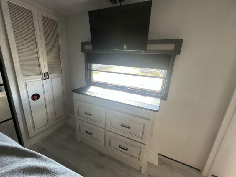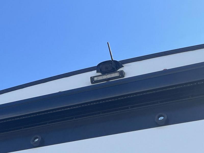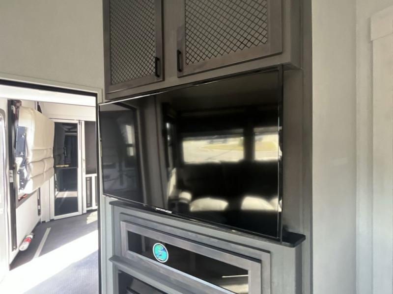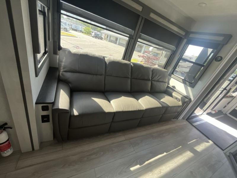 Your friends and family will be begging you to take them with you camping in this feature-packed fifth wheel! Once your toys are unloaded from the separate garage, you can enjoy the 3-seasons door with tinted sliding windows and the rear deck system with an awning and steps. Your guests can sleep here at night since there is a drop-down queen bed, two happijac sofas, plus a loft with a ladder and a 28" x 70" mat. There is even a half bath here for convenience! The main living area will be a favorite place to visit together with its large sofa, 50" TV with a fireplace, and spacious kitchen island with two stools and countertop extensions. The chef of your group will also love the additional counter space and deep-seated stainless steel farmhouse sink, the GE Profile free-standing gas range and convection microwave/air fryer, plus the 16 cu. ft. 12V French door refrigerator with a double drawer freezer. Everyone can take turns cleaning up in the full bath towards the front, and you are sure to enjoy the front private bedroom all to yourselves. Here, you'll find a king bed slide out with bedside shelves and underbed storage, a dresser with a 32" TV, plus a front wardrobe and a wardrobe with washer/dryer prep!