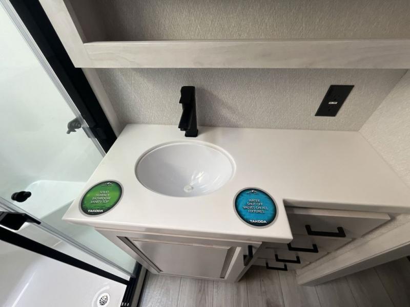 With any Takoda toy hauler fifth wheel by EAST TO WEST, you will be able to enjoy your RV for years to come thanks to the durable materials that includes Dicor Tufflex PVC roofing, a Crane Gold high-gloss gel coated fiberglass exterior, and 2" thick double-welded aluminum framed construction. You will love how easy it will be to bring your toys along with a 5500-watt NPS gas generator, two 30 gallon fuel tanks with a pump station, and a 102" wide-body chassis with drop-frame storage. You will also find an 860 watt solar system outside, along with a universal all-in-one docking station, 6-point hydraulic automatic leveling for easy set up, and many more exterior conveniences. The Comfort Package will bring you just that with a high-efficiency triple A/C system, a 40,000 BTU high-capacity furnace, 12V heat pads on holding tanks, and dual attics vents. The interior also includes oversized deluxe entrance doors, a seamless fiberglass shower, day and night Slow Rise roller shades, plus vinyl flooring in the living area, kitchen, bath, and bedroom; that's right, no carpet means easy cleaning!