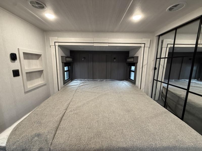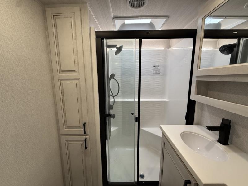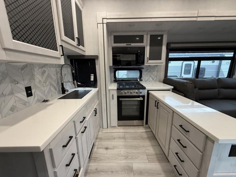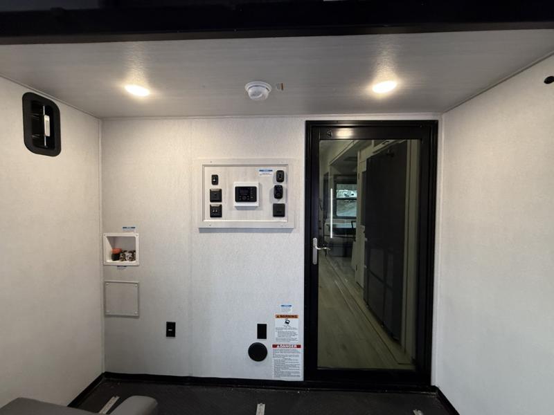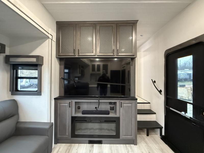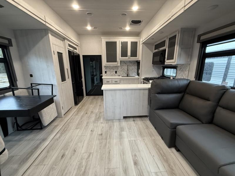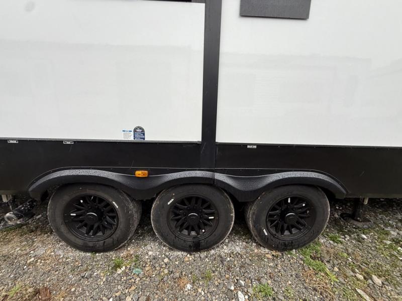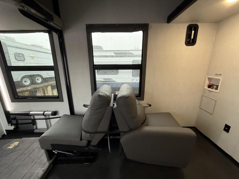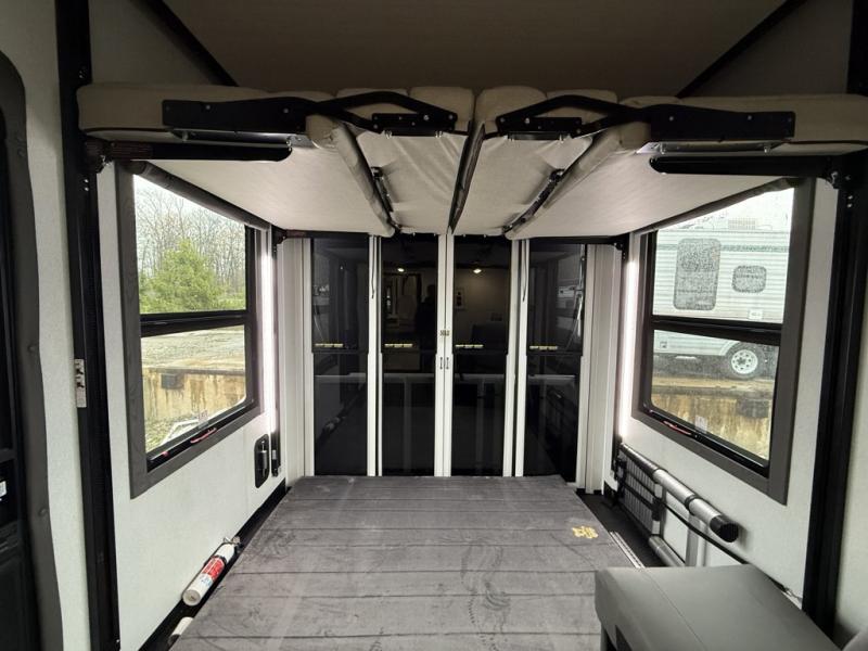A toy hauler for all family members! The front bedroom features a plush king bed with storage underneath and shelves beside the bed, plus, a sliding dresser top, hidden storage, and a spacious closet. The full bathroom boasts a linen closet and a spacious 38” x 42” shower, ideal for freshening up after a hot day. The living room is a haven of entertainment, equipped with an entertainment center featuring a fireplace and EZ out sofa, perfect for cozy nights in. Moving to the kitchen, you will find a four-burner cooktop, 16 cu. refrigerator, 30” convection microwave, overhead cabinets, pantry, shelves, a free-standing dinette and a bar top prep, perfect to give you an at-home experience. The garage is the ultimate adventure zone, featuring a 28 x 27 bunk mat above, a washer and dryer prep below, a dual Happijac sofa, a queen bed above and in-floor storage, perfect for toys, gear, or just relaxing with friends! Step outside and enjoy the patio kit/ramp door, two entry/two exit doors, and ample shade from the 8’, 10’ 9”, and 16” awnings. With its unique blend of comfort, style, and adventure-ready features, this toy hauler is the perfect vehicle for anyone looking to hit the open road and make unforgettable memories.