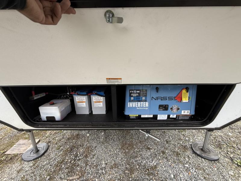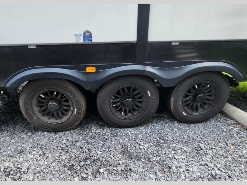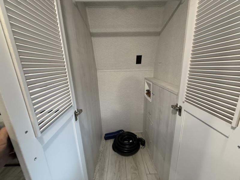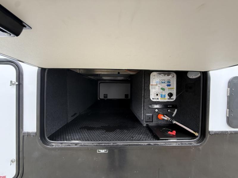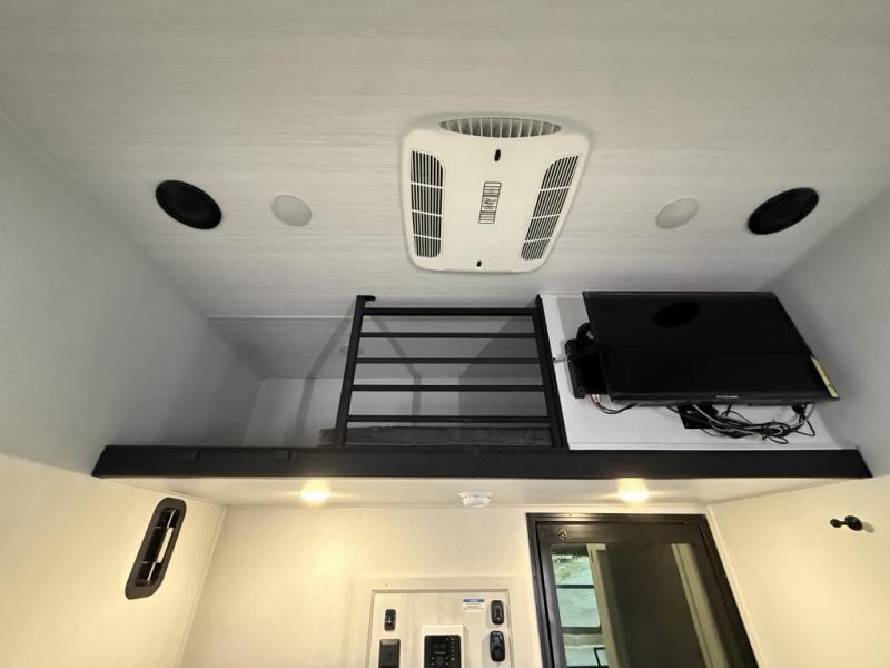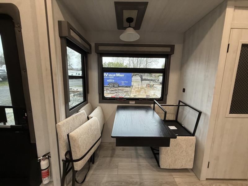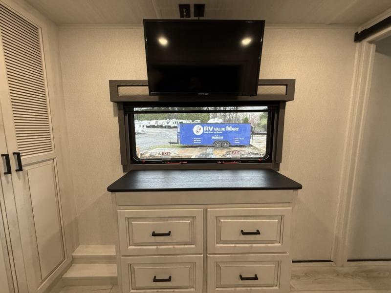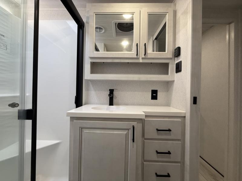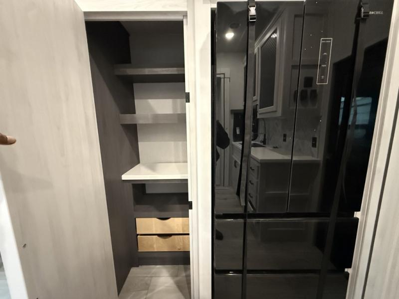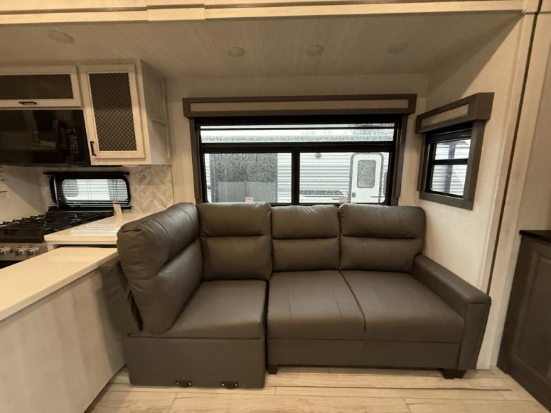 A toy hauler for all family members! The front bedroom features a plush king bed with storage underneath and shelves beside the bed, plus, a sliding dresser top, hidden storage, and a spacious closet. The full bathroom boasts a linen closet and a spacious 38” x 42” shower, ideal for freshening up after a hot day. The living room is a haven of entertainment, equipped with an entertainment center featuring a fireplace and EZ out sofa, perfect for cozy nights in. Moving to the kitchen, you will find a four-burner cooktop, 16 cu. refrigerator, 30” convection microwave, overhead cabinets, pantry, shelves, a free-standing dinette and a bar top prep, perfect to give you an at-home experience. The garage is the ultimate adventure zone, featuring a 28 x 27 bunk mat above, a washer and dryer prep below, a dual Happijac sofa, a queen bed above and in-floor storage, perfect for toys, gear, or just relaxing with friends! Step outside and enjoy the patio kit/ramp door, two entry/two exit doors, and ample shade from the 8’, 10’ 9”, and 16” awnings. With its unique blend of comfort, style, and adventure-ready features, this toy hauler is the perfect vehicle for anyone looking to hit the open road and make unforgettable memories.