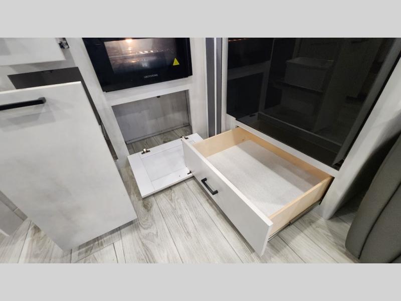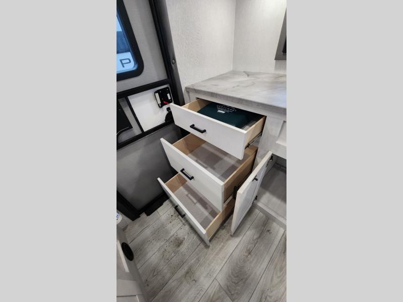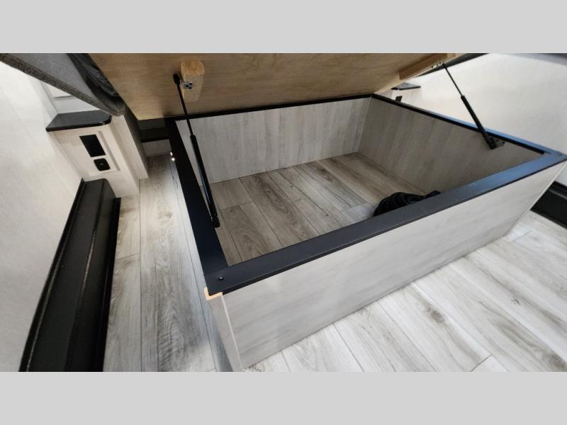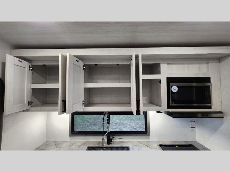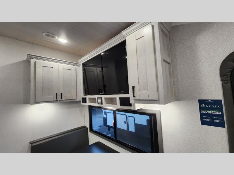 This fifth wheel is perfect for a couple who wishes to escape the hustle and bustle of everyday life! The front private bedroom has a king bed with storage underneath to store extra blankets and a TV prep area for extra entertainment. Freshen up each morning in the full bathroom with the 30" x 36" shower with a skylight for added natural lighting. The rear kitchen has everything you need to prepare your best home cooked meals and a 10 cu. ft. refrigerator to keep your perishables fresh. The booth dinette offers a comfortable place to enjoy your meals, play games, and even transform into an extra sleeping space. Across from the 78" theater seating is a 50" TV at the entertainment center above the dinette. You also have a shoe storage area and overhead cabinets throughout to keep your items out of the way!