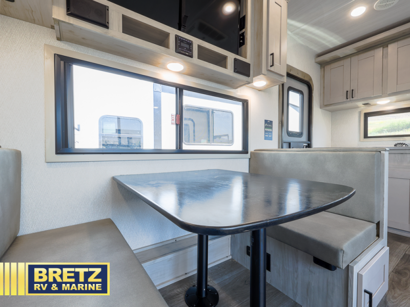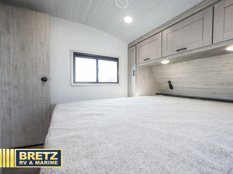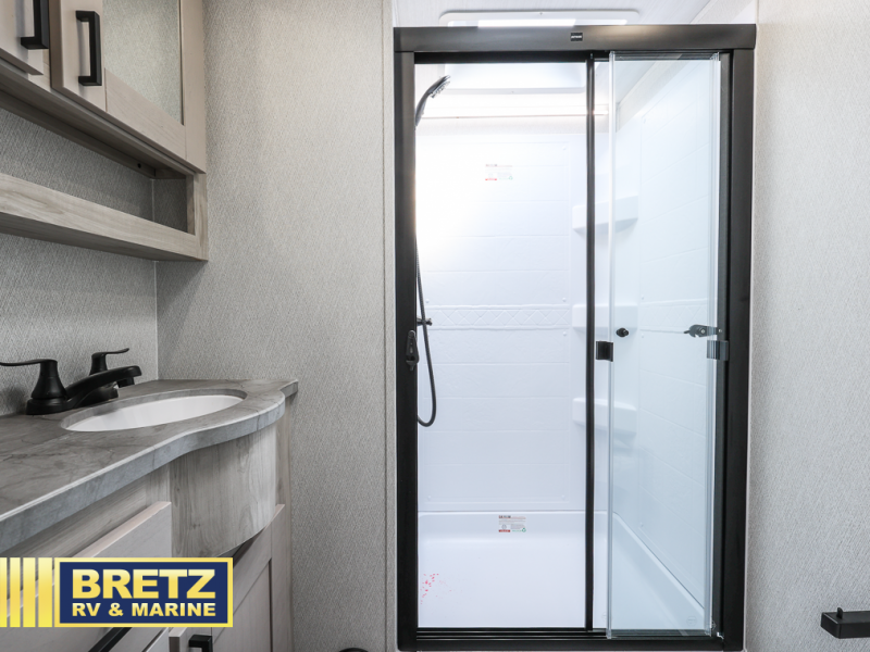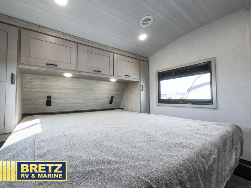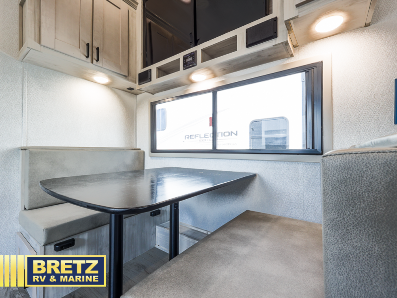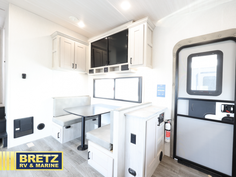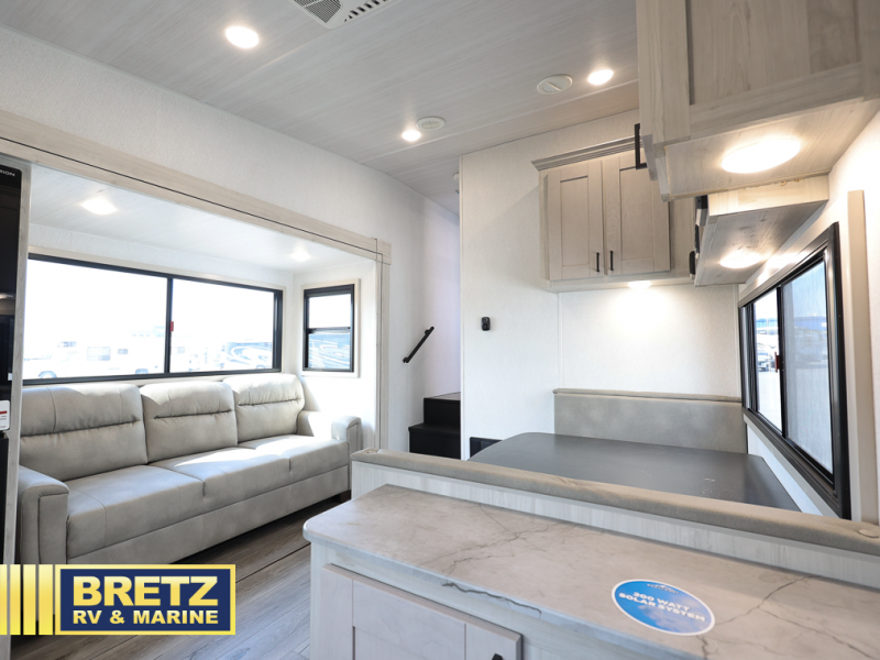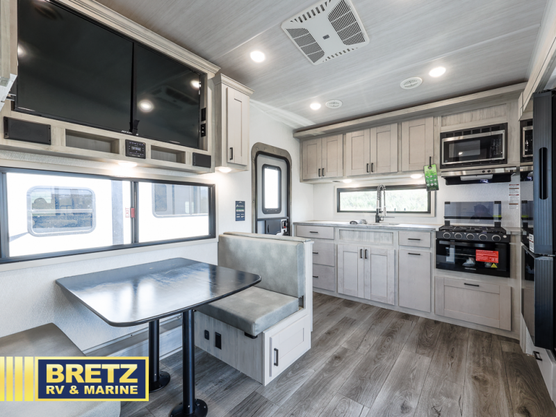 This fifth wheel is perfect for a couple who wishes to escape the hustle and bustle of everyday life! The front private bedroom has a king bed with storage underneath to store extra blankets and a TV prep area for extra entertainment. Freshen up each morning in the full bathroom with the 30" x 36" shower with a skylight for added natural lighting. The rear kitchen has everything you need to prepare your best home cooked meals and a 10 cu. ft. refrigerator to keep your perishables fresh. The booth dinette offers a comfortable place to enjoy your meals, play games, and even transform into an extra sleeping space. Across from the 78" theater seating is a 50" TV at the entertainment center above the dinette. You also have a shoe storage area and overhead cabinets throughout to keep your items out of the way!