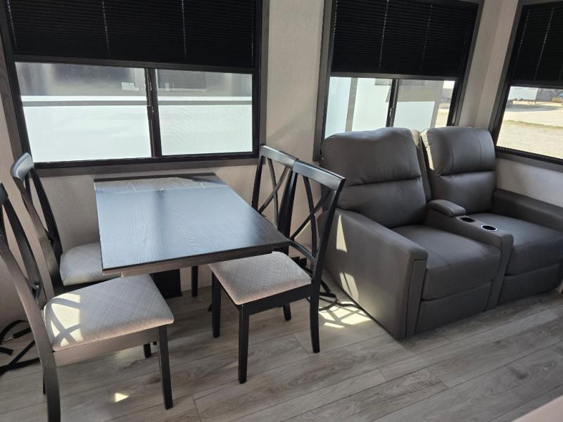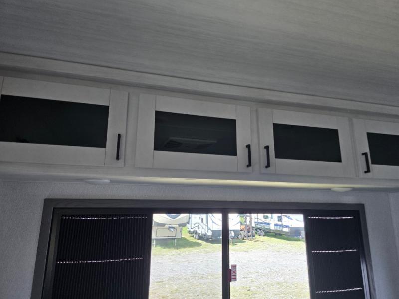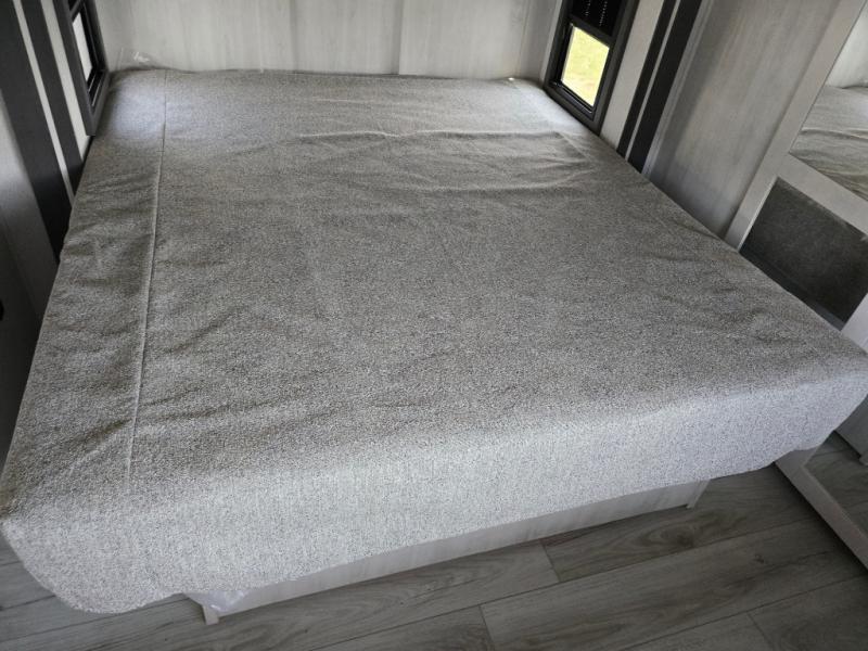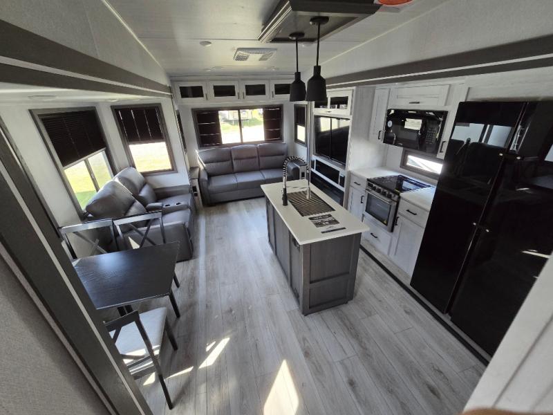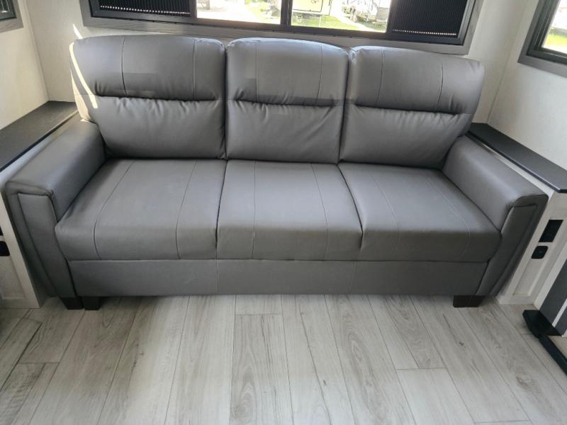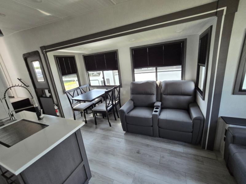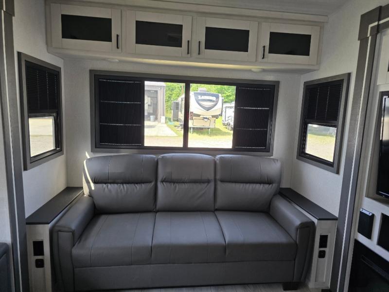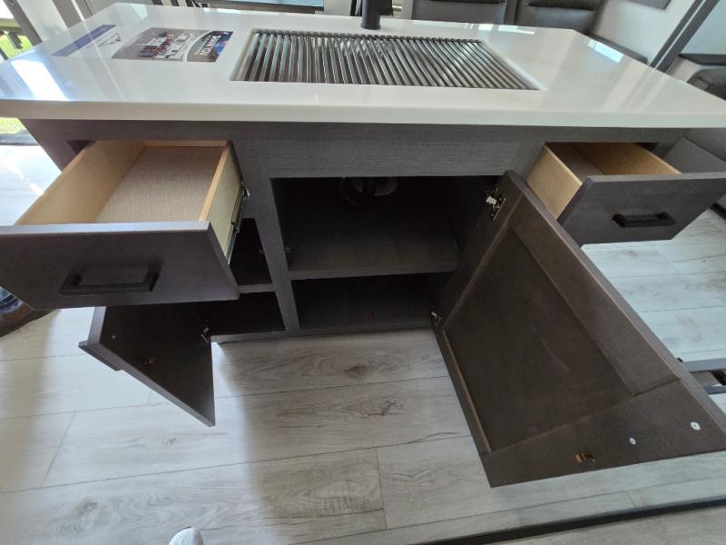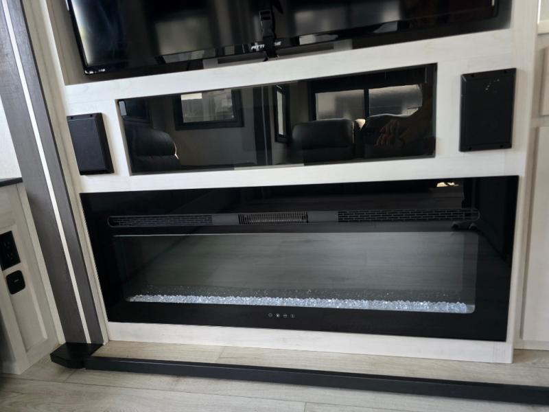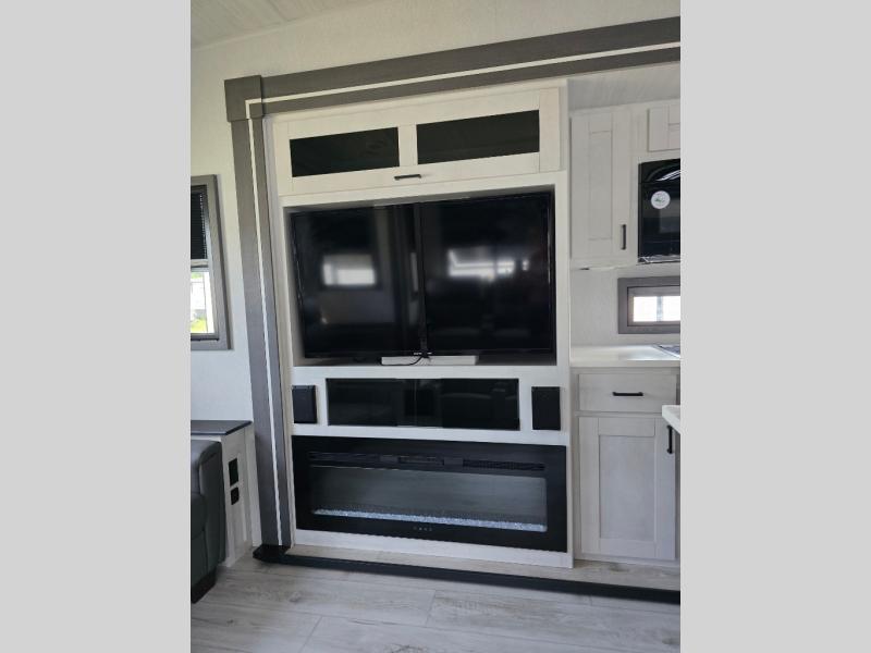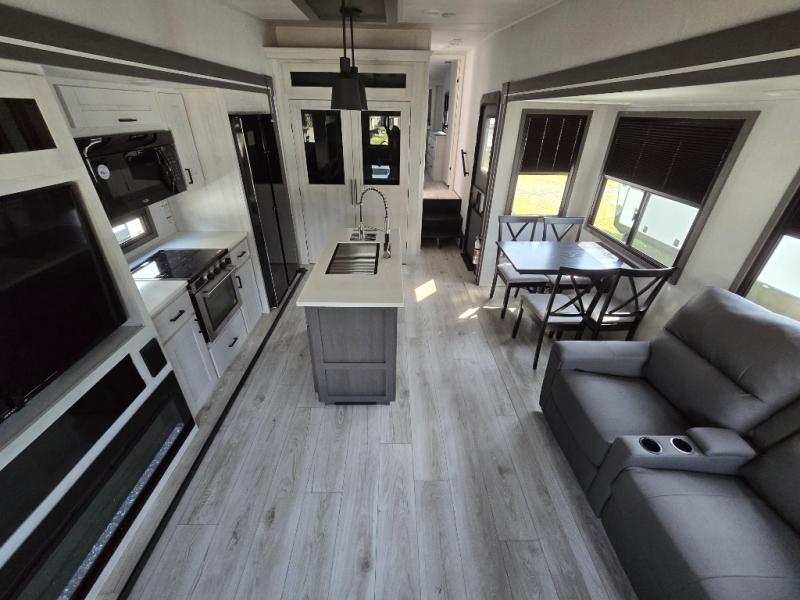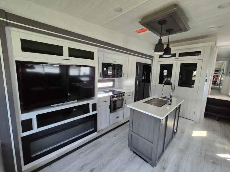 Take this Tandara fifth wheel out to the campsite and experience luxury while you camp! You will have a front private bedroom that is quite impressive with its full-width wardrobe, king bed slide with bedside shelves, under-bed storage, and a dresser with a TV prep area. The kitchen island is easy to gather around while you're cooking dinner or enjoying a late-night snack, and the hide-a-bed sofa will be comfortable for lounging or sleeping. As you spend time outside under the two electric awnings, you can grab some extra charcoal or camping chairs from the oversized pass-through storage.