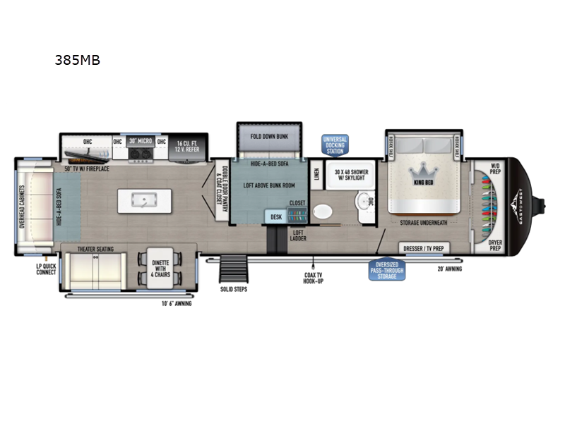 Use this Tandara fifth wheel for the grandest adventures with a large group of people! You can fit a total of nine travelers in this unit because there is a king-size bed, two hide-a-bed sofas, a fold-down bunk, and a loft for sleeping. Additionally, the opposing slides in the main living area give you more space for all of these people to sit down and chat or gather around the kitchen island. The 16 cu. ft. 12V refrigerator can store anything your group will need to stay fed throughout your trip, and the four-burner range can cook up that food with plenty of ease. On the exterior, there is an oversized pass-through storage compartment that can be used when you want to bring along beach umbrellas, picnic blankets, and outdoor games, and the electric awning offers protection from the sun while you relax outside.