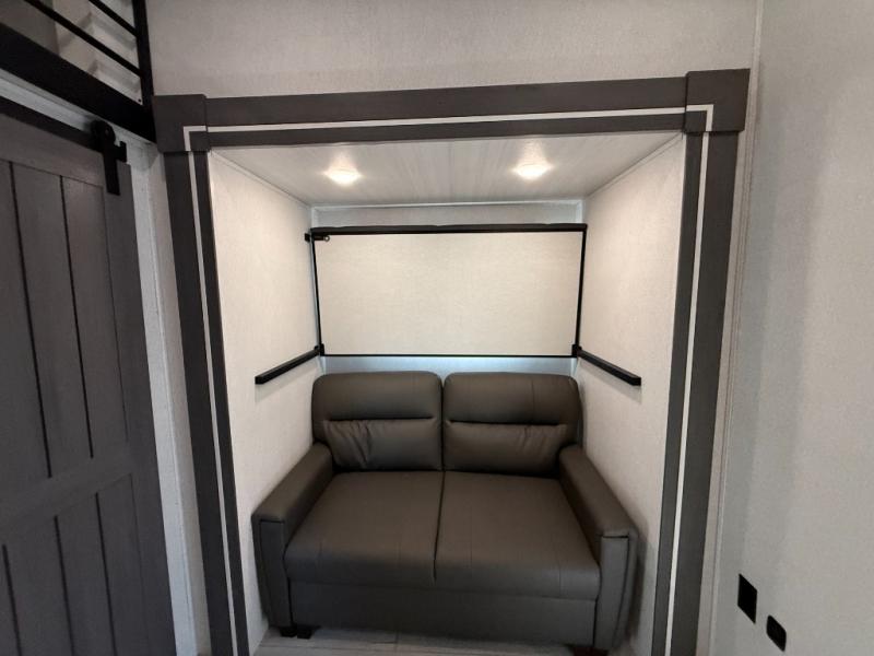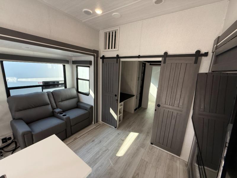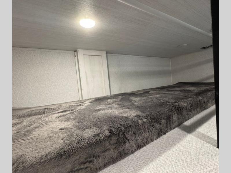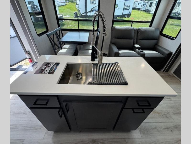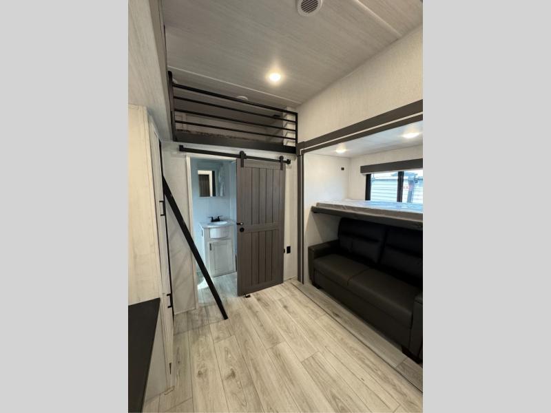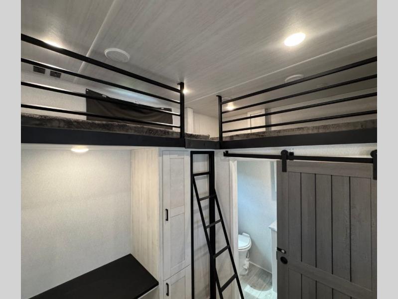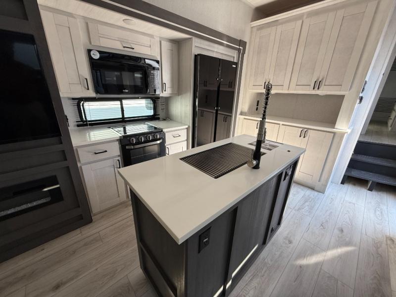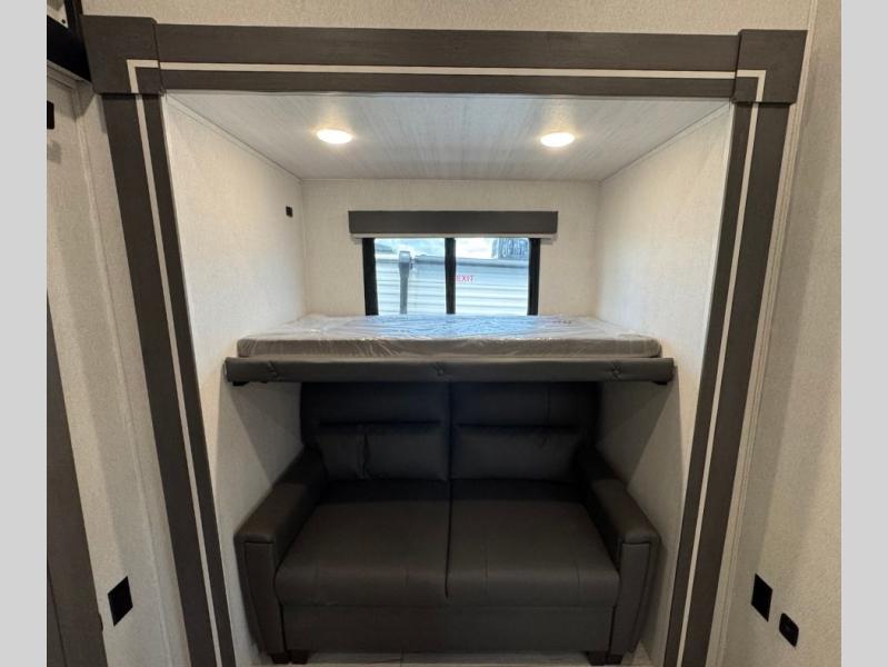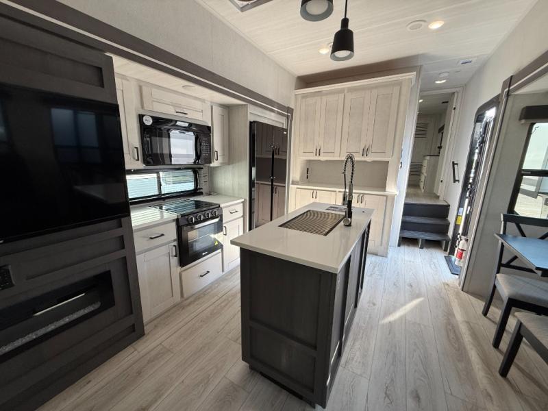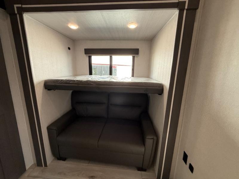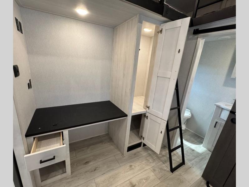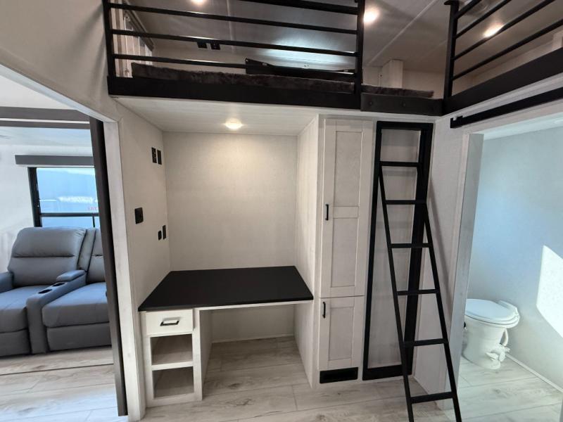 This is the perfect fifth wheel if you enjoy bringing along extra friends and family! You'll have the front private bedroom all to yourselves with a king bed slide out, a dresser with TV prep, plus a large closet with washer and dryer prep. And a full bath is right next door for easy use. Your guests will love the rear bunkhouse suite with an EZ-out sofa and fold-down bunk, a desk with a chair, plus a closet for their things. There is also a full rear bath with its own exterior entry door and a loft area with two bunks plus cabinets. In the morning, you can all meet in the combined kitchen and living area that includes dual opposing slides for more space, a kitchen island, and a pantry with a coffee station where you can set up your own Keurig machine. There is also theater seating in direct view of the 50" TV and fireplace, along with a dinette with four chairs where you can dine together.
