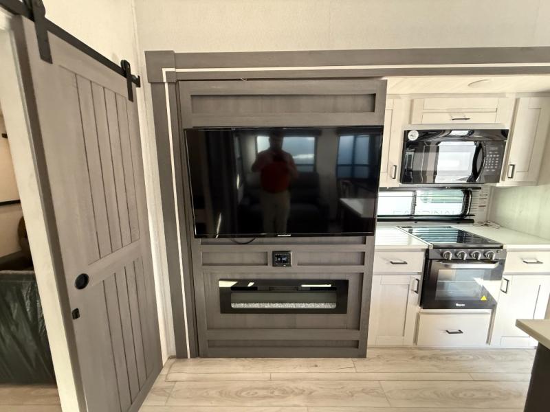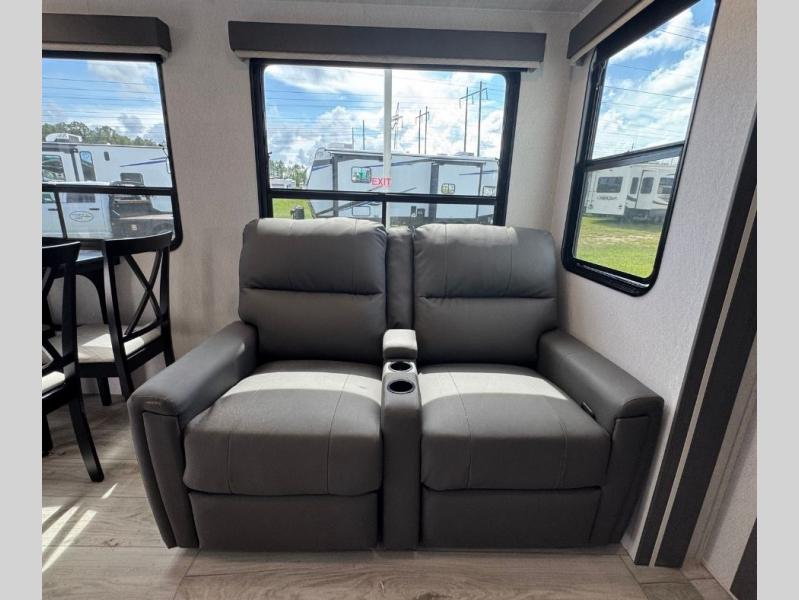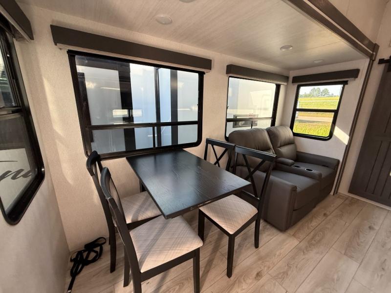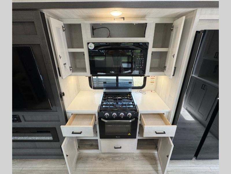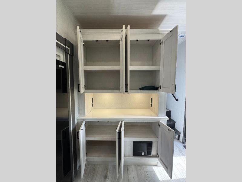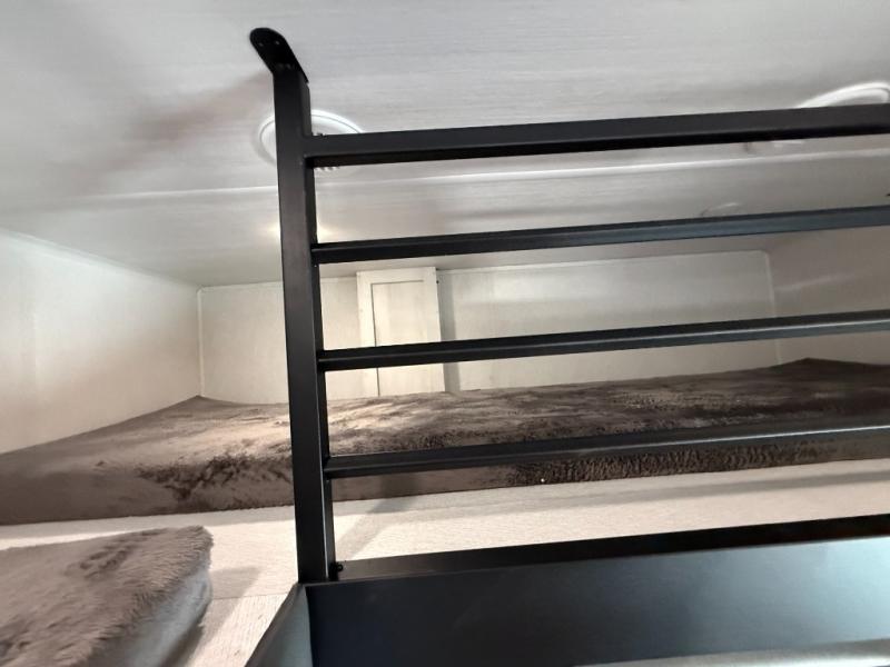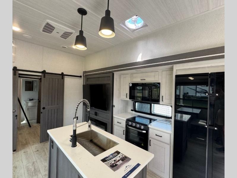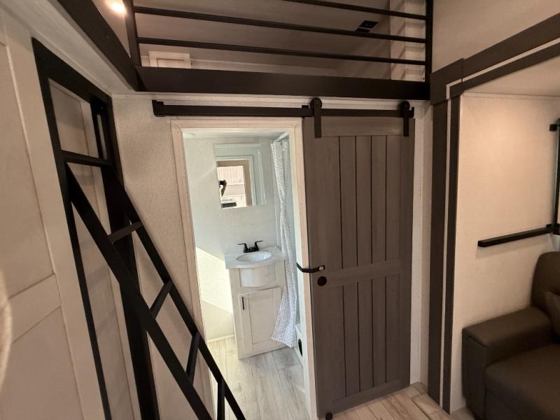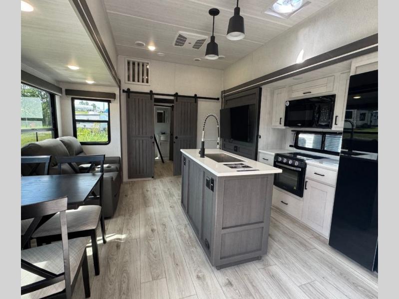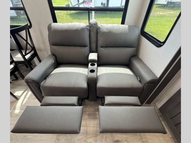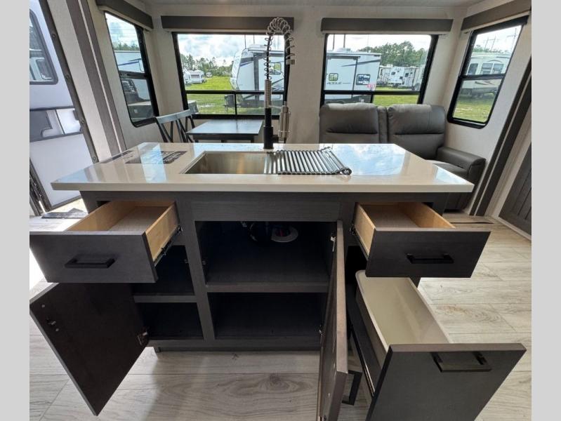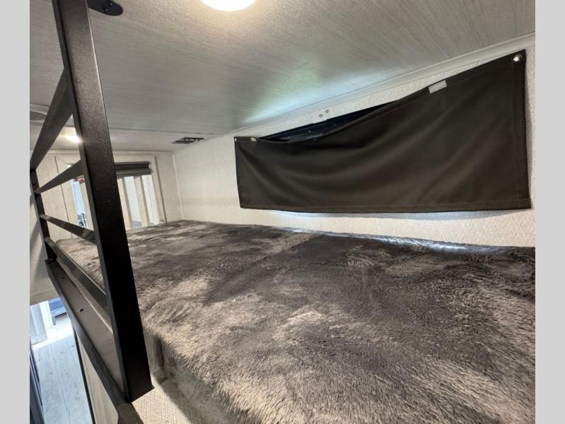 This is the perfect fifth wheel if you enjoy bringing along extra friends and family! You'll have the front private bedroom all to yourselves with a king bed slide out, a dresser with TV prep, plus a large closet with washer and dryer prep. And a full bath is right next door for easy use. Your guests will love the rear bunkhouse suite with an EZ-out sofa and fold-down bunk, a desk with a chair, plus a closet for their things. There is also a full rear bath with its own exterior entry door and a loft area with two bunks plus cabinets. In the morning, you can all meet in the combined kitchen and living area that includes dual opposing slides for more space, a kitchen island, and a pantry with a coffee station where you can set up your own Keurig machine. There is also theater seating in direct view of the 50" TV and fireplace, along with a dinette with four chairs where you can dine together.