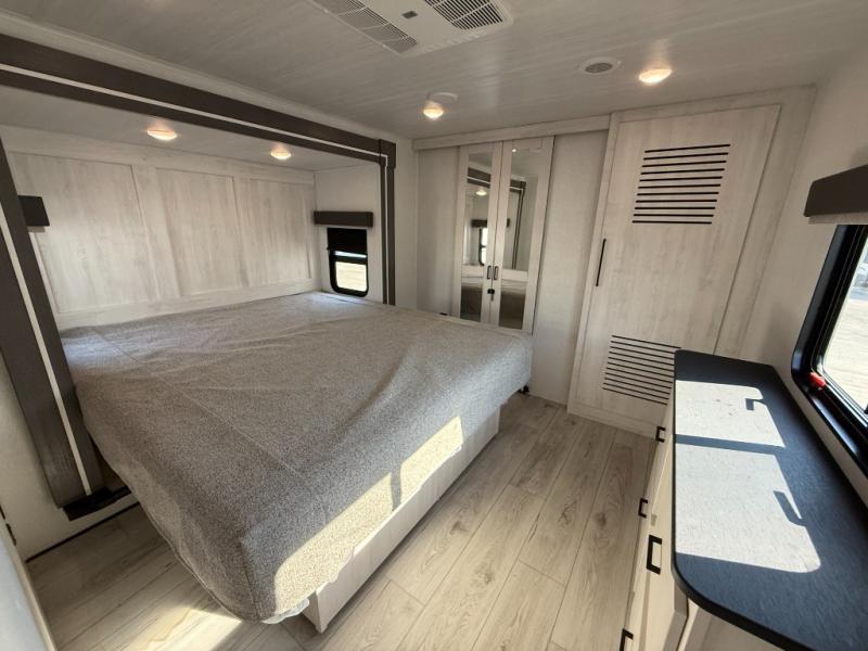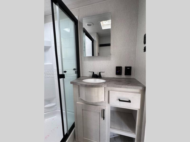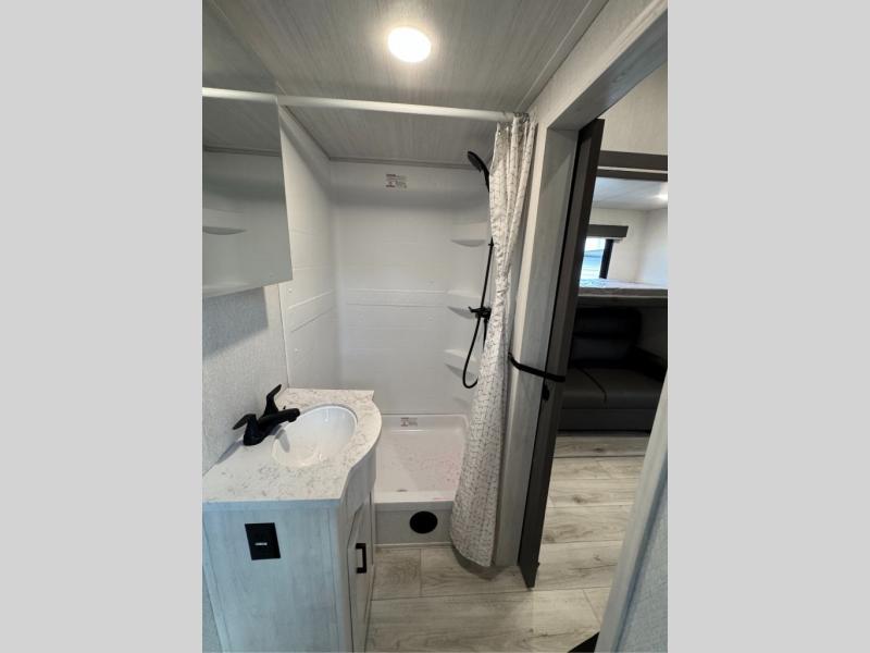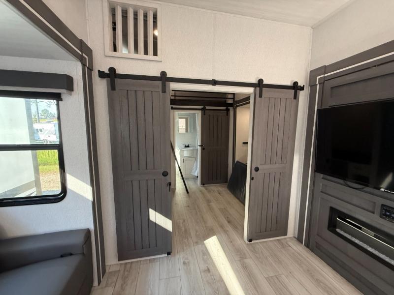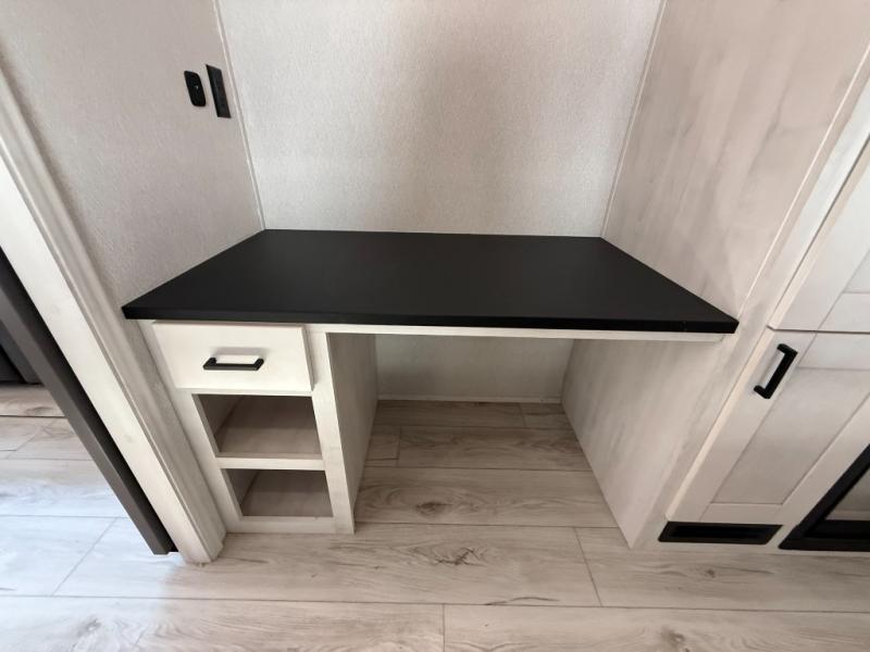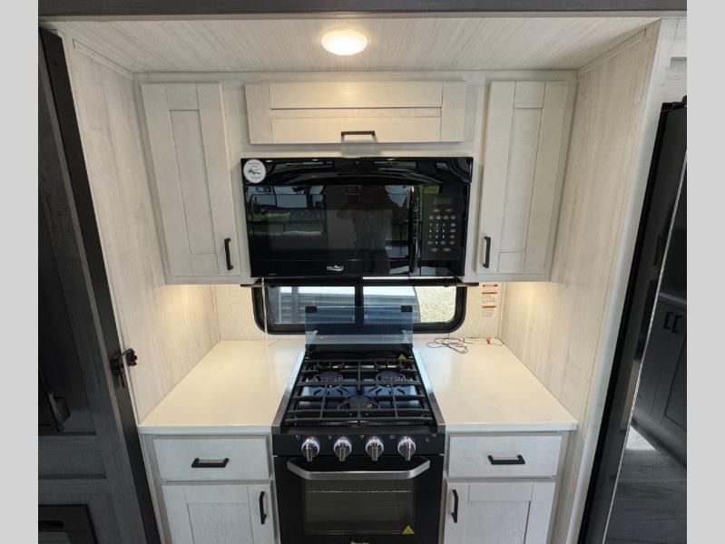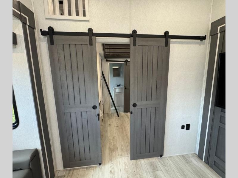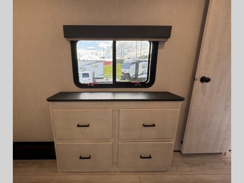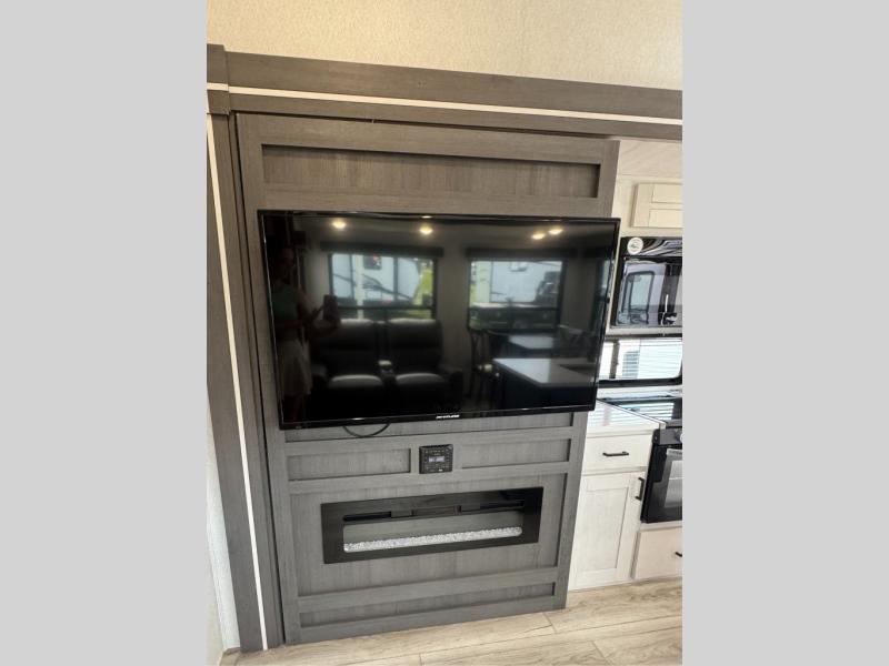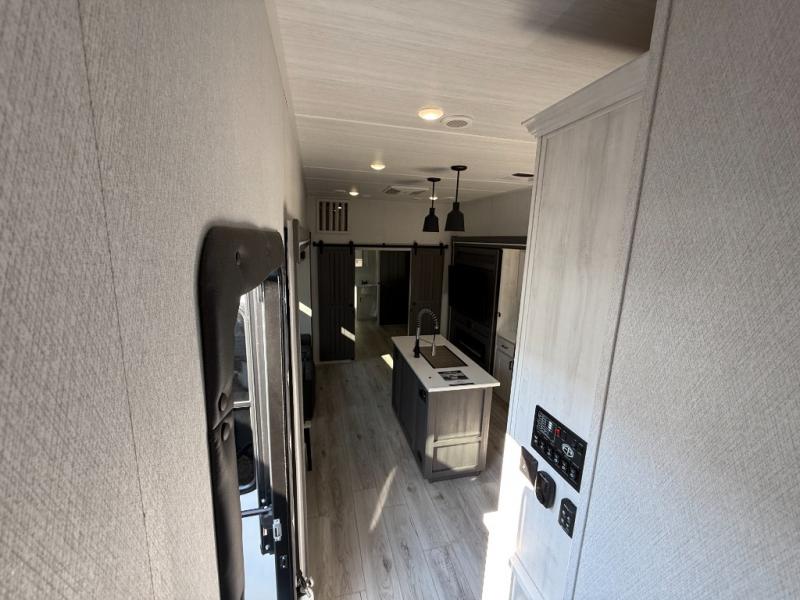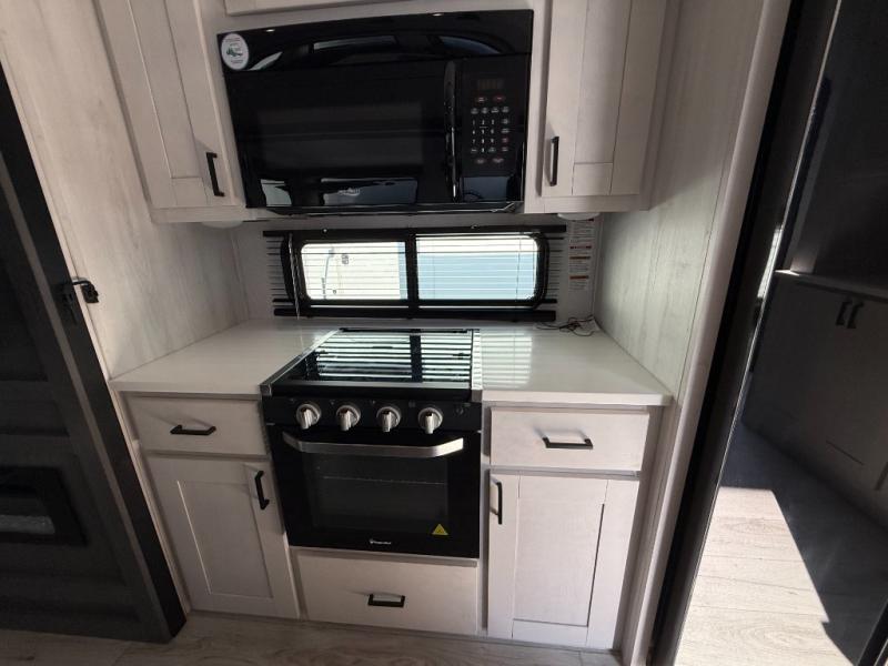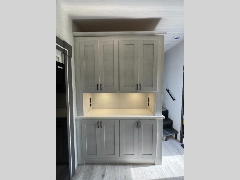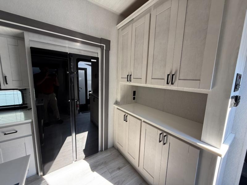 This is the perfect fifth wheel if you enjoy bringing along extra friends and family! You'll have the front private bedroom all to yourselves with a king bed slide out, a dresser with TV prep, plus a large closet with washer and dryer prep. And a full bath is right next door for easy use. Your guests will love the rear bunkhouse suite with an EZ-out sofa and fold-down bunk, a desk with a chair, plus a closet for their things. There is also a full rear bath with its own exterior entry door and a loft area with two bunks plus cabinets. In the morning, you can all meet in the combined kitchen and living area that includes dual opposing slides for more space, a kitchen island, and a pantry with a coffee station where you can set up your own Keurig machine. There is also theater seating in direct view of the 50" TV and fireplace, along with a dinette with four chairs where you can dine together.