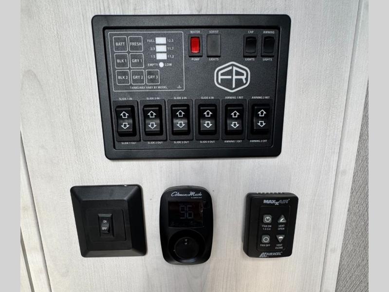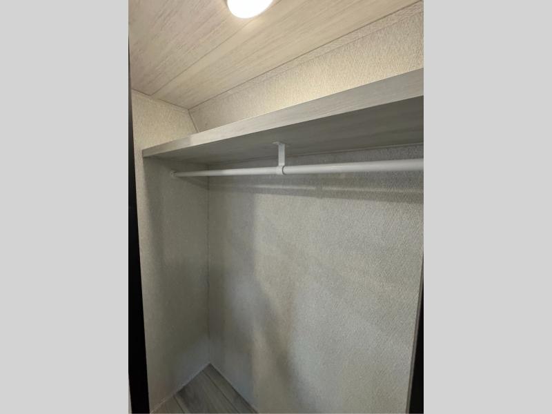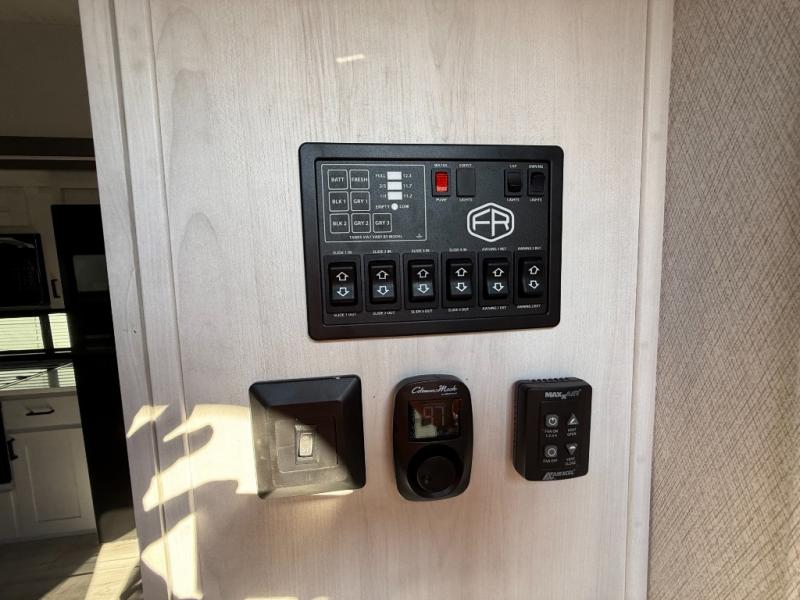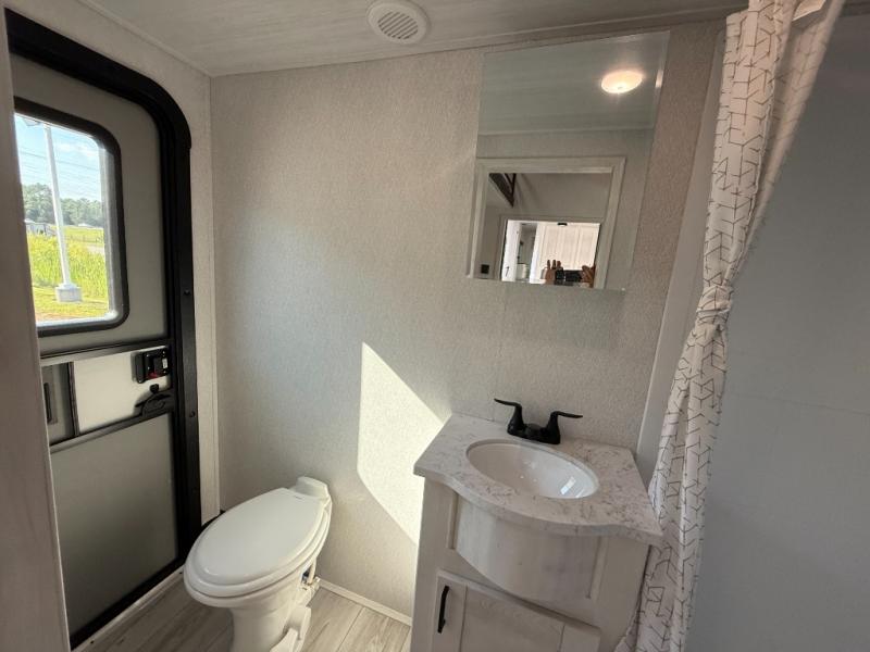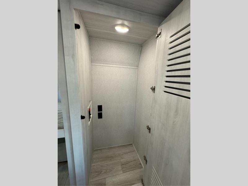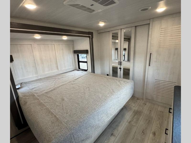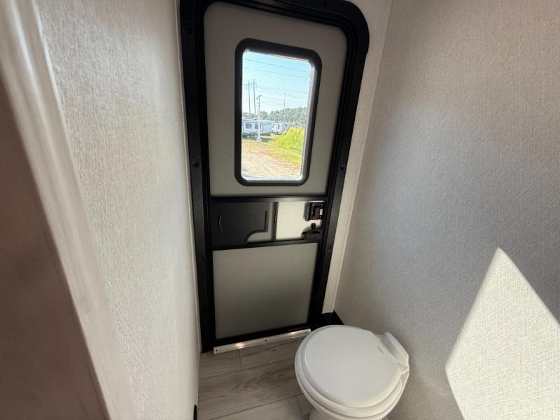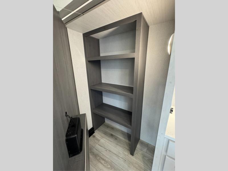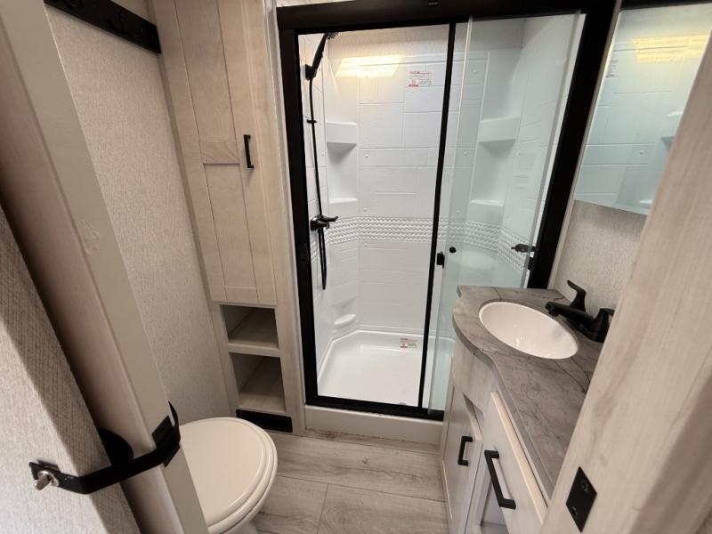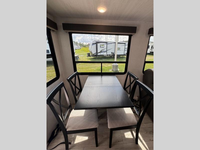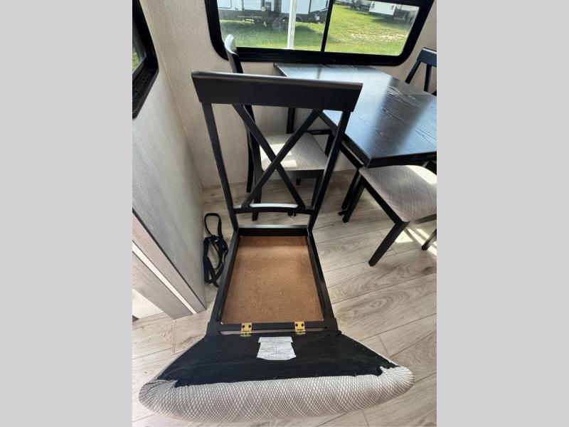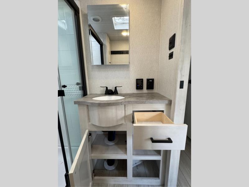 This is the perfect fifth wheel if you enjoy bringing along extra friends and family! You'll have the front private bedroom all to yourselves with a king bed slide out, a dresser with TV prep, plus a large closet with washer and dryer prep. And a full bath is right next door for easy use. Your guests will love the rear bunkhouse suite with an EZ-out sofa and fold-down bunk, a desk with a chair, plus a closet for their things. There is also a full rear bath with its own exterior entry door and a loft area with two bunks plus cabinets. In the morning, you can all meet in the combined kitchen and living area that includes dual opposing slides for more space, a kitchen island, and a pantry with a coffee station where you can set up your own Keurig machine. There is also theater seating in direct view of the 50" TV and fireplace, along with a dinette with four chairs where you can dine together.