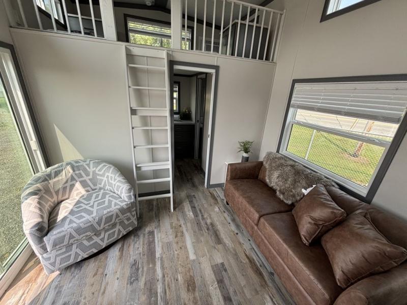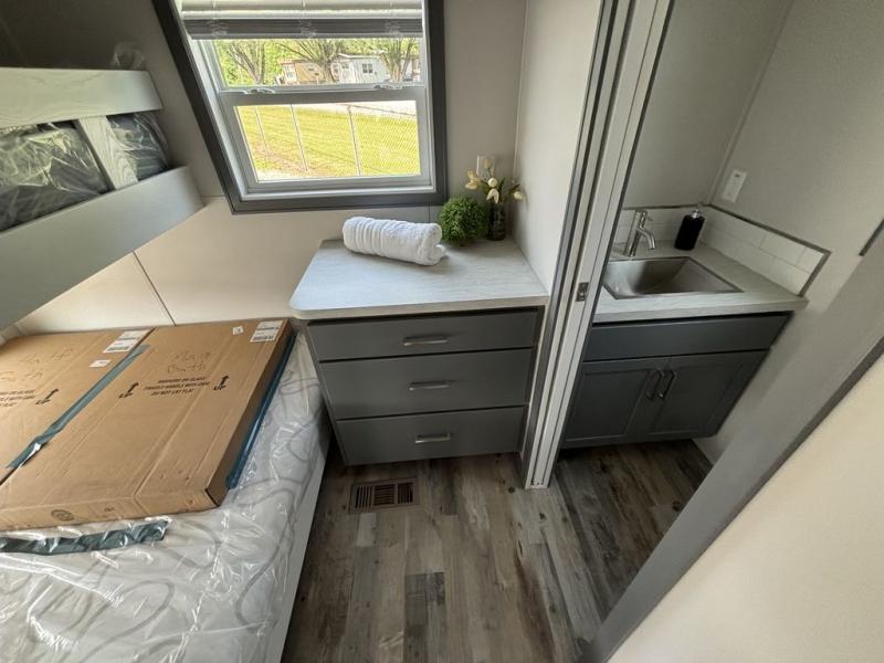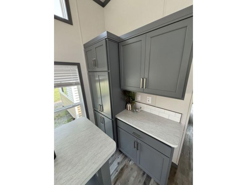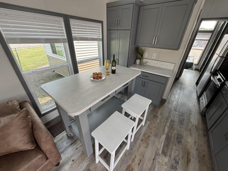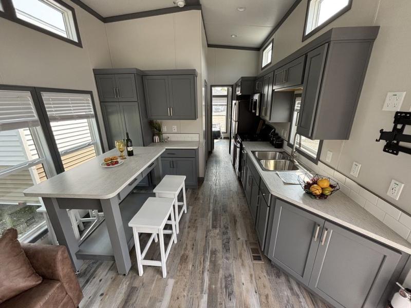Elevation's park models are the home away from home you need! Built with vinyl siding and architectural shingles, these models have a maximum square footage of 400 square feet and they use every bit of space. A 6' vinyl patio door with porch light and shed dormers provide visual interest as well as an open airy feeling. You will appreciate many features like the custom high-end residential cabinetry, GE appliances, cordless blinds, and a ceiling fan in the living room. The standard 43" LG Smart TV provides entertainment, while USB outlets throughout offer an easy place to charge your electronics. Each unit can be customized with a wide variety of colors, window designs, bathroom layouts, and other personalized modifications to the floorplan.