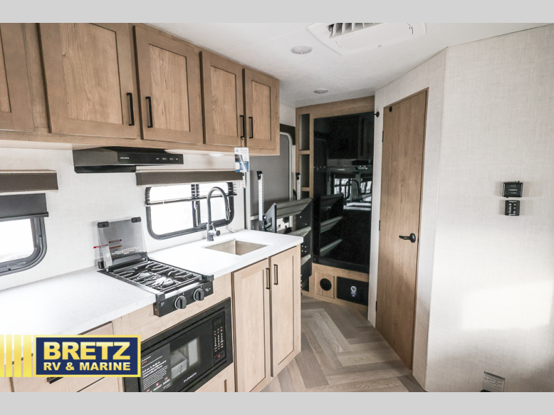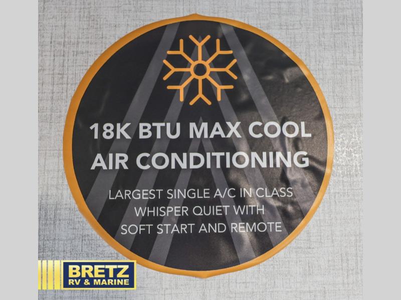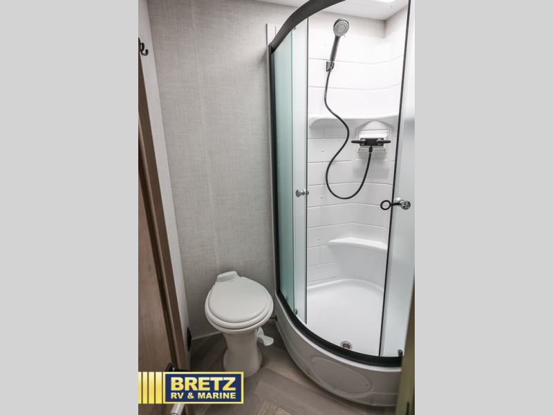 Time at the campground in this travel trailer will be time well spent. Once you arrive at your destination, you can put out the 14' electric awning, unpack the pass-through storage, then head inside for lunch. There is an air fryer convection microwave plus a dual burner cooktop to make meals each day, and the 10 cu. ft. 12V refrigerator will keep your food fresh. A legless dinette slide provides a place to dine together and even let a guest sleep over. If you're not needing the extra sleeping space, just choose the optional theater seating! You'll find the front queen bed will give you a great night's rest, and there is a full bath on board that will allow you to freshen up each morning.