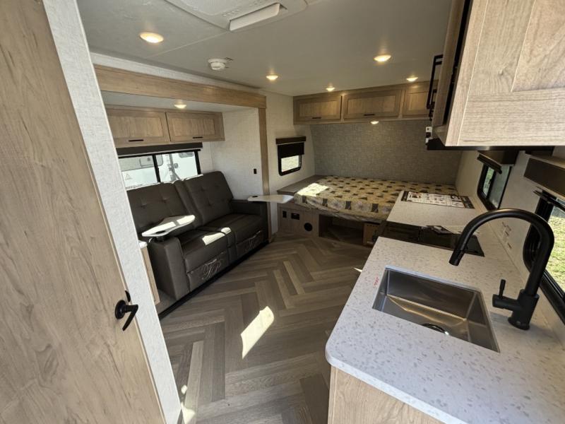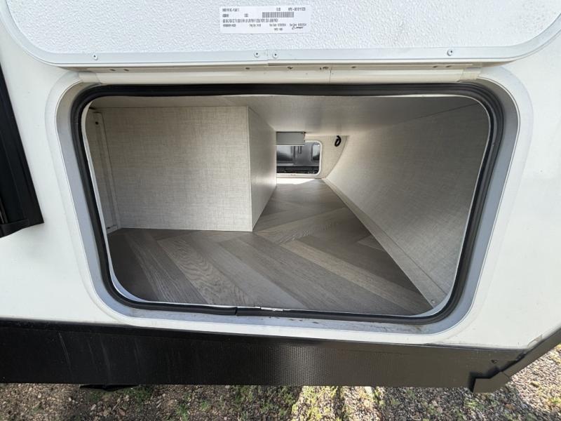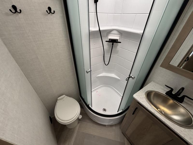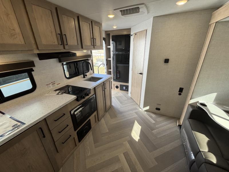Time at the campground in this travel trailer will be time well spent. Once you arrive at your destination, you can put out the 14' electric awning, unpack the pass-through storage, then head inside for lunch. There is an air fryer convection microwave plus a dual burner cooktop to make meals each day, and the 10 cu. ft. 12V refrigerator will keep your food fresh. A legless dinette slide provides a place to dine together and even let a guest sleep over. If you're not needing the extra sleeping space, just choose the optional theater seating! You'll find the front queen bed will give you a great night's rest, and there is a full bath on board that will allow you to freshen up each morning.