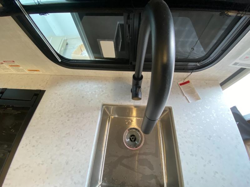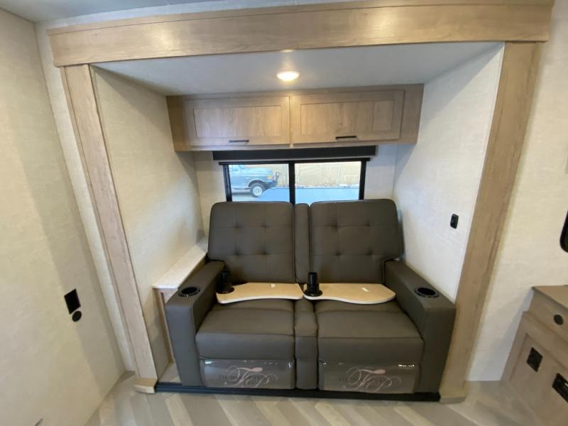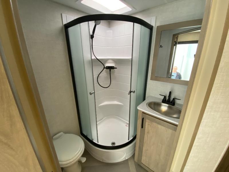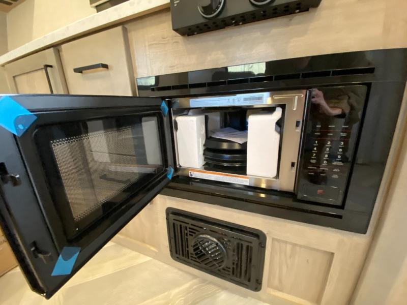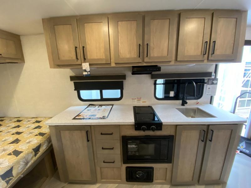 Time at the campground in this travel trailer will be time well spent. Once you arrive at your destination, you can put out the 14' electric awning, unpack the pass-through storage, then head inside for lunch. There is an air fryer convection microwave plus a dual burner cooktop to make meals each day, and the 10 cu. ft. 12V refrigerator will keep your food fresh. A legless dinette slide provides a place to dine together and even let a guest sleep over. If you're not needing the extra sleeping space, just choose the optional theater seating! You'll find the front queen bed will give you a great night's rest, and there is a full bath on board that will allow you to freshen up each morning.