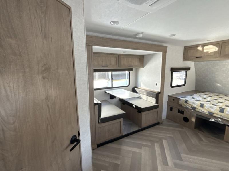 Time at the campground in this travel trailer will be time well spent. Once you arrive at your destination, you can put out the 14' electric awning, unpack the pass-through storage, then head inside for lunch. There is an air fryer convection microwave plus a dual burner cooktop to make meals each day, and the 10 cu. ft. 12V refrigerator will keep your food fresh. A legless dinette slide provides a place to dine together and even let a guest sleep over. If you're not needing the extra sleeping space, just choose the optional theater seating! You'll find the front queen bed will give you a great night's rest, and there is a full bath on board that will allow you to freshen up each morning.